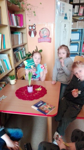 WIELKIE CZYTANIE – to seanse dwudziestominutowego głośnego czytania. Bajki i wiersze czytała bibliotekarka, do akcji głośnego czytania dzieciom przyłączyli się także starsi uczniowie. Uczestnicy spotkań obdarowani zostali okolicznościowymi upominkami.