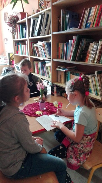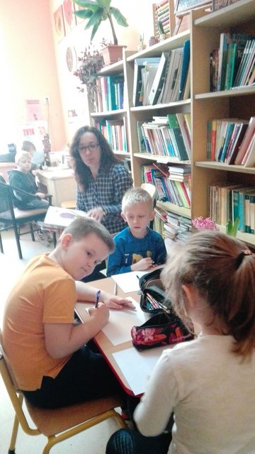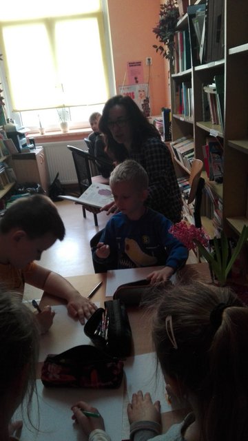 MIĘDZY SŁOWAMI - to propozycja czytelnicza adresowana do uczniów pierwszej klasy szkoły podstawowej. Na spotkanie, które odbyło się 28 .02.2017 r. wybraliśmy książki ascetyczne w słowa i obraz, ale jednocześnie bogate w znaczenie i treść. Uczestnicy literackiej przygody dowiedzieli się, że nie zawsze o sprawach ważnych trzeba opowiadać wprost, bo często najważniejsze jest niewidoczne dla oczu. Podczas trwania akcji „Cała Polska Czyta Dzieciom” w bibliotece dostępne były ulotki reklamujące kampanię społeczną Fundacji ABCXXI. Wyeksponowane zostały także książki, które szczególnie warto przeczytać dzieciom .Pierwszakom czytała nie tylko pani bibliotekarka, ale także pani Ewa Przeor - nauczyciel przyrody. Spotkanie z panią Ewą sprawiło wiele radości zarówno dzieciom jak i pani , która postanowiła pierwszaków wprowadzać w kanwy nauki o przyrodzie. Czytała dzieciom książki przyrodnicze, a efektem było wykonanie przez uczniów pięknych ilustracji (konkretnie roślin mini - kaktusów ulubionych przez panią Ewę) . Dziękujemy!