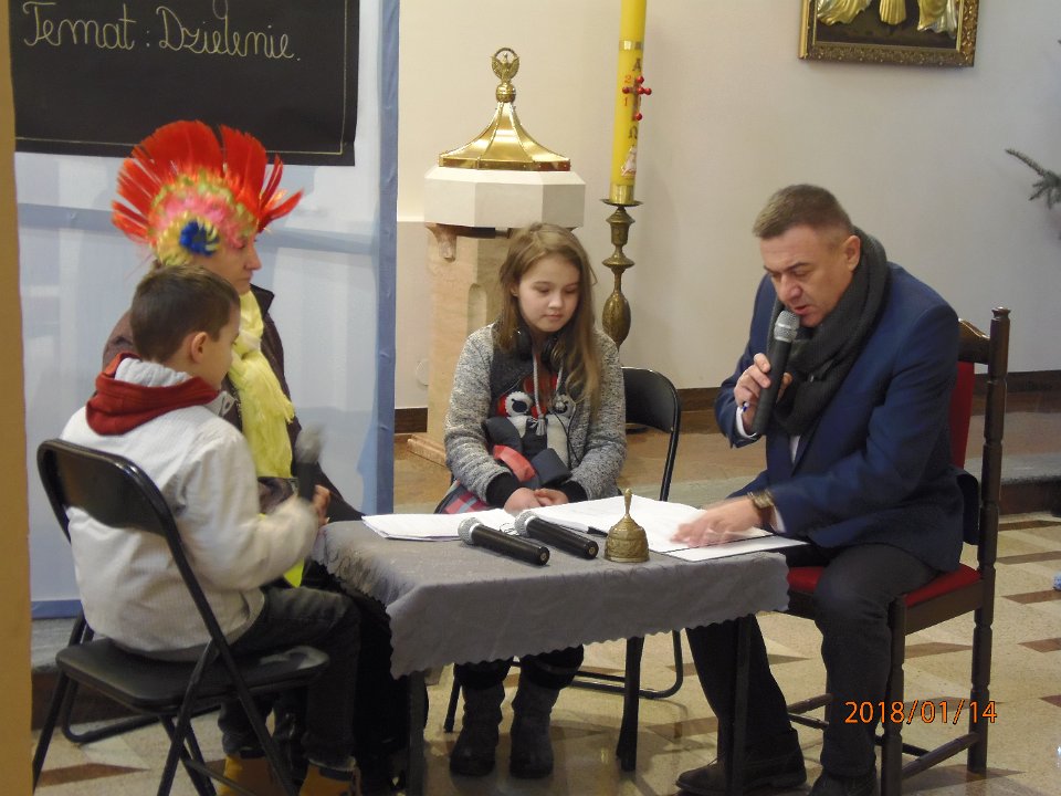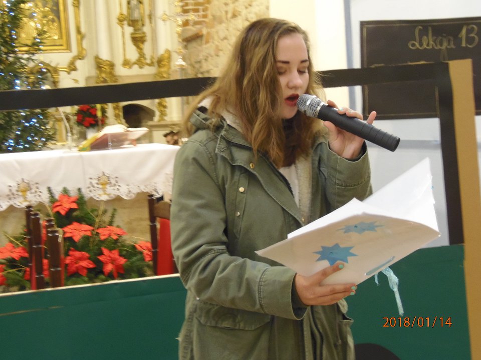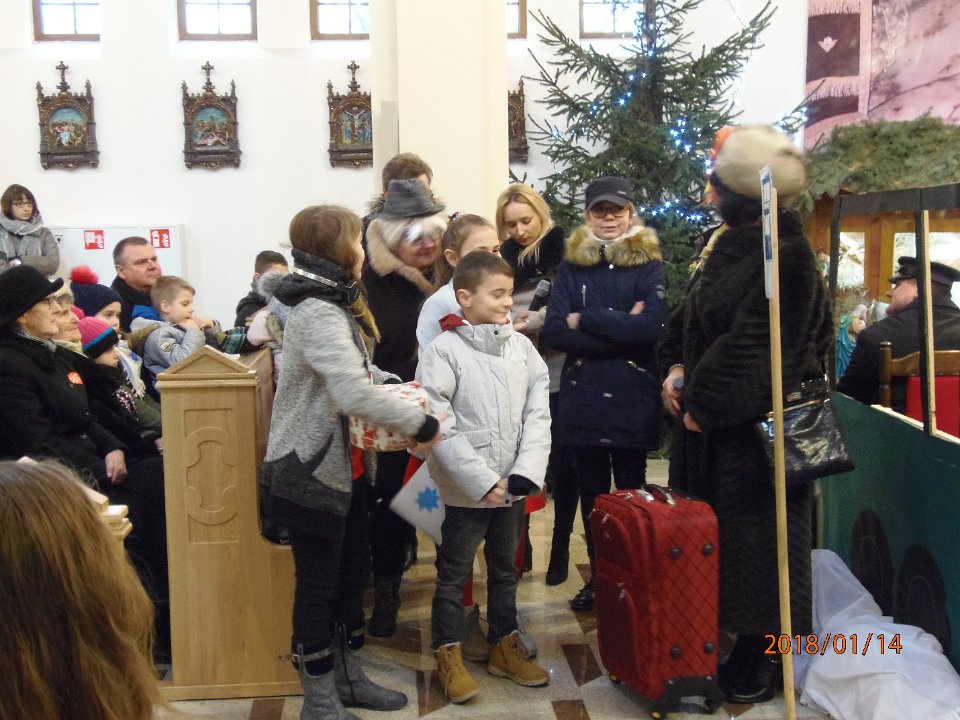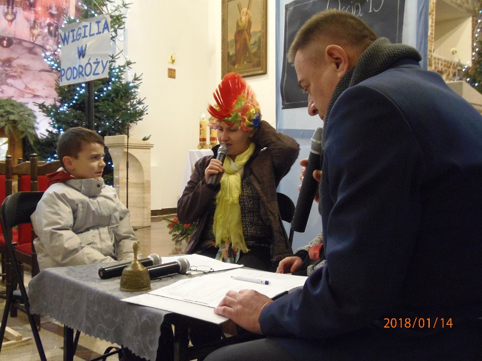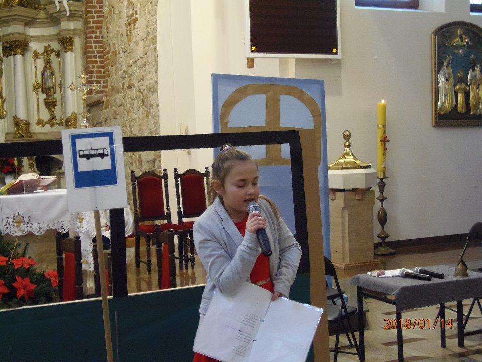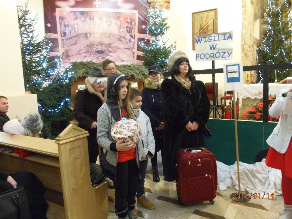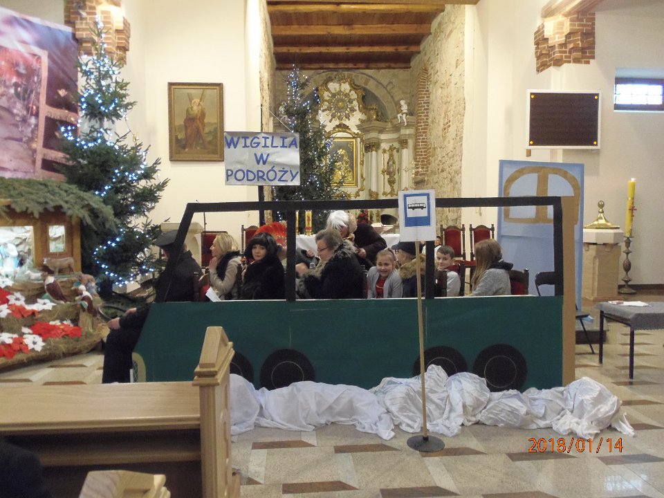 Tradycyjnie, jak co roku, koło teatralne z naszej szkoły zostało zaproszone przez księdza proboszcza Tomasza Jenera do kościoła, aby zaprezentować parafianom z Kościelca swoje przedstawienie bożonarodzeniowe. W bieżącym roku społeczność Szkoły Podstawowej w Trzęśniewie /uczniowie, rodzice, nauczyciele i dyrektor/ wystawiła spektakl „Wigilia w podróży”. Artyści poprzez swój występ przypomnieli nastrój świąt Bożego Narodzenia. Pasażerowie autobusu wyjmują zapasy. Dotychczas obcy sobie i mało życzliwi ludzie otwierają serca na drugich. Niespodziewana sytuacja sprawiła, że popatrzyli na siebie innym wzrokiem. Puentą przedstawienia jest dojście do wniosku, że „ludzie potrafią być dobrzy, ale trzeba im czasem o tym przypomnieć”.