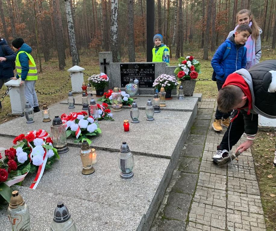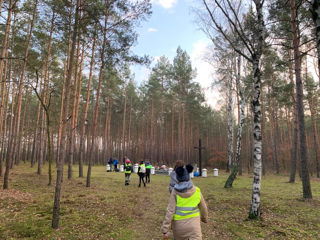 Na mogile zamordowanych w czasie II wojny światowej ludzi, zapaliliśmy znicze zebrane w szkole przez Wolontariat. Usunęliśmy leżące liście i pozamiataliśmy.
