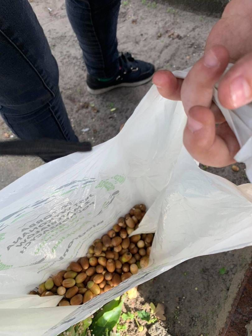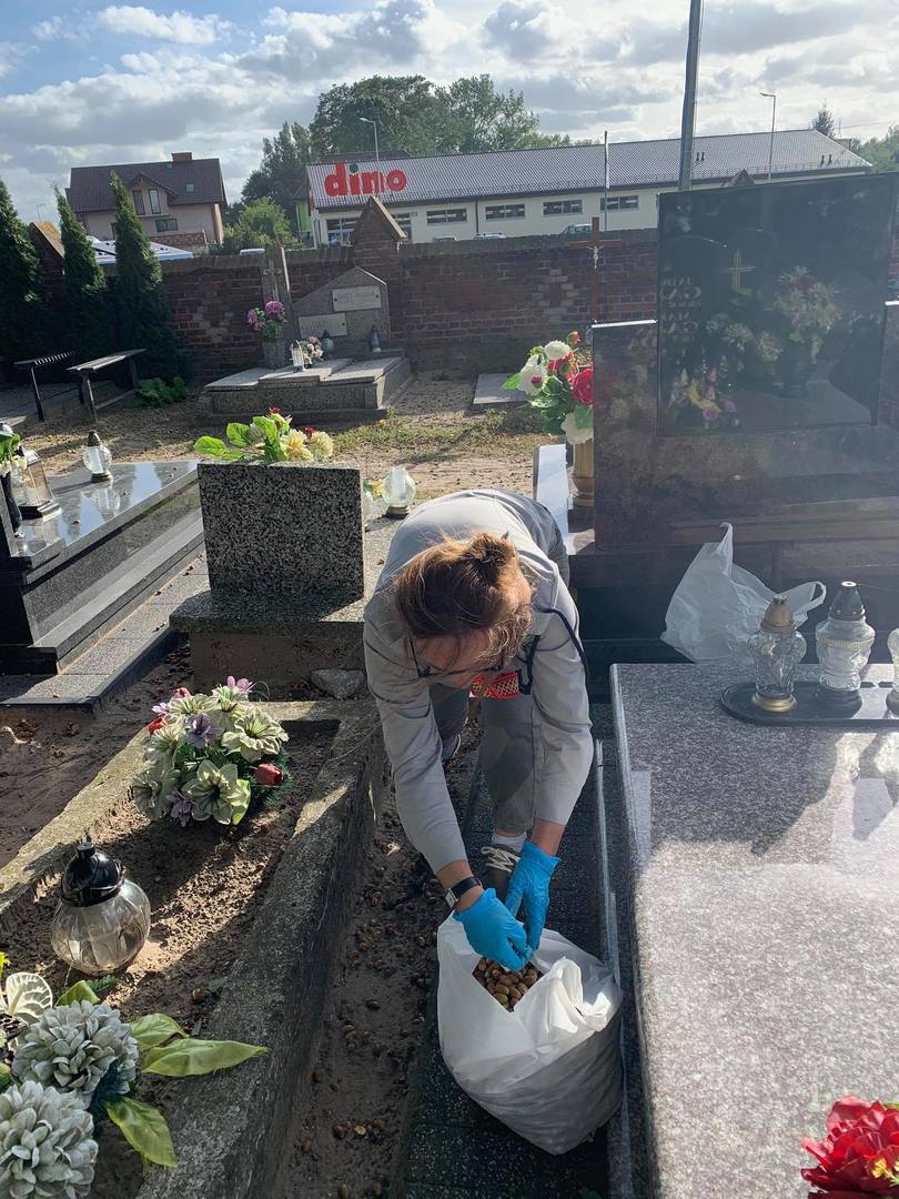 A tymczasem szukając możliwości zarobkowych na naszą miarę, postanowiliśmy wykorzystać to, co dała nam przyroda. Słonecznego popołudnia wybraliśmy się na parafialny cmentarz i tam wyzbieraliśmy leżące na ziemi żołędzie i kasztany. Mimo niskiej frekwencji udało nam się zebrać 38 kilogramów owoców dębu i kasztanowca. Owoce zostaną sprzedane do Koła Łowieckiego w Poznaniu ( Nadleśnictwo Konin ) i wzbogacą karmę dla zwierząt w okresie zimowym.