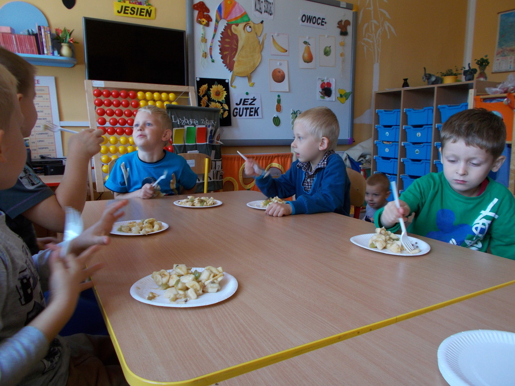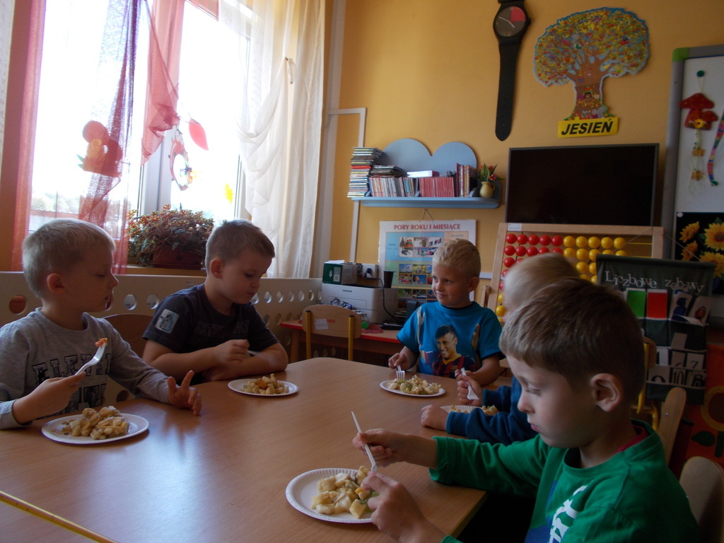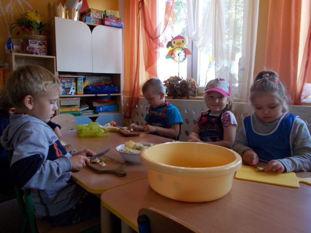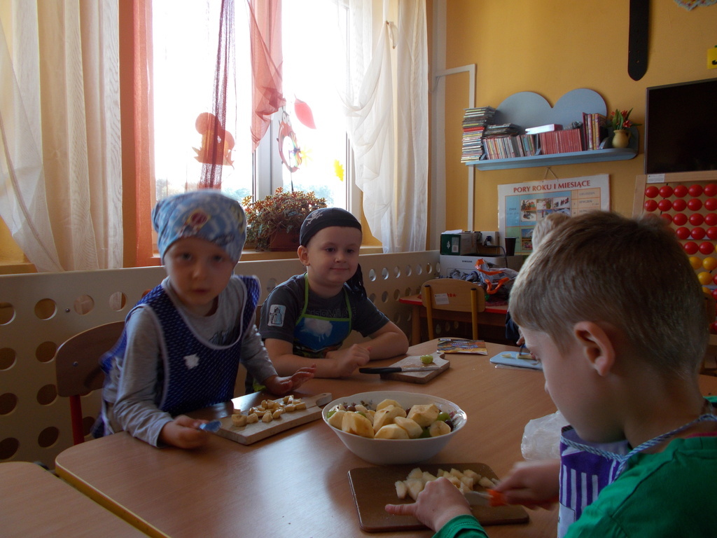 Dzieci z oddziału przedszkolnego rozumieją potrzebę zdrowego odżywiania . W związku powyższym postanowiły wykonać surówkę z owoców. 01.10.2015 r. przedszkolaki przyniosły mnóstwo owoców /krajowe oraz pochodzące z ciepłych krajów/ i przygotowały zdrowe drugie śniadanie. Podczas pracy zastosowały wszelkie zasady higieniczne i bezpieczeństwa. Umyły ręce, założyły fartuszki i chusteczki na głowę oraz bezpiecznie pracowały przy użyciu małych nożyków z zaokrąglonymi czubkami. Na koniec konsumowały swoją potrawę. Bardzo im smakowała! Podczas zajęć towarzyszyły maluchom same pozytywne wrażenia.