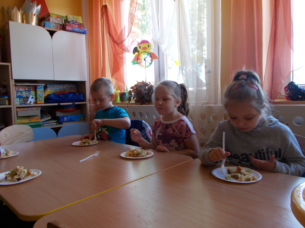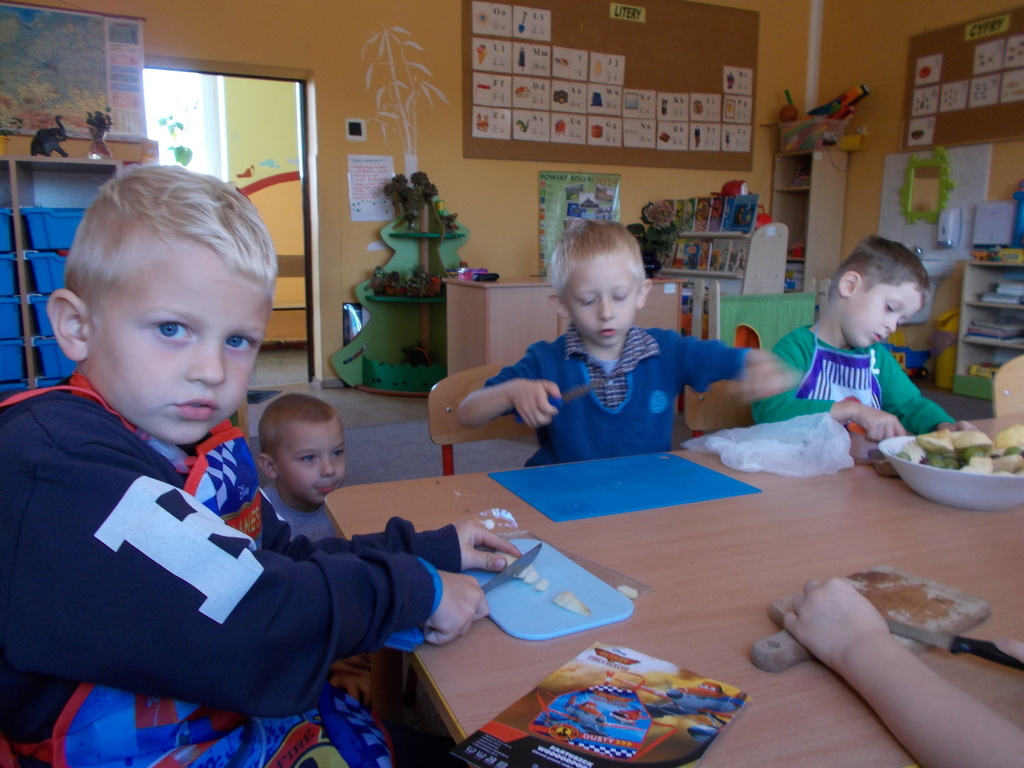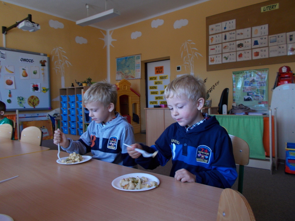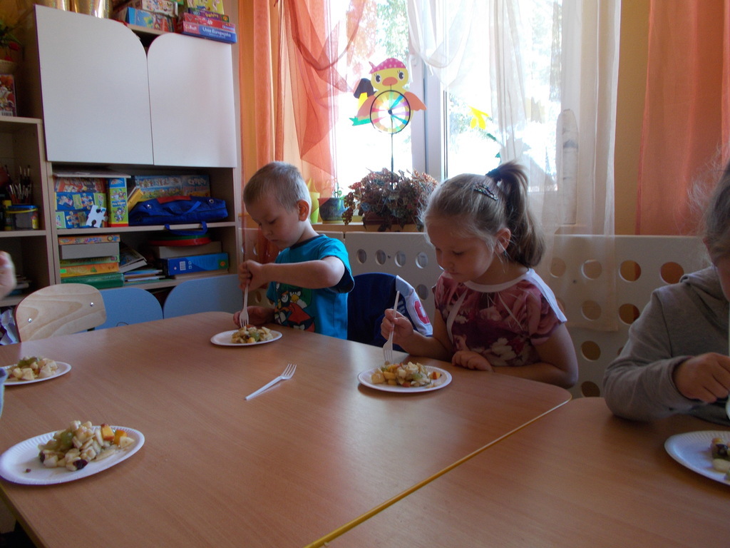 Dzieci z oddziału przedszkolnego rozumieją potrzebę zdrowego odżywiania . W związku powyższym postanowiły wykonać surówkę z owoców. 01.10.2015 r. przedszkolaki przyniosły mnóstwo owoców /krajowe oraz pochodzące z ciepłych krajów/ i przygotowały zdrowe drugie śniadanie. Podczas pracy zastosowały wszelkie zasady higieniczne i bezpieczeństwa. Umyły ręce, założyły fartuszki i chusteczki na głowę oraz bezpiecznie pracowały przy użyciu małych nożyków z zaokrąglonymi czubkami. Na koniec konsumowały swoją potrawę. Bardzo im smakowała! Podczas zajęć towarzyszyły maluchom same pozytywne wrażenia.
