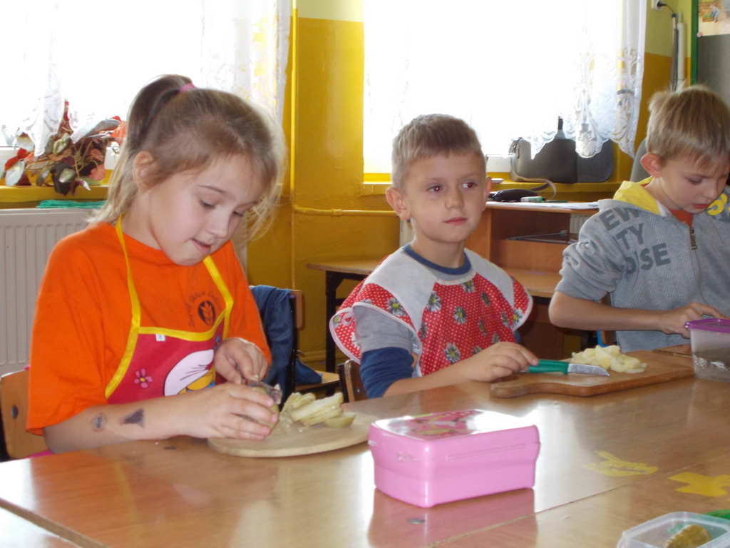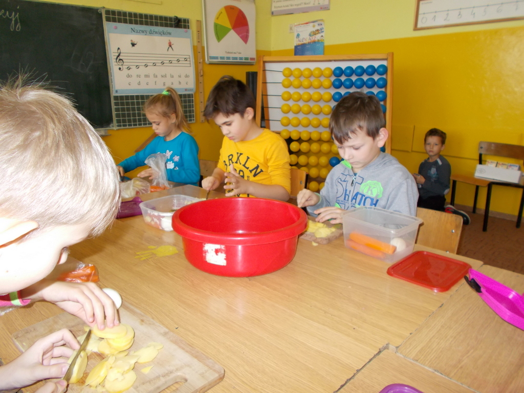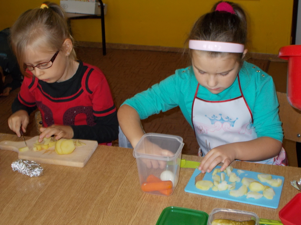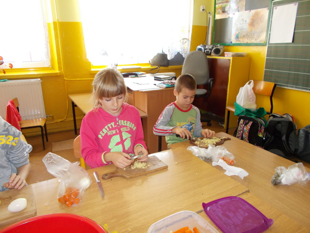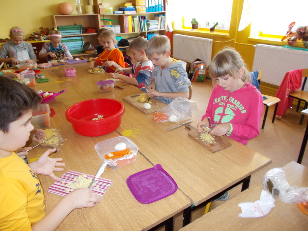Klasa II podczas zajęć „Podróżując po Polsce” poznaje regiony swojego kraju, jego piękno oraz kulinarne przysmaki. Uczniowie wiedzą, że Wielkopolska słynie z potrawy „pyry z gzikiem” oraz rogali św. Marcina. Podhale to smak kwaśnicy i oscypków. Podlasie charakteryzuje się przepysznymi sękaczami. Wymieniać tu można w nieskończoność. Uczniowie pragnąc zmierzyć się z kulinarnymi doznaniami i poczuć przyjemność z własnoręcznie wykonanej sałatki warzywnej z ochotą zabrali się do pracy na podstawie przepisu: