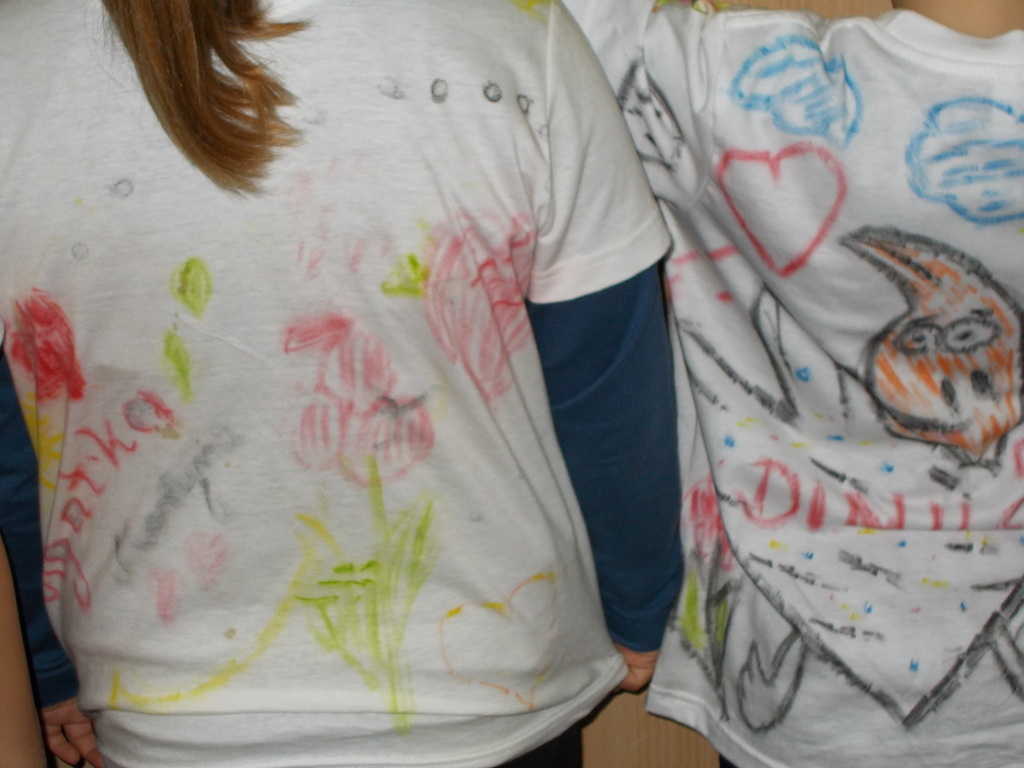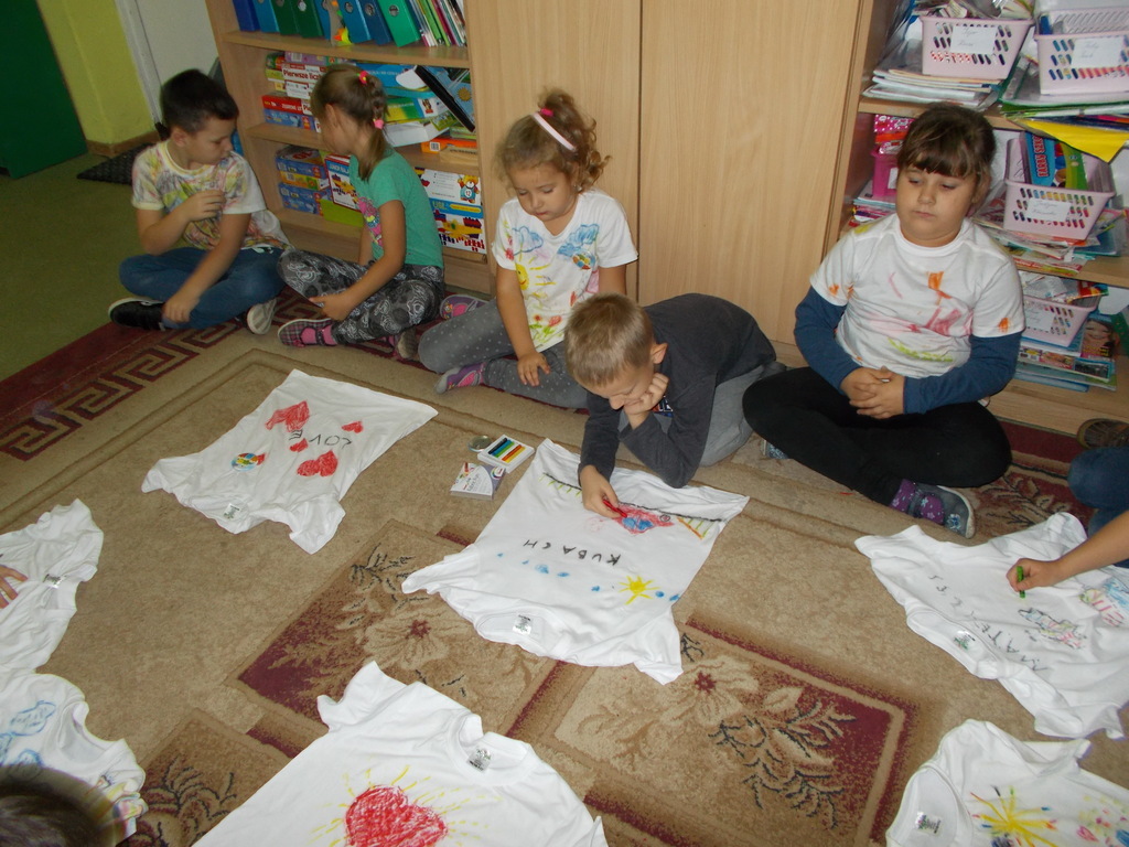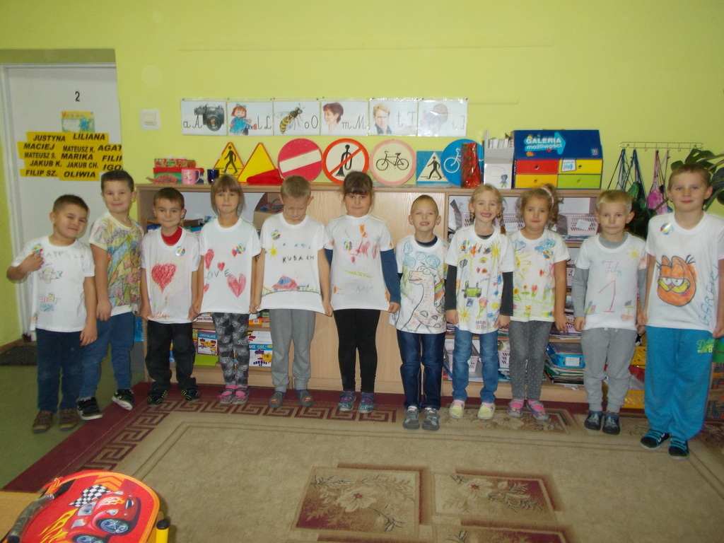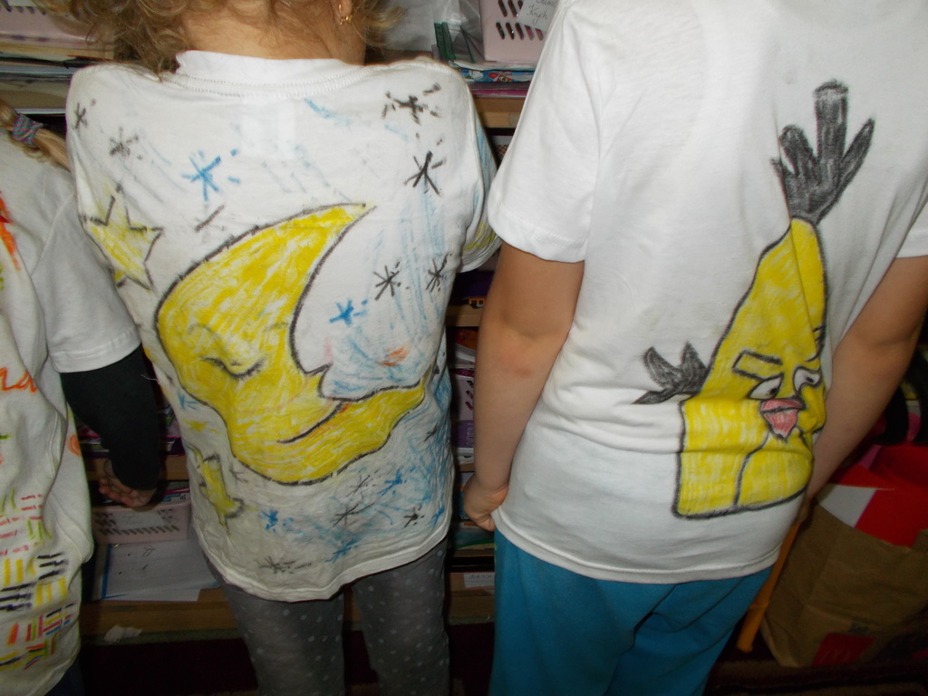 Uczniowie klasy I uwielbiają malować, więc w dniu swojego Ślubowania otrzymali od rodziców prezent - białą koszulkę wraz z pastelami. Mogli oni stworzyć niepowtarzalną i oryginalną koszulkę, jakiej nikt inny nie będzie miał. Na koszulkach pojawiły się postacie z bajek, dinozaury, kwiaty, serca i wiele innych ciekawych rzeczy.