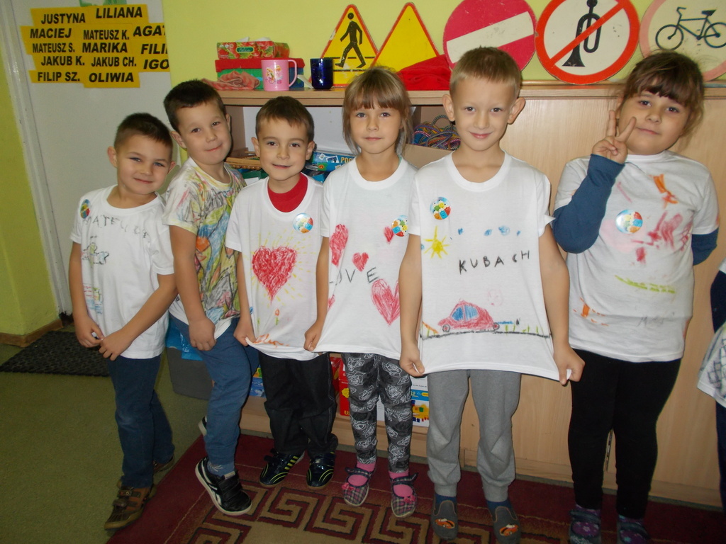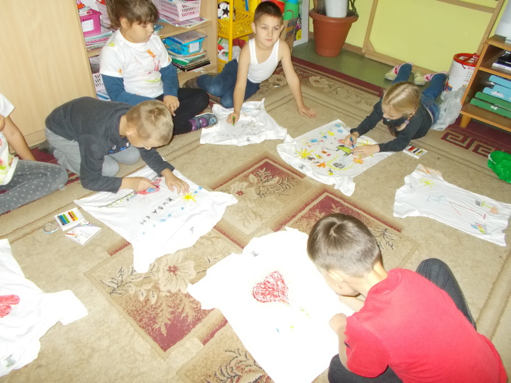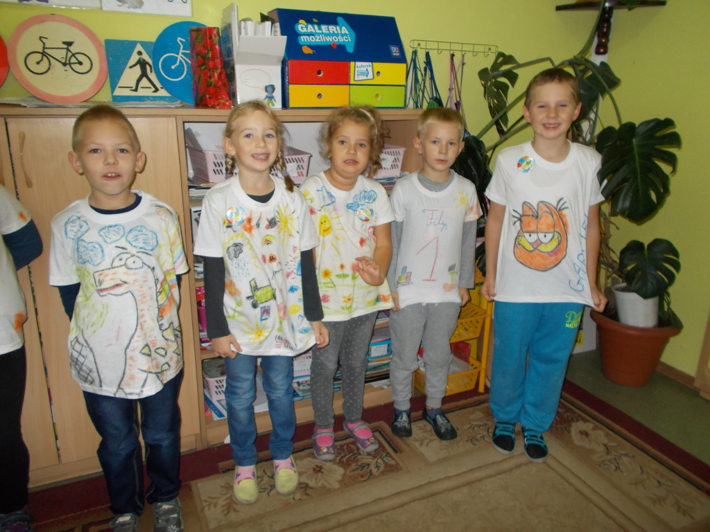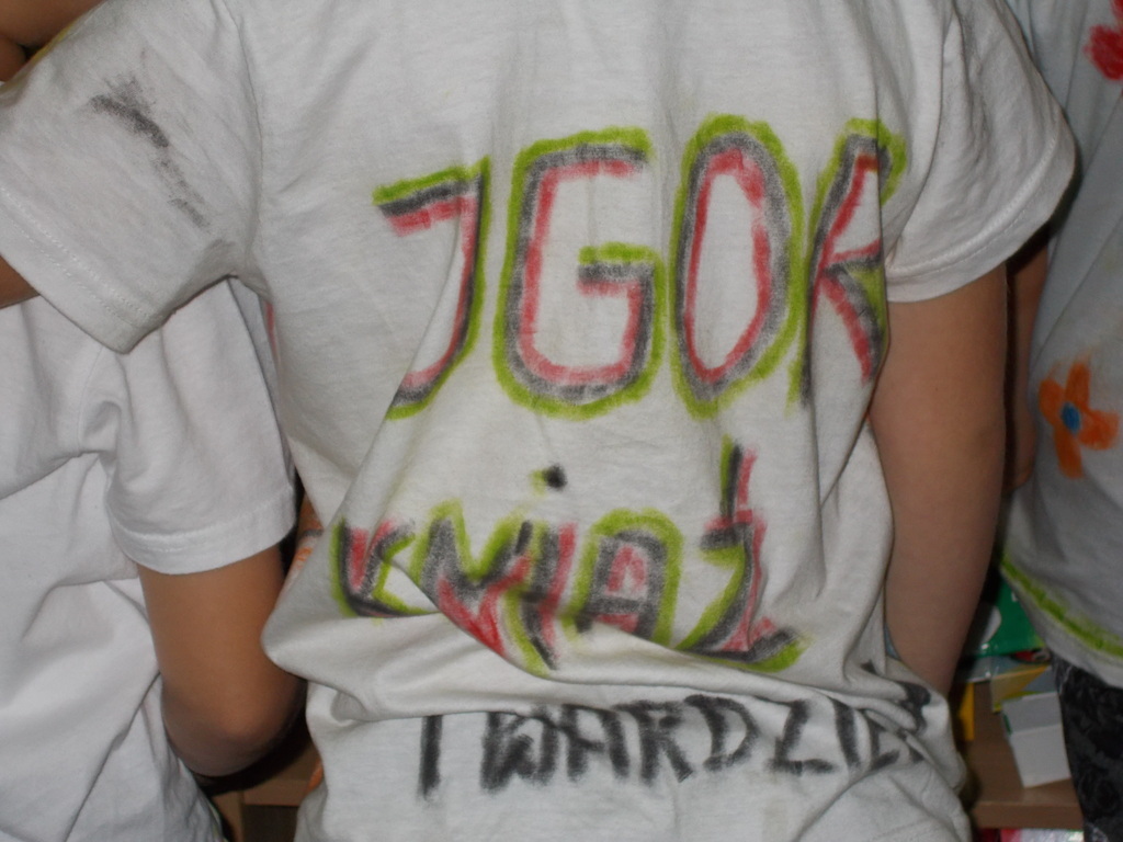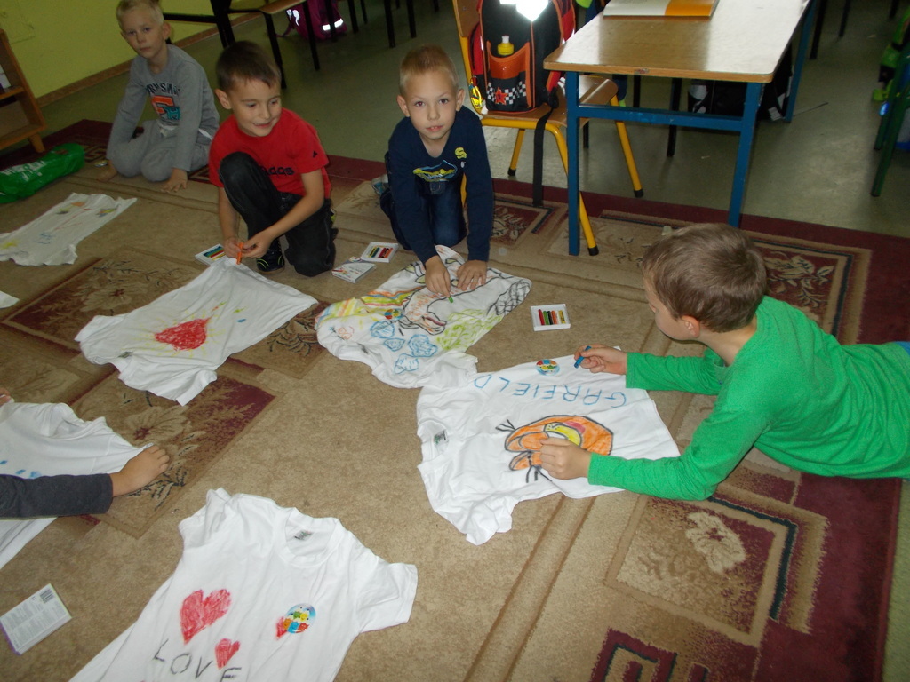 Uczniowie klasy I uwielbiają malować, więc w dniu swojego Ślubowania otrzymali od rodziców prezent - białą koszulkę wraz z pastelami. Mogli oni stworzyć niepowtarzalną i oryginalną koszulkę, jakiej nikt inny nie będzie miał. Na koszulkach pojawiły się postacie z bajek, dinozaury, kwiaty, serca i wiele innych ciekawych rzeczy.