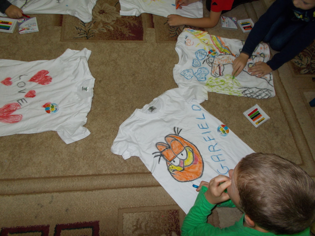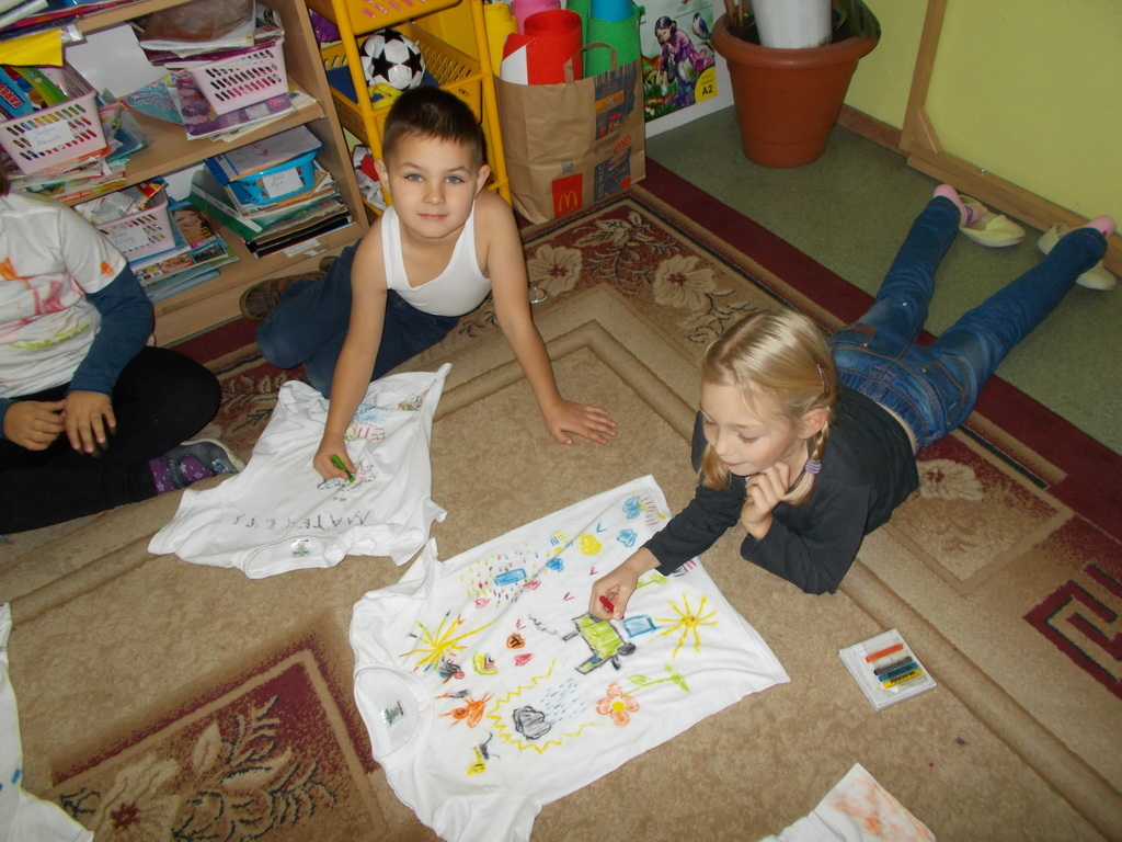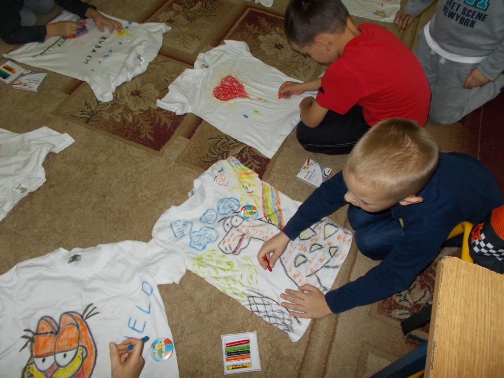 Po rozpakowaniu kredek, dzieciakom rozbłysły oczy na widok pięknych kolorów. Szybko zaplanowali, co ma być na ich strojach . Praca sprawiła im ogromną radość - kredki są mięciutkie, a poza tym mają piękne, żywe kolory. Po skończonej pracy tkanina została przeprasowana, aby utrwalić kolorowe wzory.