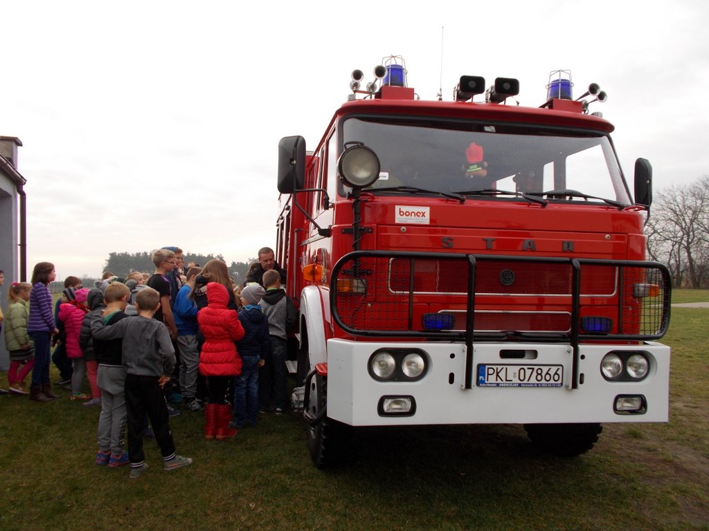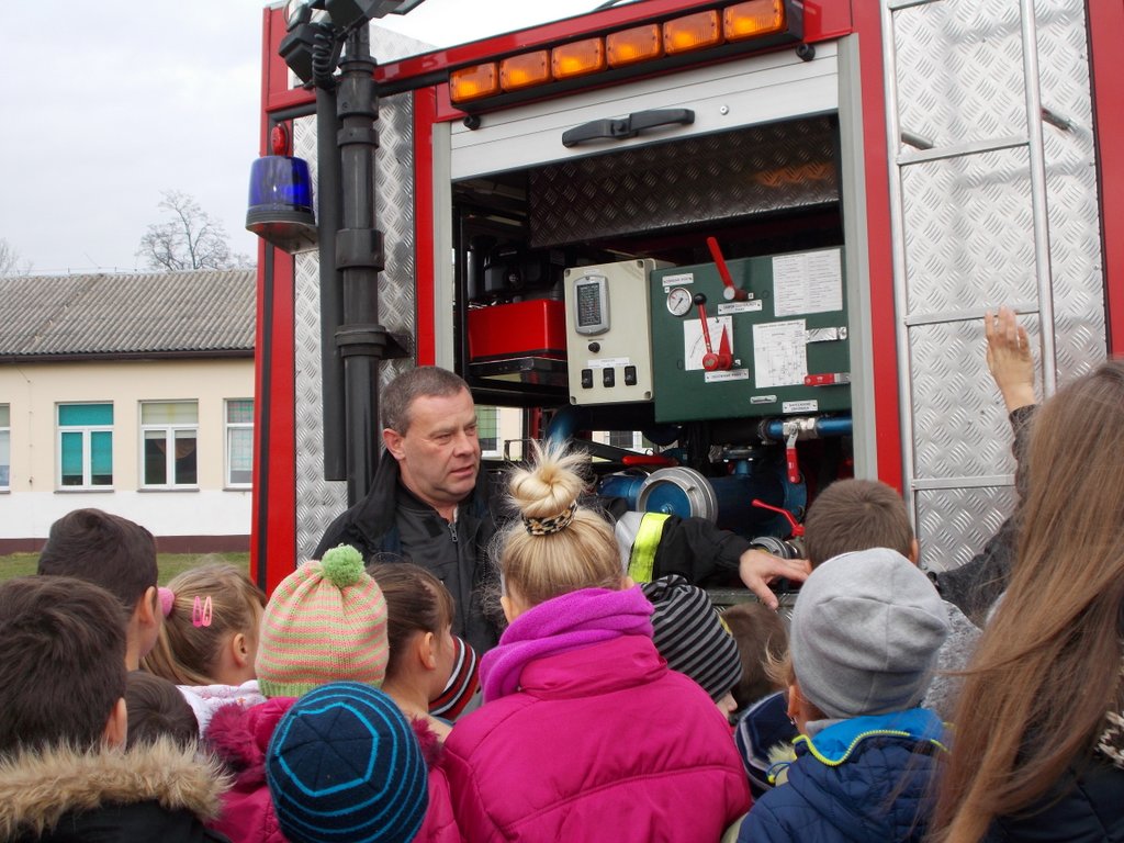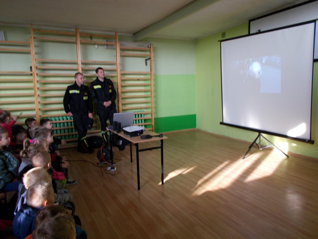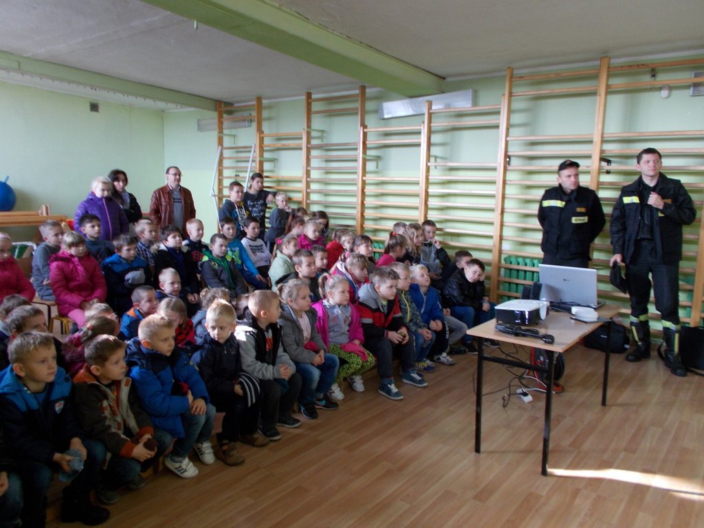 W ramach realizacji programu „Zgaś ryzyko” w dniu 13.11.2015 r. przybyli do naszej szkoły strażacy z jednostki Państwowej Straży Pożarnej w Kole. Zaprezentowali uczniom film, mający na celu zaznajomienie ze sposobami zapobiegania powstawania pożarów w gospodarstwach domowych. Przeprowadzili pogadankę na temat zagrożenia zatrucia się dymem i czadem. Przedstawili czujniki reagujące na obecność dymu lub czadu w pomieszczeniach mieszkalnych. Poruszyli temat bezpieczeństwa podczas zbliżających się ferii świątecznych i zimowych. Dzieci bardzo chętnie brały udział w rozmowie ze strażakami. Zadawały wiele pytań dotyczących spotkania. Na koniec pan Mirosław Rossa, pracownik PSP w Kole, zaprezentował niedawno zakupiony dla OSP Trzęśniew duży wóz strażacki. Opowiedział o możliwościach zastosowania wyposażenia pojazdu podczas akcji pożarniczej, wypadków drogowych i innych niebezpiecznych zdarzeń.