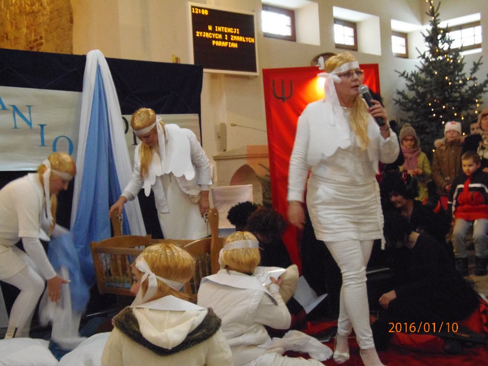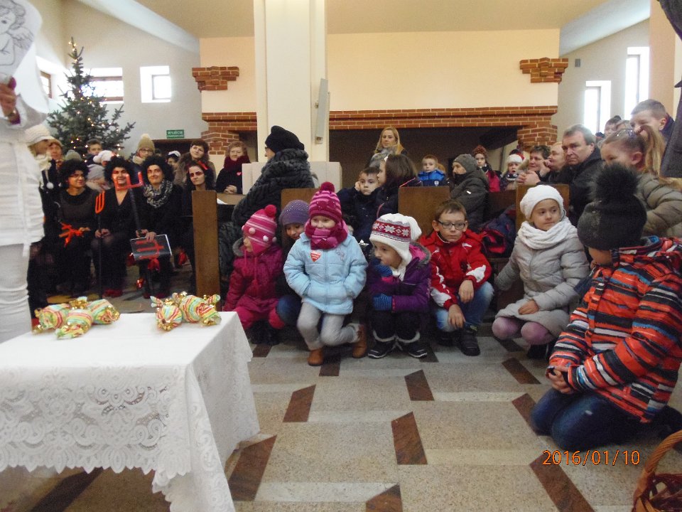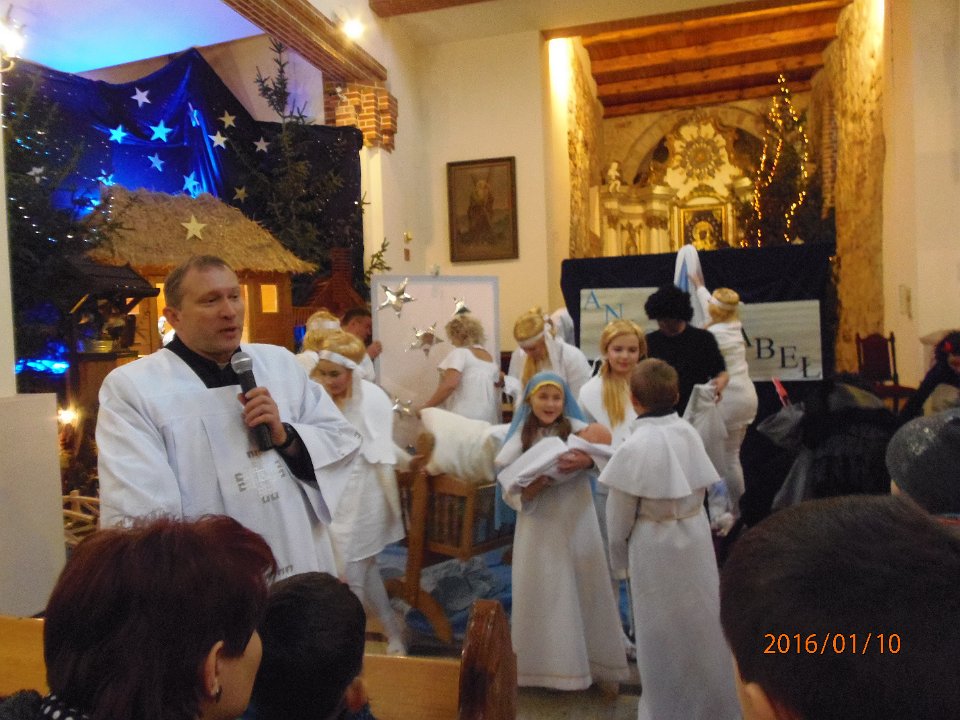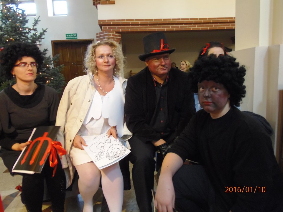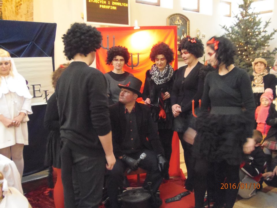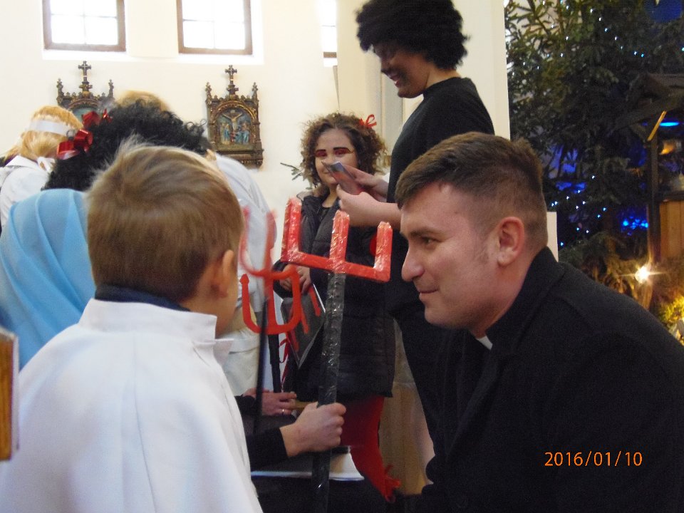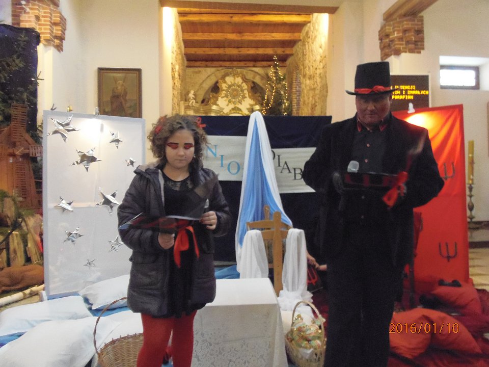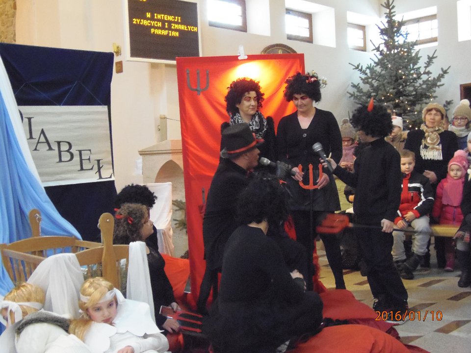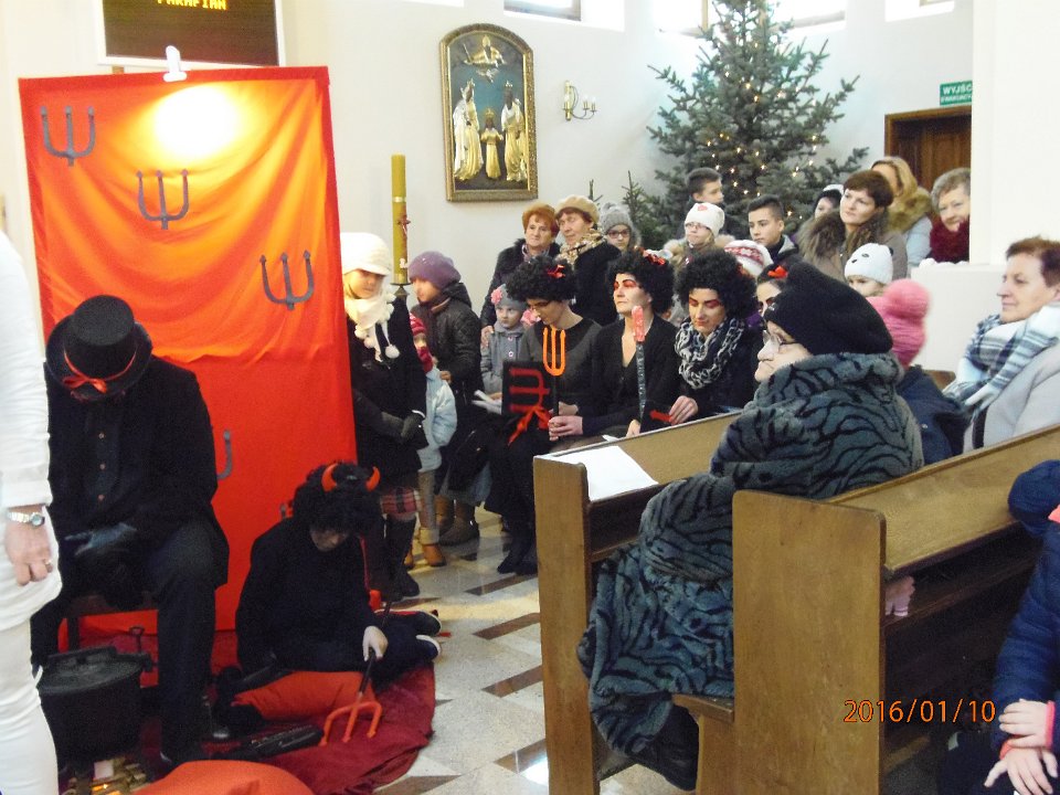 Na prośbę księdza proboszcza naszej parafii Tomasza Jenera KLUBIK TEATRALNY w dniu 10.01.2016 r., przed mszą świętą o godzinie 12:00, wystawił przedstawienie bożonarodzeniowe „Jeden do zera”. Dzień wcześniej w kościele odbyła się próba. W niedzielę przed występem ks. Proboszcz zaprosił aktorów do plebanii, aby tam mogli przygotować się do spektaklu i ogrzać przy ciepłej herbacie. „Bóg zapłać” naszym duszpasterzom za miłe przyjęcie. Członkowie koła teatralnego /rodzice, nauczyciele, dyrektor i uczniowie/ byli bardzo stremowani, ale emocje szybko opadły, gdy zostali nagrodzeni za występ dużymi brawami. Wielu widzów podchodziło do aktorów dziękując za piękne wrażenia, które dostarczył spektakl. Dziękujemy pani Magdalenie Pasternak za przygotowanie makijażu występującym.