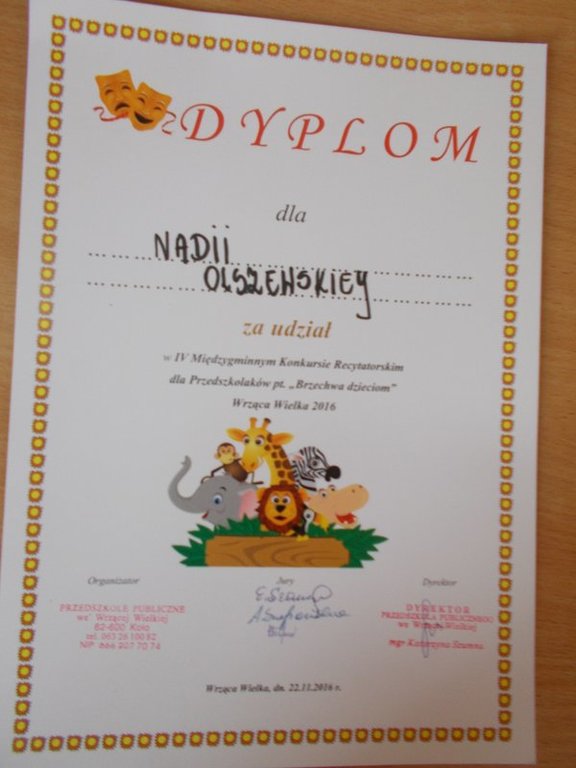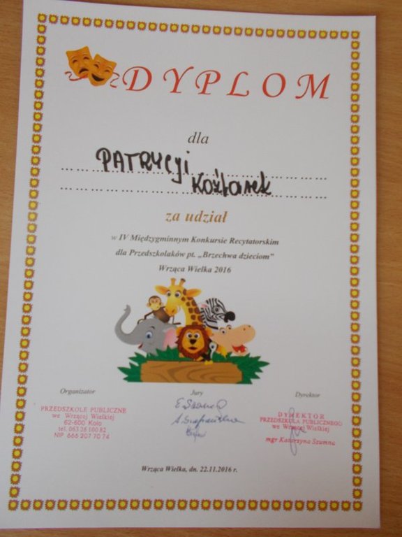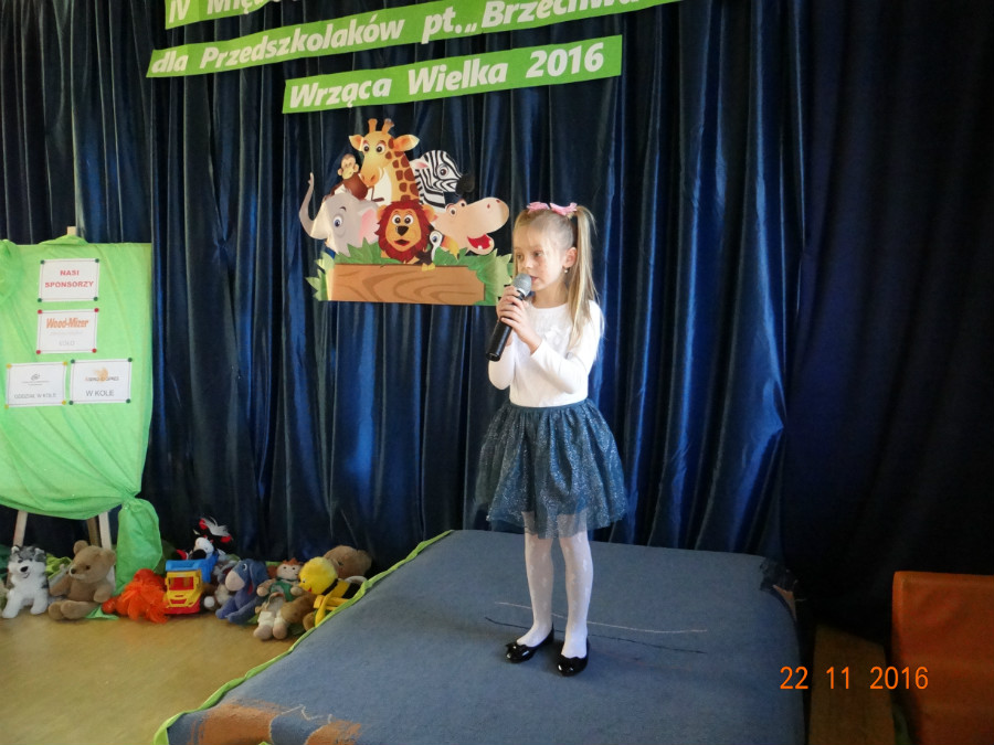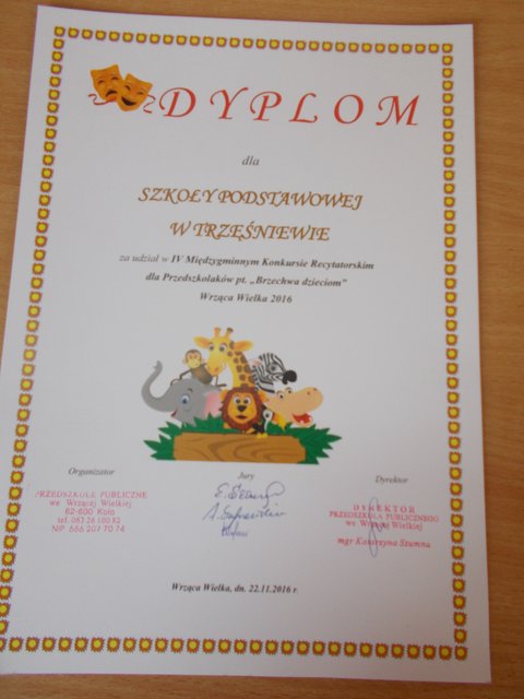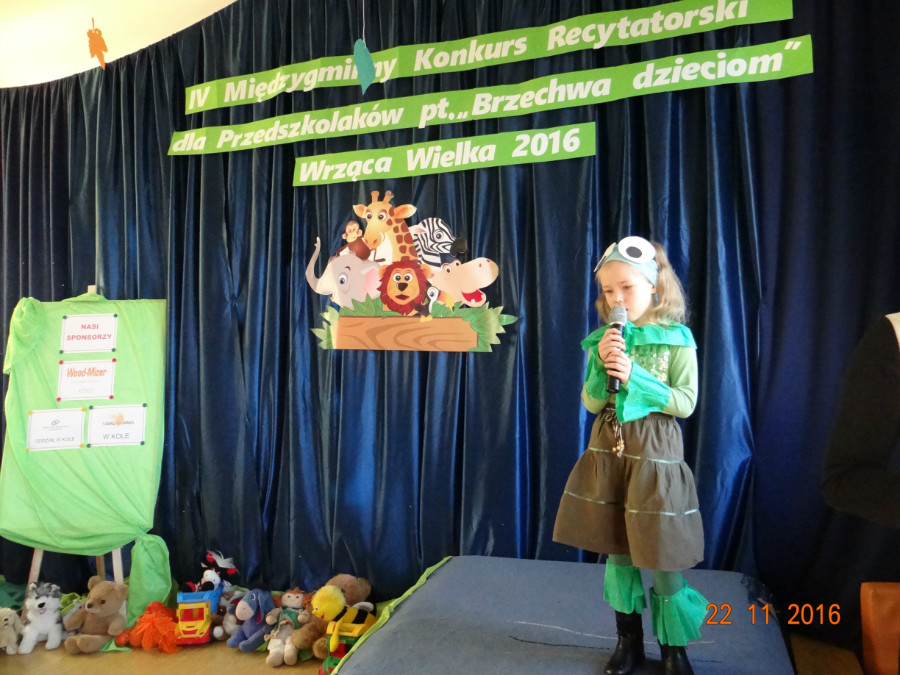 22.11.2016 r. dziewczynki z oddziału przedszkolnego – Patrycja Koźlarek i Nadia Olszewska – wzięły udział w IV Międzygminnym Konkursie Recytatorskim „Brzechwa dzieciom” we Wrzącej Wielkiej. Nadia zaprezentowała wiersz „Kłamczucha”, a Patrycja „Żaba”. Dziewczynki pięknie wyrecytowały wiersze przed Jury i dużą publicznością. Otrzymały upominki i dyplomy za udział. To było ich pierwsze takie doświadczenie w życiu. Gratulacje za odwagę!