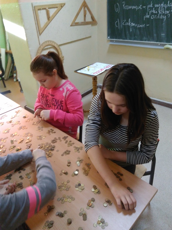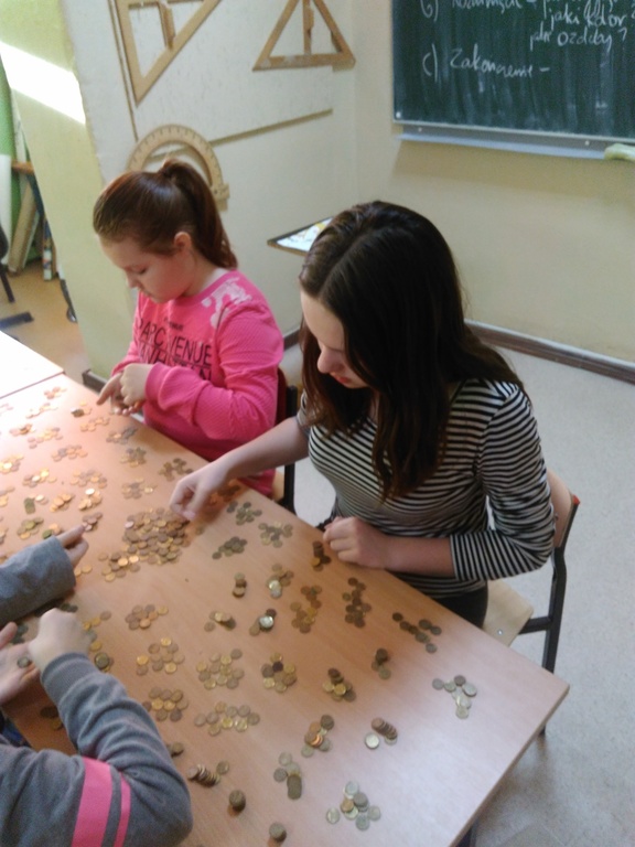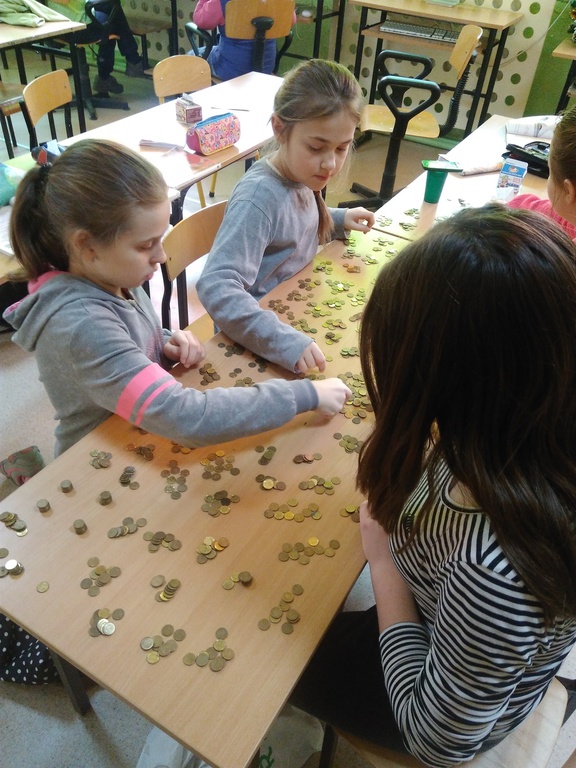 Co prawda nie został pobity rekord naszej szkoły, ale i tak jesteśmy dumni , że dzięki Wam wszystkim udało nam się uzbierać i usypać całkiem sporą ,,górę'', która po przeliczeniu przez dziewczyny ; Martynę , Weronikę ,Julkę z kl.V i Julkę oraz Olgę z klasy IV - wyniosła 58,16 gr. W szczególności dziękujemy pani Reni Cieślak , która nadzorowała i pomagała w liczeniu monet.