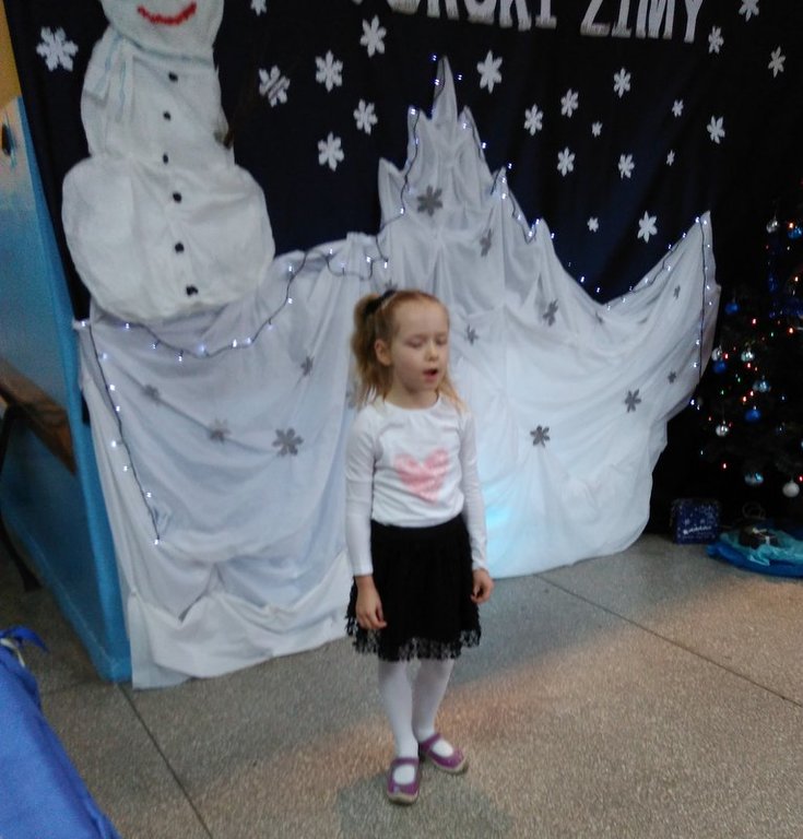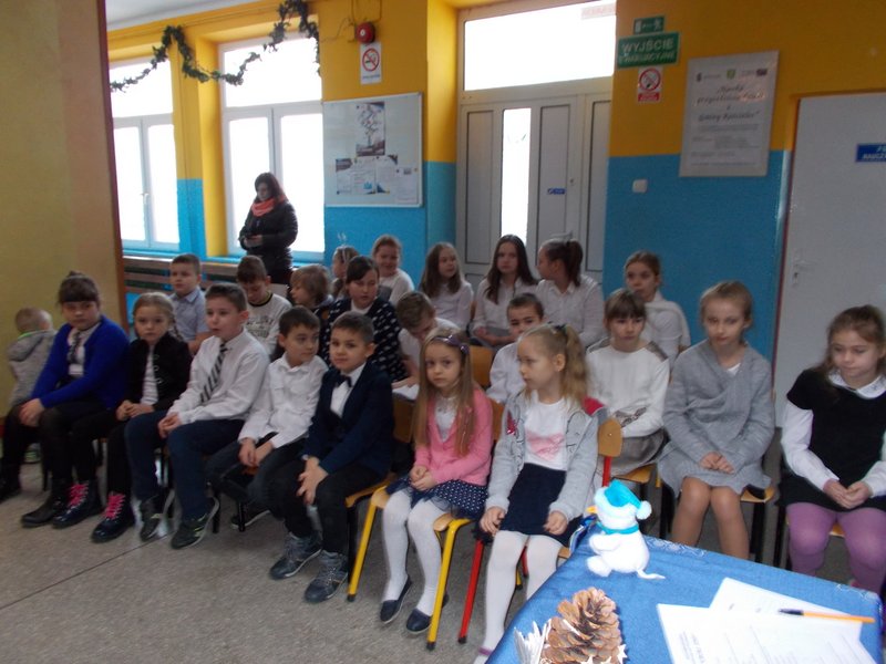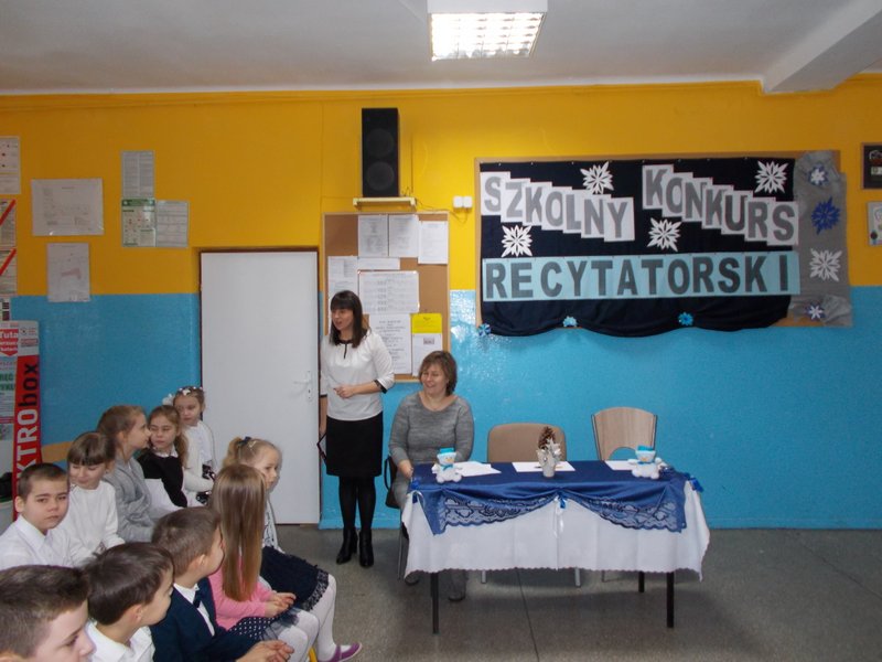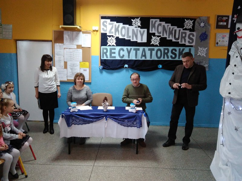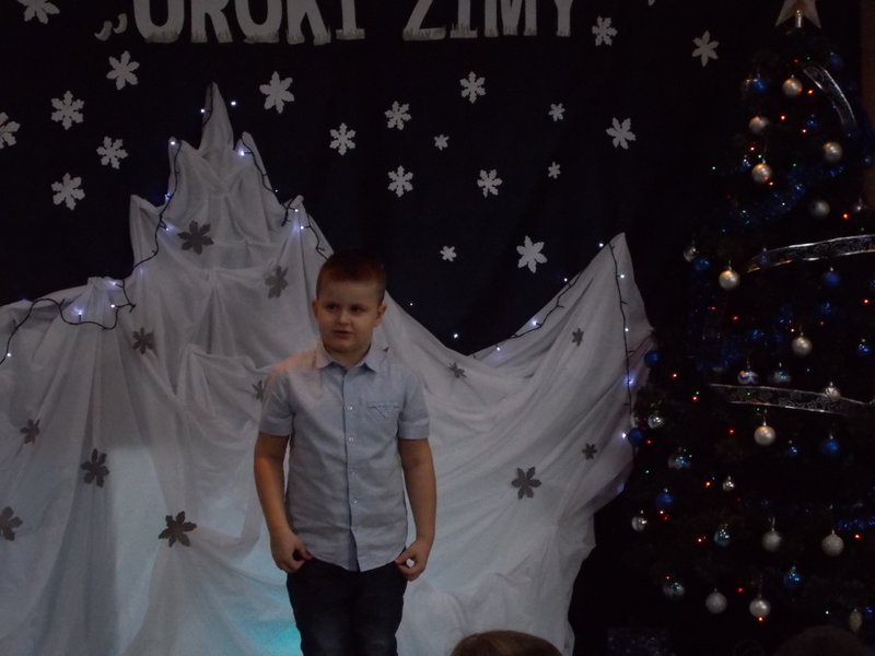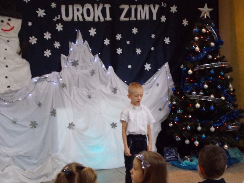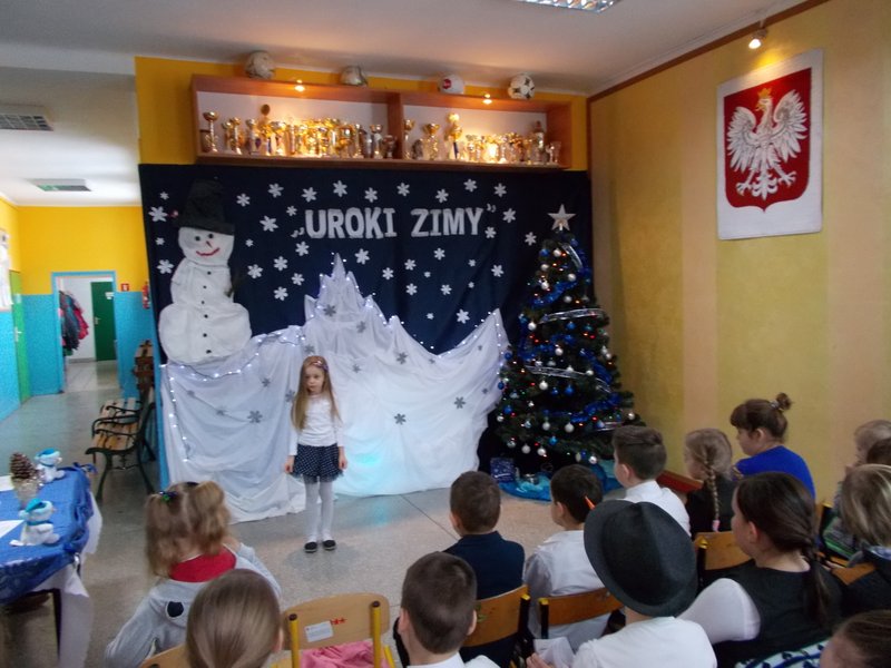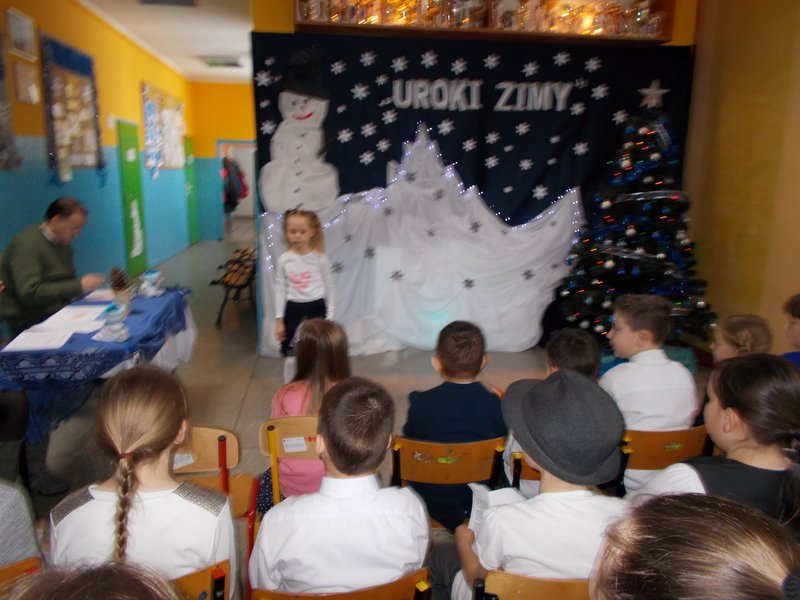 Dnia 18.01.2017r odbył się w naszej szkole konkurs recytatorski pod hasłem "UROKI ZIMY", którego celem było popularyzowanie twórczości o zimie, zainteresowanie uczniów poezją, rozwijanie wrażliwości na poezję, odkrywanie i rozwijanie umiejętności recytatorskich i aktorskich u dzieci, uczenie rywalizacji w przyjaznej atmosferze. Na tle przepięknej dekoracji, wykonanej przez panią Mieczysławę Strzelińską, dzieci deklamowały wiersze o bałwankach, padającym śniegu, zabawach na sankach, pięknym krajobrazie zimowym. Poziom prezentacji był bardzo wysoki. Jury w składzie: pani Anna Zawadzka / dyrektor Gminnej Biblioteki Publicznej w Kościelcu/, pani Katarzyna Czartek / nauczyciel wychowania przedszkolnego/, pan Zbigniew Michalec /nauczyciel języka polskiego i historii/, miało nie lada problem z wyłonieniem zwycięzców. Ostatecznie zostali nagrodzeni: