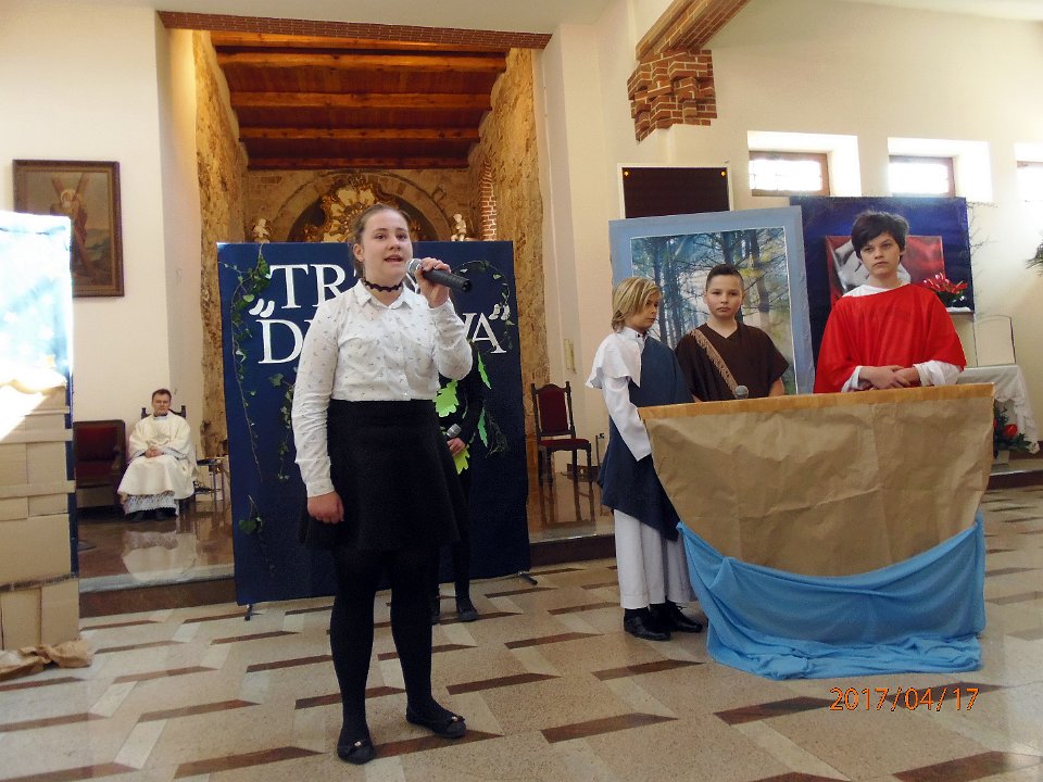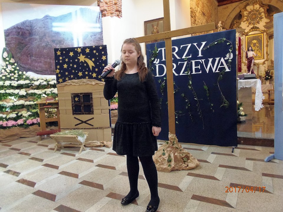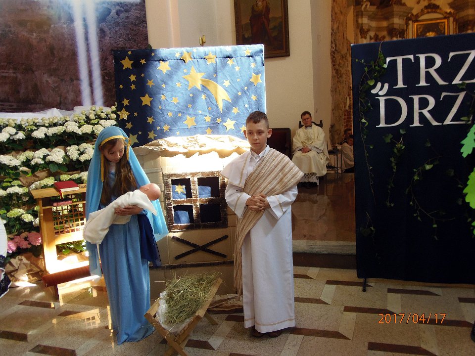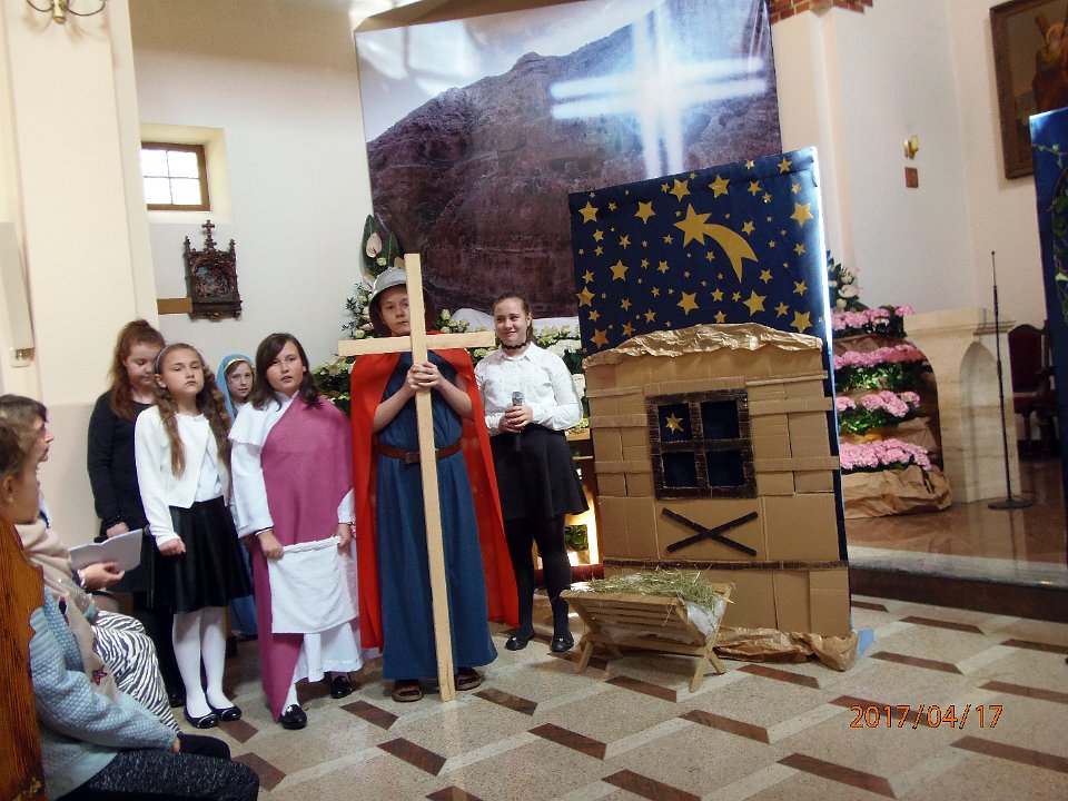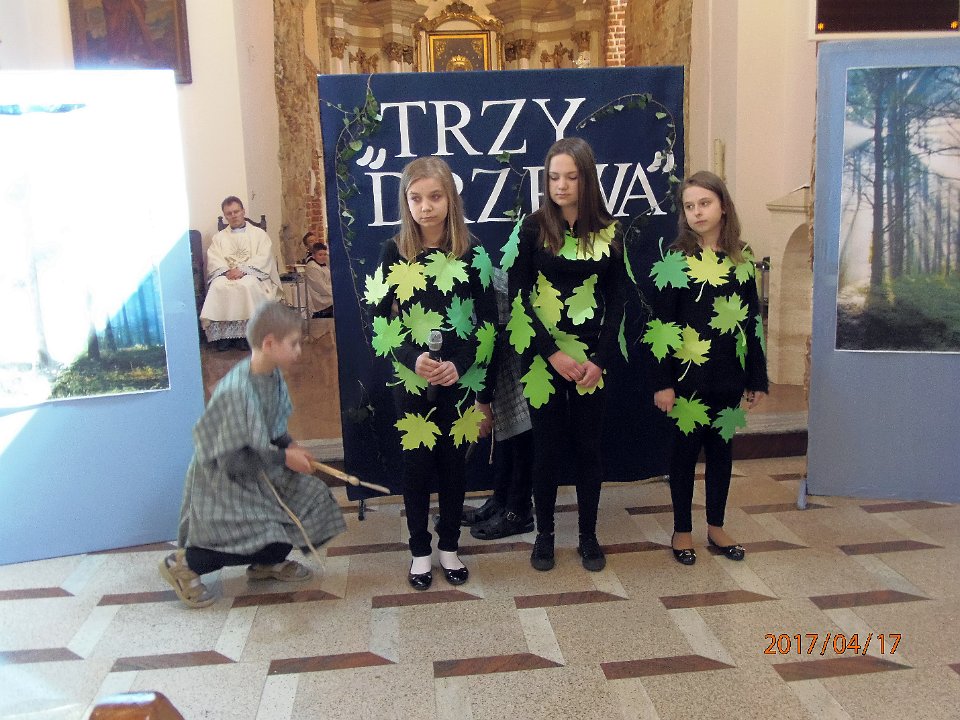 Odpowiadając na zaproszenie księdza proboszcza Tomasza Jenera, uczniowie naszej szkoły dnia 17.04.2017r. wystąpili w kościele parafialnym w Kościelcu ze spektaklem "Trzy drzewa". Dzieci zaprezentowały się wspaniale. Aktorzy zostali nagrodzeni dużymi brawami i słodkim upominkiem (prezent od księdza proboszcza). Za przygotowanie uczniów odpowiadała pani Renata Cieślak i pani Katarzyna Rutkowska.