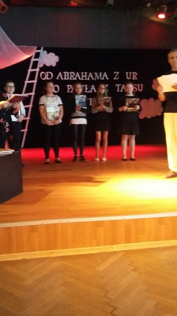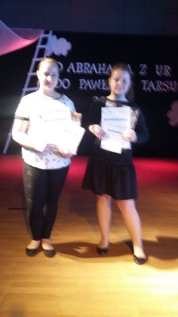 Dnia 18 maja 2017r. w Młodzieżowym Domu Kultury w Koninie odbył się XXII Międzypowiatowy Turniej Recytatorski na tematy Biblijne. W turnieju naszą szkołę reprezentowały dwie uczennice, które miały za zadanie przedstawić wybrany fragment Biblii. Weronika Jaworska /uczennica klasy V/ zaprezentowała fragment z Księgi Rodzaju - "Upadek pierwszych ludzi". Kinga Łopata /uczennica klasy VI/ przestawiła fragment z Ewangelii według św. Jana - "Cud w Kanie Galilejskiej". Uczennice przepięknie recytowały wybrane fragmenty biblijne, zaprezentowały bardzo wysoki poziom. Zostało to dostrzeżone przez szanowne Jury. Weronika i Kinga otrzymały wyróżnienia - dyplomy i nagrody książkowe.