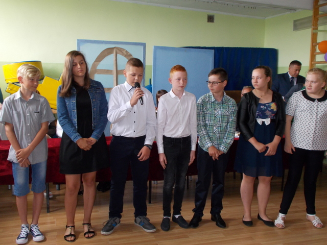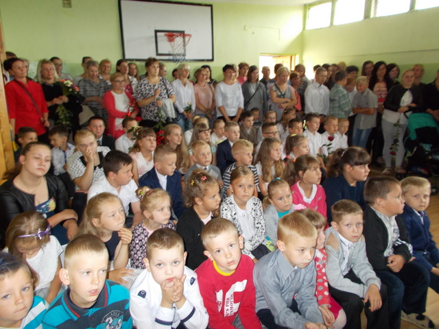 23 czerwca 2017 r. został zakończony rok szkolny 2016/2017. Uroczystość miała się rozpocząć punktualnie o godzinie 9:00, ale ze względu na zmieniające się warunki atmosferyczne nastąpiło kilku minutowe opóźnienie. Wszystkich powitał dyrektor szkoły Mirosław Zagozda. Na początku swoje występy artystyczne zaprezentowali uczniowie klas O-VI. Następnie zostały wręczone świadectwa z wyróżnieniem, nagrody i dyplomy za różne osiągnięcia. Dyrektor szkoły poinformował rodziców i uczniów o zmianach w systemie oświaty oraz o miejscu realizacji obowiązku szkolnego przez uczniów naszej szkoły od 1 września 2017r. Zapis ustawowy dotyczy również uczniów klasy I gimnazjum, którzy nie uzyskali promocji do klasy II (uczniowie z naszego obwodu szkolnego spełniają obowiązek szkolny w Szkole Podstawowej w Trzęśniewie /kl. VII/). Odczytał również kilka zdań, w związku z kończącym się rokiem szkolnym, skierowanych do społeczności szkolnej, przekazanych przez proboszcza ks.Tomasza Jenera. Uroczystość zakończyła się na spotkaniach klas z wychowawcami w salach.