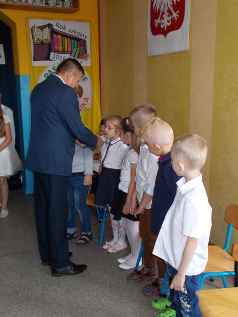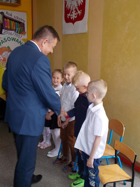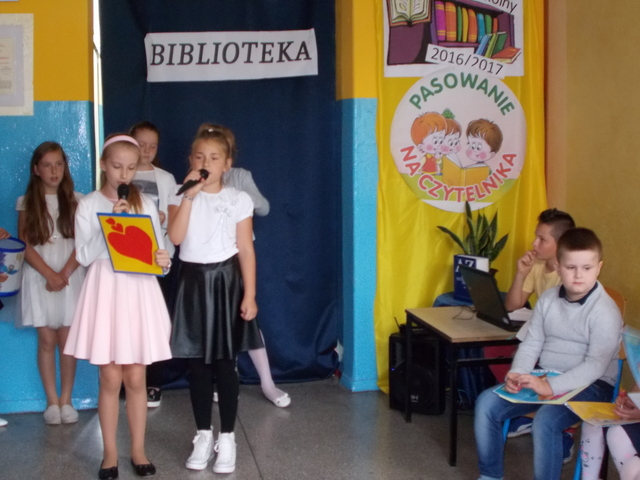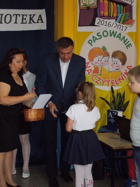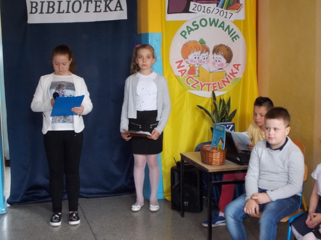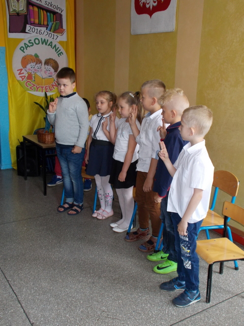 W naszej szkole pasowanie uczniów klasy  pierwszej  na czytelnika  biblioteki na stałe wpisało się do kalendarza uroczystości szkolnych. Zazwyczaj uroczystość ta odbywa się w II semestrze, kiedy uczniowie znają już prawie cały alfabet. Pierwsze spotkanie z biblioteką szkolną to wyjątkowa uroczystość, a pierwsza wypożyczona książka powinna być  na długo zapamiętana. Specjalnie na tę okazję została przygotowana krótka część artystyczna, podczas której w dniu 13 czerwca 2017r.  starliśmy się przekazać wiedzę  o książce i bibliotece.  Po krótkiej inscenizacji w wykonaniu starszych koleżanek i kolegów przeszliśmy do kolejnego punktu programu.  Skupieni i poważni, w obecności pana Dyrektora ,grona pedagogicznego oraz  uczniów  , pierwszoklasiści  uroczyście przyrzekli , że będą kochać i szanować książki, korzystać z ich mądrości i sumiennie wypełniać obowiązki czytelnika. Po przyrzeczeniu nastąpiło uroczyste Pasowanie na Czytelnika, którego dokonał pan Dyrektor . Wręczył także pierwszoklasistom   pamiątkowe dyplomy i słodkie upominki . Od starszych koleżanek i kolegów  pierwszaki otrzymały znaczki symbolizujące pasowanie na czytelnika  oraz  gazetkę ,,Biblioteczne wieści" zredagowaną specjalnie na tę okazję. Uroczystość przebiegła w miłej i przyjaznej atmosferze.  Po takim wspólnym spotkaniu biblioteka będzie kojarzyła się najmłodszym z miejscem bezpiecznym, przyjaznym,  gdzie uczniowie są zawsze mile widziani.
