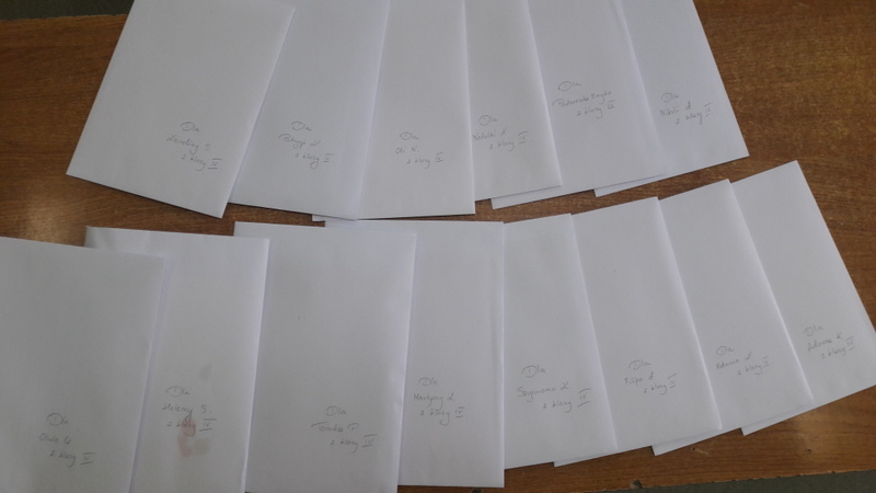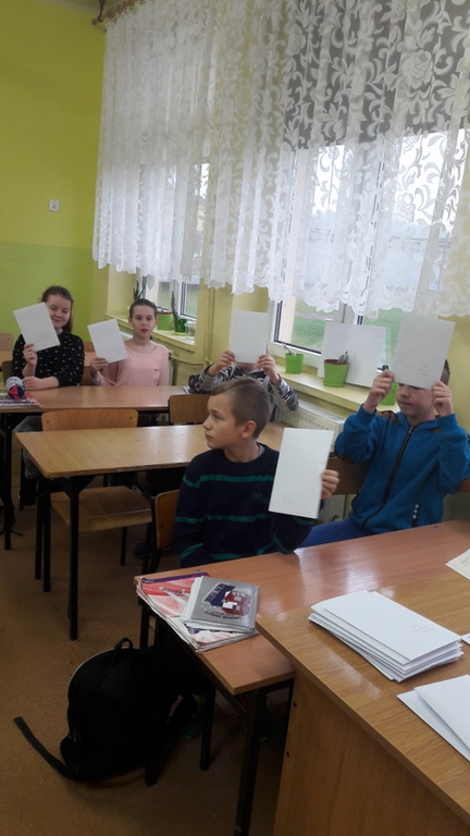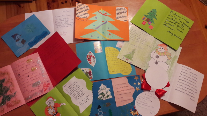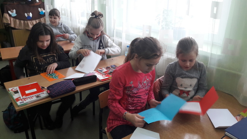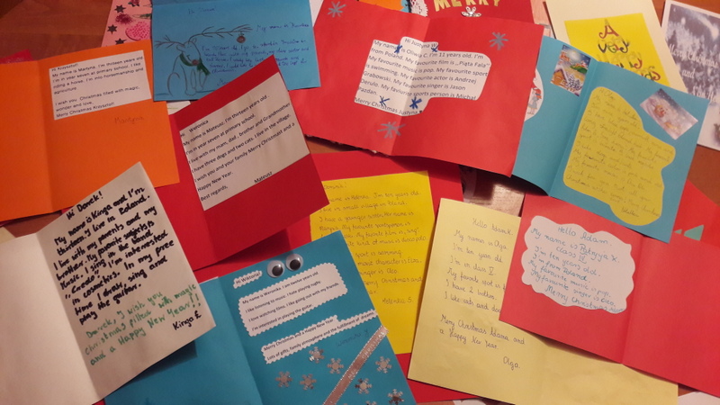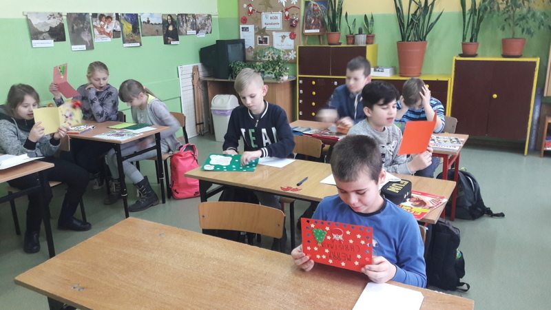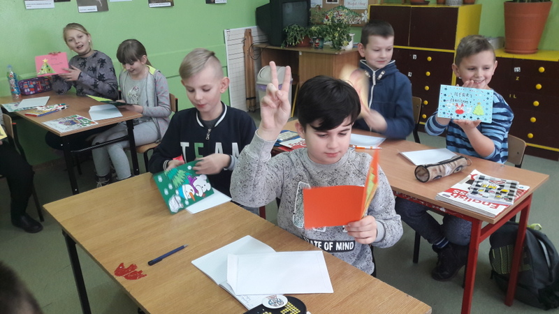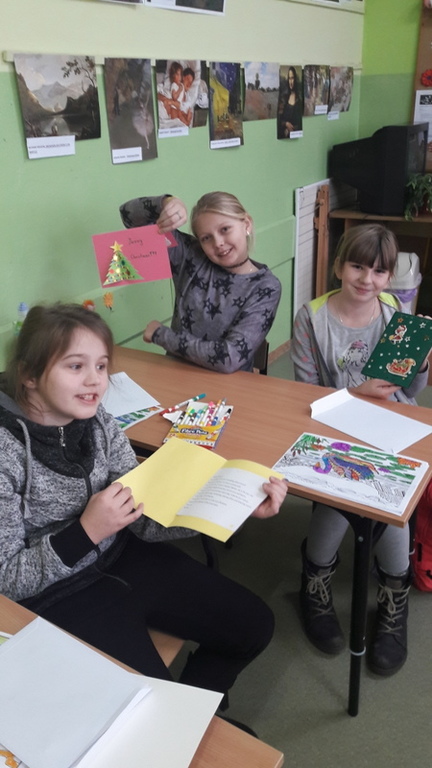 W grudniu uczniowie wzięli  udział w wymianie kartek świątecznych z uczniami z innej szkoły w Polsce. Głównym celem projektu było doskonalenie umiejętności komunikowania się w języku angielskim. Otrzymane kartki sprawiły wszystkim wiele radości, a tworzenie własnych kartek i wypisywanie listów było praktyczną, a przy tym naprawdę ciekawą, przyjemną i wesołą lekcją języka angielskiego. Nasi uczniowie bardzo się zaangażowali w to zadanie i przygotowali przepiękne kartki i listy.  Ta lekcja na pewno na długo zostanie w pamięci naszych uczniów.