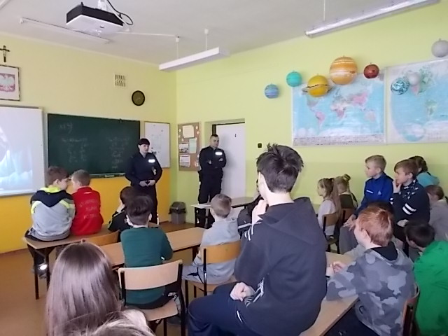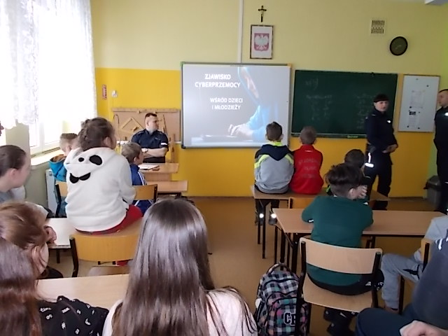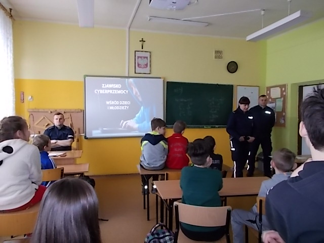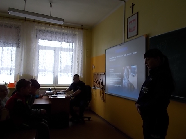 W piątek 19 stycznia naszą szkołę odwiedzili funkcjonariusze policji. Uczniowie klas IV-VII poznali zachowania ryzykowne związane ze zjawiskiem cyberprzemocy oraz zagrożenia płynące ze spotkań z osobami znanymi wyłącznie z Internetu, upubliczniania danych osobowych, piractwa w sieci czy nadmiernego korzystania z Internetu.