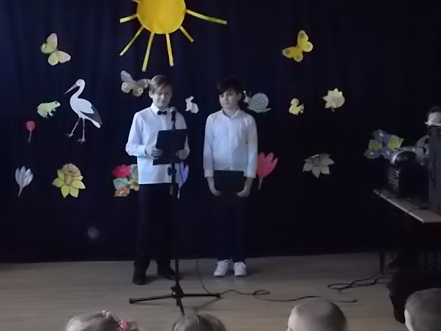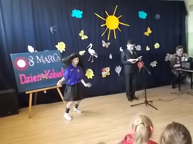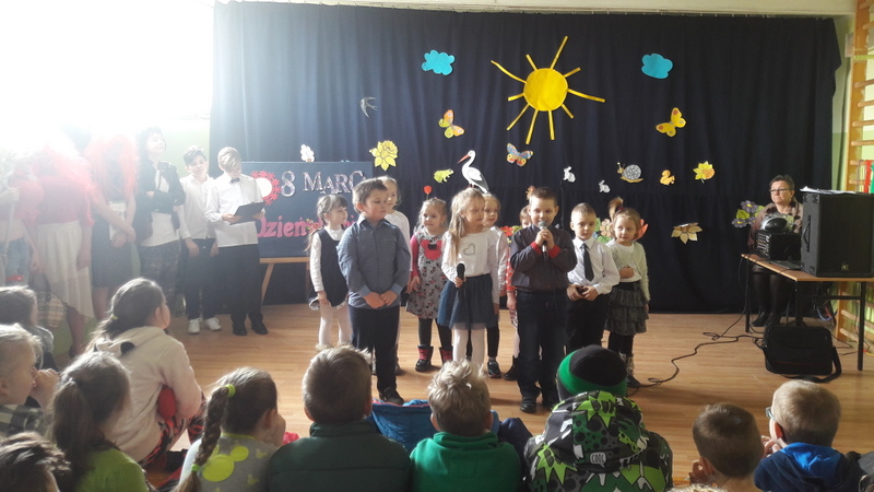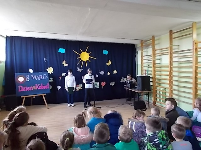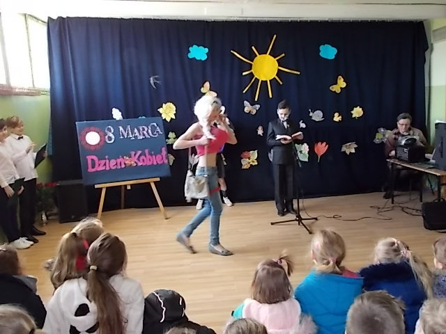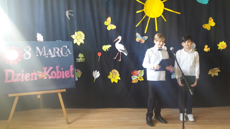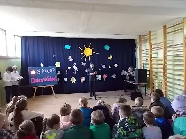 Następnie, dzieci z oddziału przedszkolnego scharakteryzowały małe i większe kobietki w piosence „Małe dziewczynki”. Panowie z klasy I za pomocą wiersza złożyli życzenia dla Pań a Igor i Maciek z klasy III odpowiedzieli na pytanie: jakie są kobiety? Na zakończenie, dla wszystkich zgromadzonych Pań, Panowie wykonali piosenkę Marka Grechuty pod tytułem „Będziesz moją Panią”. Panie nauczycielki i pani woźna otrzymały kwiaty od uczniów a po uroczystości pan Dyrektor złożył życzenia wszystkim paniom.