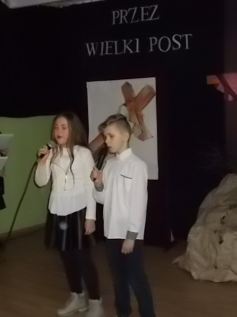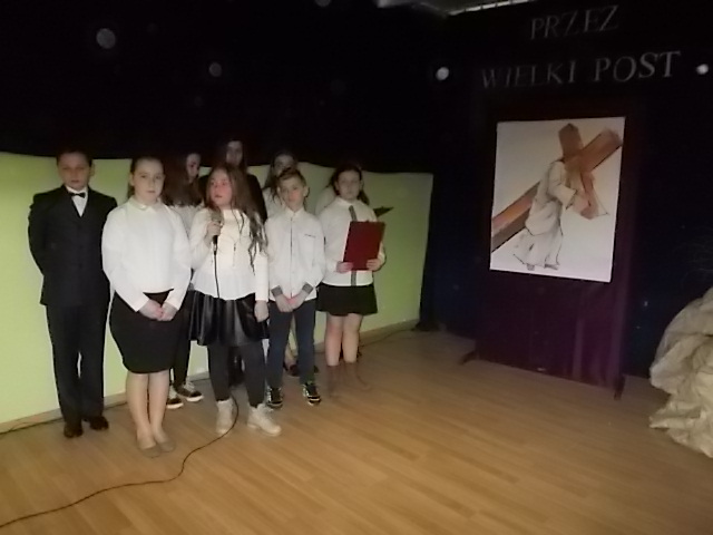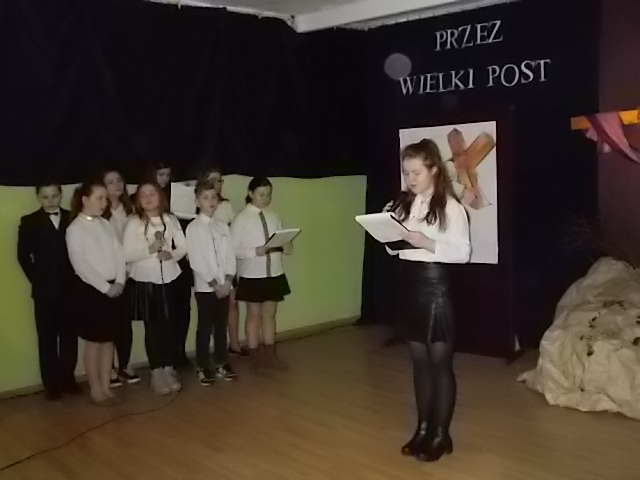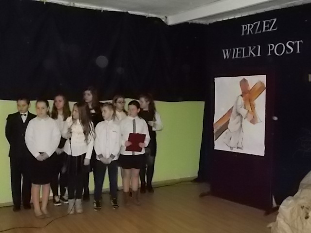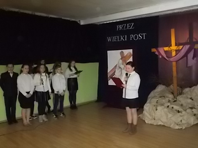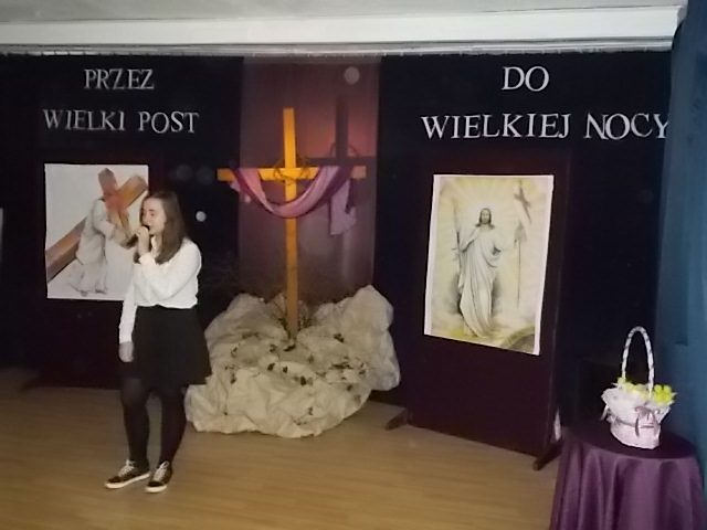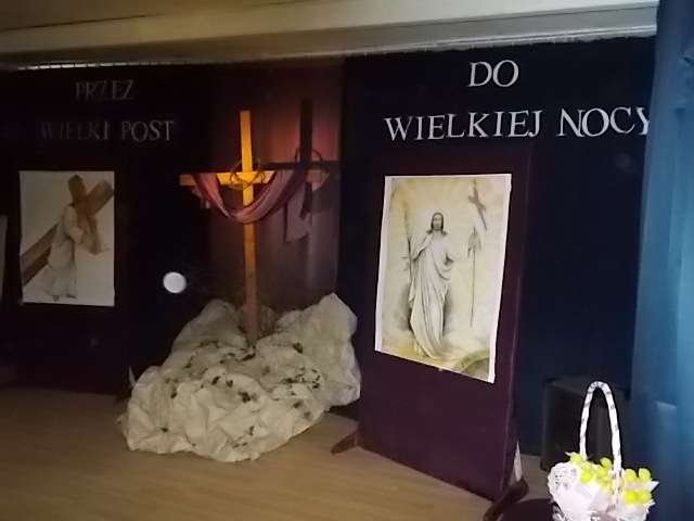 Dnia 29 marca uczniowie, nauczyciele i pracownicy naszej szkoły zebrali się, aby wspólnie przypomnieć sobie polskie zwyczaje i tradycje związane z tym świętem. Wędrówkę słowno-muzyczną „Przez Wielki Post do Wielkiej Nocy” przygotowali uczniowie klas V – VII pod opieką pani Renaty Cieślak oraz pani Katarzyny Rutkowskiej. Chcieli oni poprzez przedstawienie pomóc innym lepiej przygotować się do dobrego przeżycia tych nachodzących dni. W trakcie spotkania dzieci przedstawiły, jak wyglądają kolejno: Środa Popielcowa, Niedziela Palmowa, Triduum Paschalne oraz Niedziela Zmartwychwstania Pana Jezusa. Atmosferę skupienia pomogła wprowadzić nastrojowa dekoracja wykonana przez panią Mieczysławę Strzelińską.
