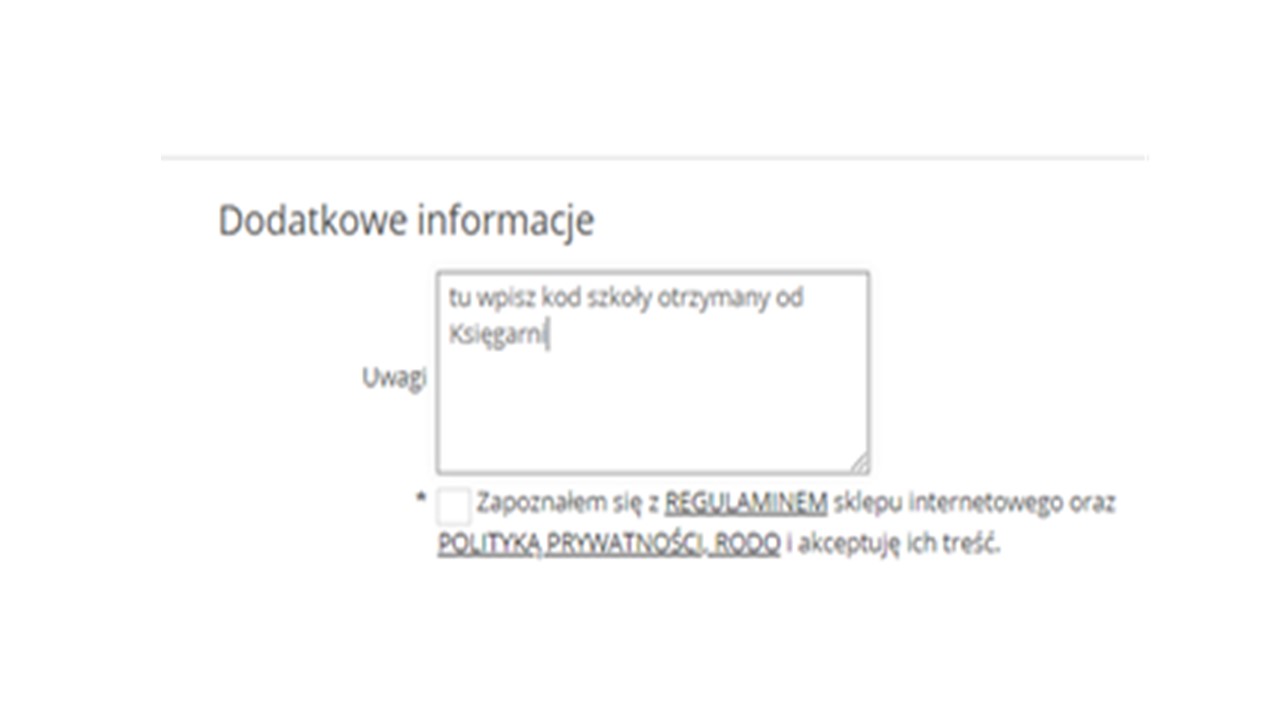 Wyboru literatury proszę dokonać na stronie www.ksiegarnia-tuliszkow.pl. Kod ten należy wpisać w polu podczas finalizowania zakupu. W dodatkowe Informacje, przed kliknięciem przycisku PODSUMOWANI