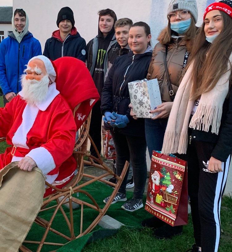 W tej dość nieprzyjaznej dla kraju sytuacji, jako  klasa postanowiliśmy zorganizować coś dla siebie. Na spotkaniu online, na godzinie wychowawczej zrobiliśmy losowanie osób, którym wręczymy mikołajkowy  prezent. Spotkanie odbywało się na boisku szkolnym przy ognisku. Chłopcy przyszli wcześniej, aby przygotować ognisko i pomóc w dekoracji świątecznej, o którą zadbała nasza Pani wychowawczyni Ewa Przeor. Na stole znalazła się choinka, drzewka rozbłysły światełkami, a dla Mikołaja przygotowano bujany fotel.