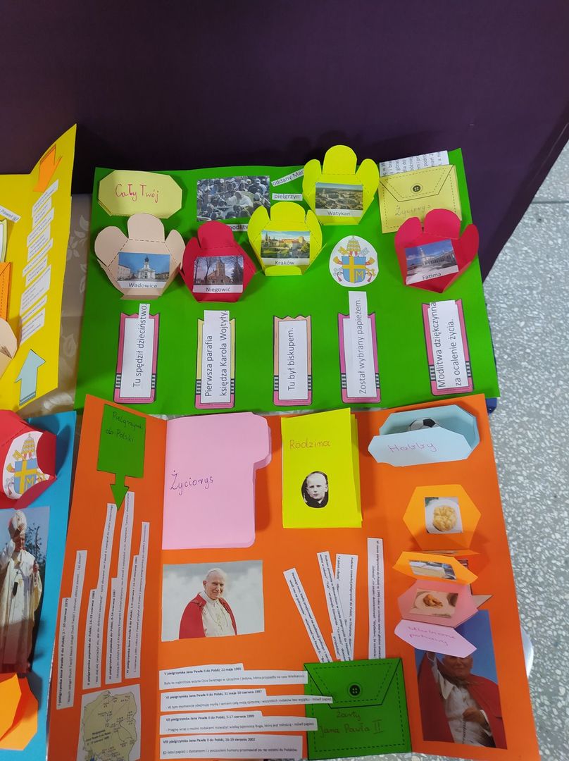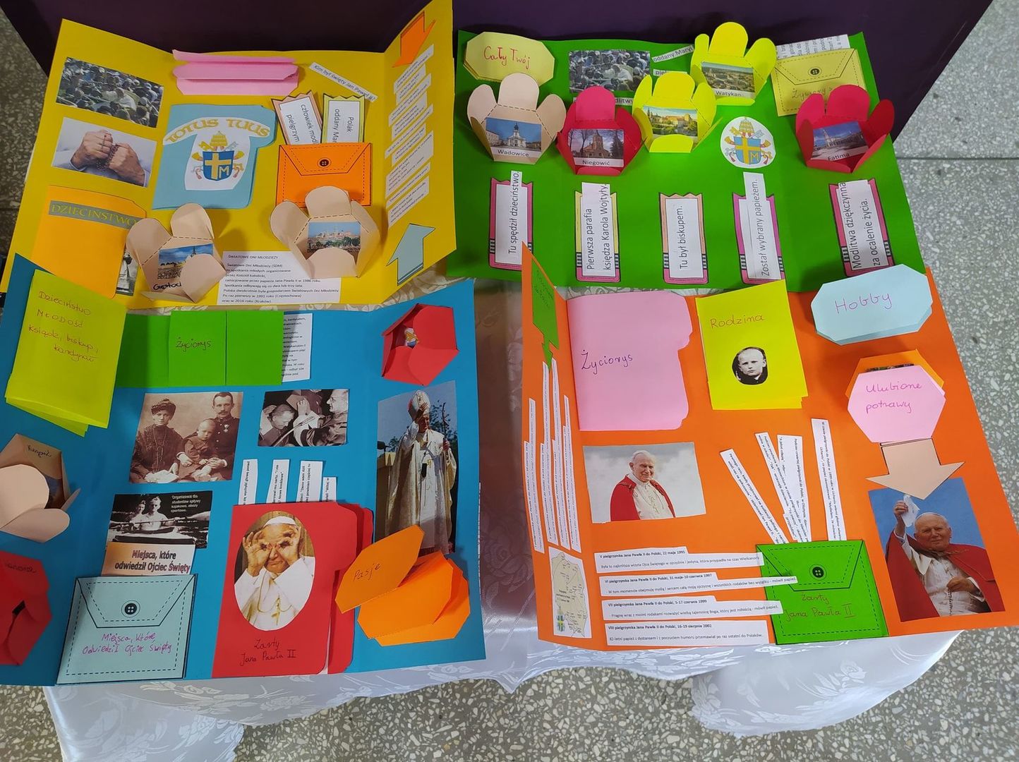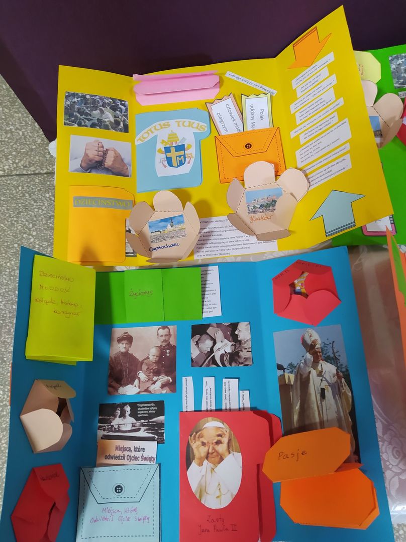 Z okazji zbliżającego się Dnia Papieskiego uczniowie klasy piątej przygotowali lapbooki o Janie Pawle II. Lapbook to forma kreatywnego zaprezentowania informacji na dany temat. Jest czymś w rodzaju teczki tematycznej, która zawiera ruchome elementy, otwierane skrytki, składane okienka, obrotowe koła, różne kieszonki. Te wszystkie elementy maja wzbudzić ciekawość i motywować do otwierania ukrytych ciekawostek. Uczniowie klasy piątej spisali się na szóstkę. Ich prace są ciekawe, kolorowe, estetyczne, pełne pomysłów. Możemy w nich znaleźć informacje o życiu Karola Wojtyły, ważnych datach, ulubionych potrawach, zainteresowaniach, pielgrzymkach i Światowych Dniach Młodzieży.