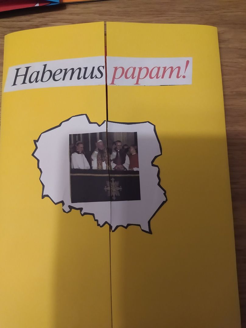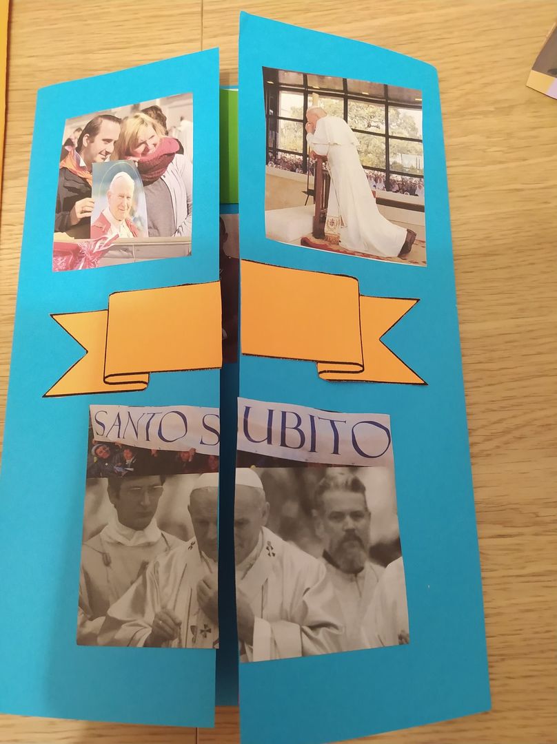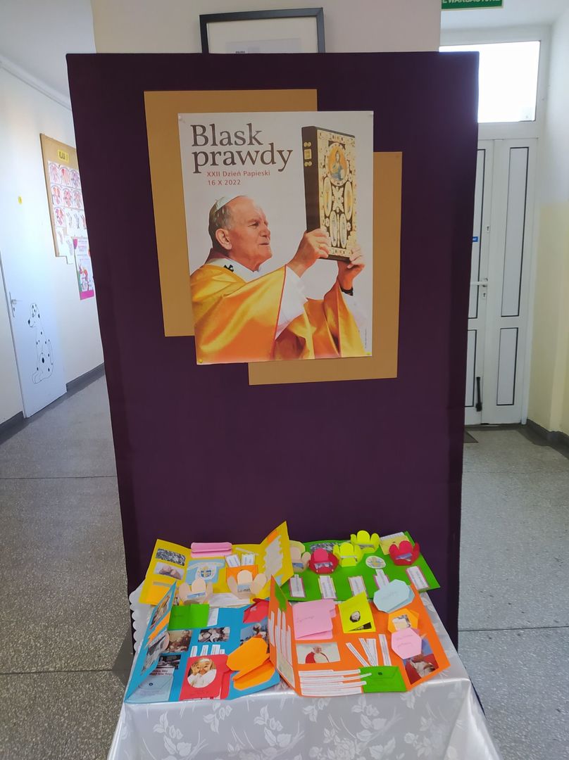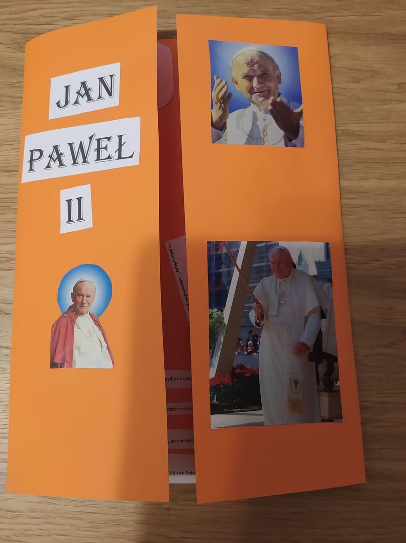 Z okazji zbliżającego się Dnia Papieskiego uczniowie klasy piątej przygotowali lapbooki o Janie Pawle II. Lapbook to forma kreatywnego zaprezentowania informacji na dany temat. Jest czymś w rodzaju teczki tematycznej, która zawiera ruchome elementy, otwierane skrytki, składane okienka, obrotowe koła, różne kieszonki. Te wszystkie elementy maja wzbudzić ciekawość i motywować do otwierania ukrytych ciekawostek. Uczniowie klasy piątej spisali się na szóstkę. Ich prace są ciekawe, kolorowe, estetyczne, pełne pomysłów. Możemy w nich znaleźć informacje o życiu Karola Wojtyły, ważnych datach, ulubionych potrawach, zainteresowaniach, pielgrzymkach i Światowych Dniach Młodzieży.