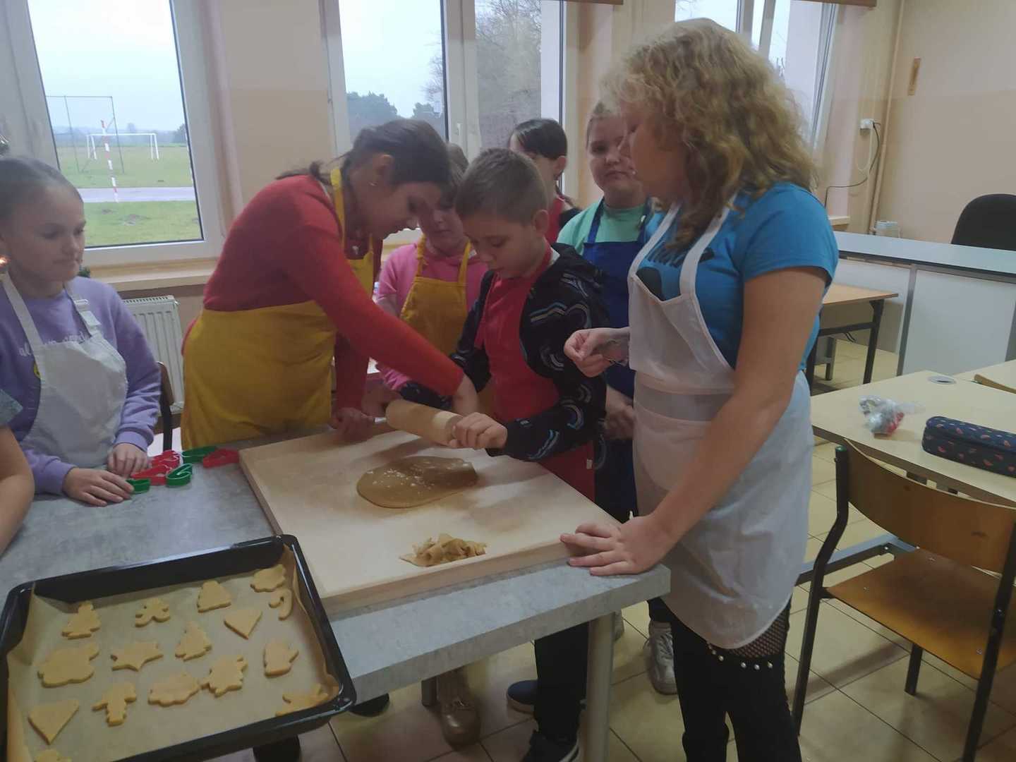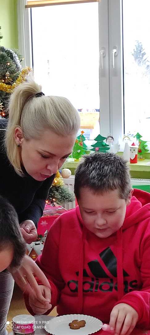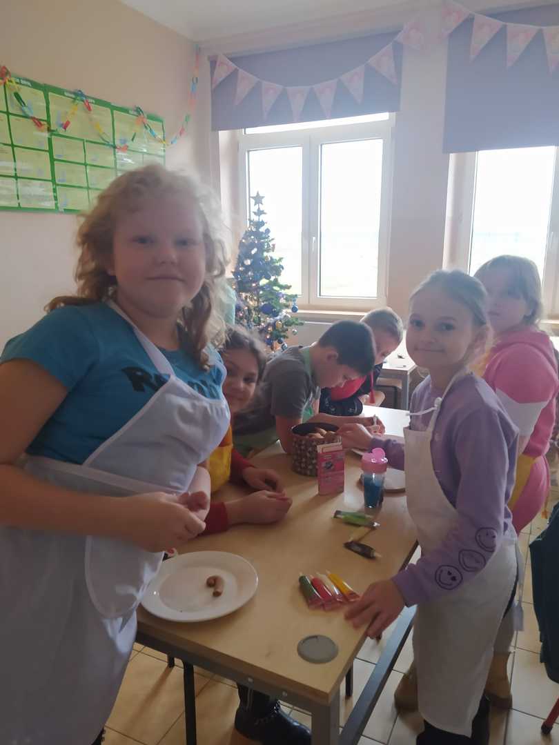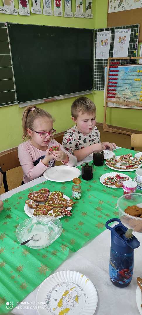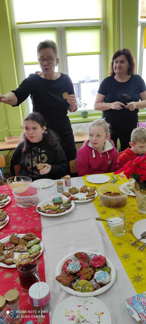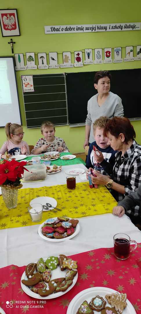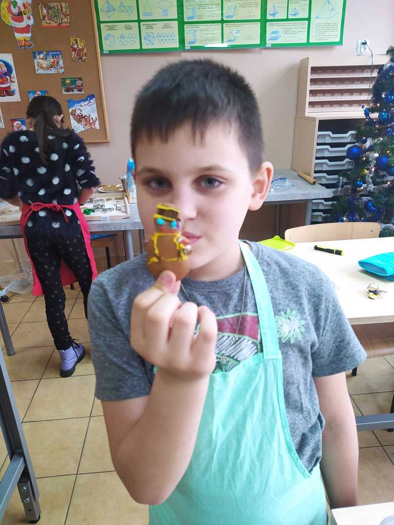 Uczniowie klasy 0, I, II i III rozpoczęli przygotowania do świąt na słodko. Już 13 grudnia wspólnie ze swoimi mamami i babciami dekorowali pierniczki. Wcześniej mamy i babcie upiekły je. Dzieci z zapałem i radością ozdabiały choinki, gwiazdy, serduszka i inne kształty. Do ozdoby pierniczków użyły kolorowego lukru i kolorowych posypek, słuchając świątecznych piosenek. Uczniowie klasy IV samodzielnie wykonali pierniki, wałkowali ciasto, wykrawali z ciasta różne figurki. Po upieczeniu dekorowali pierniki, a w szkole unosił się korzenny zapach, zapach nadchodzących świąt.