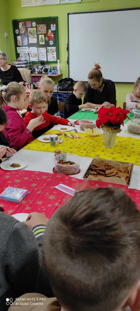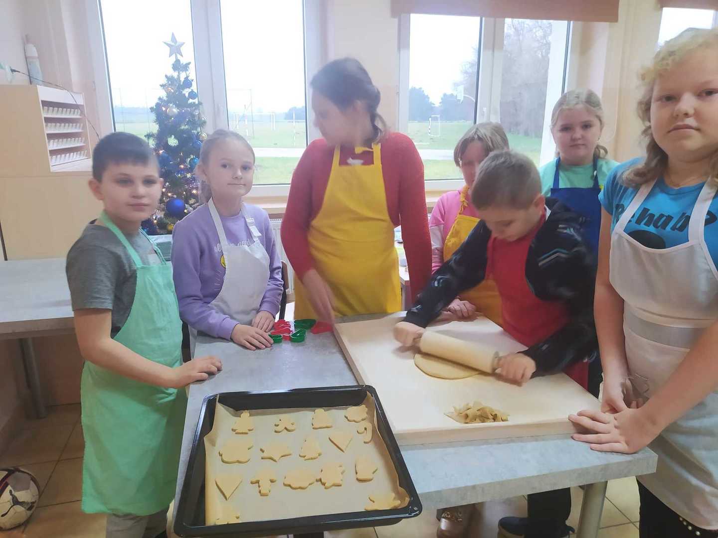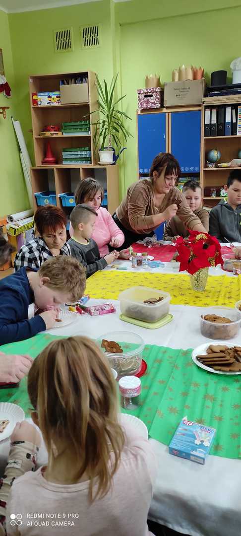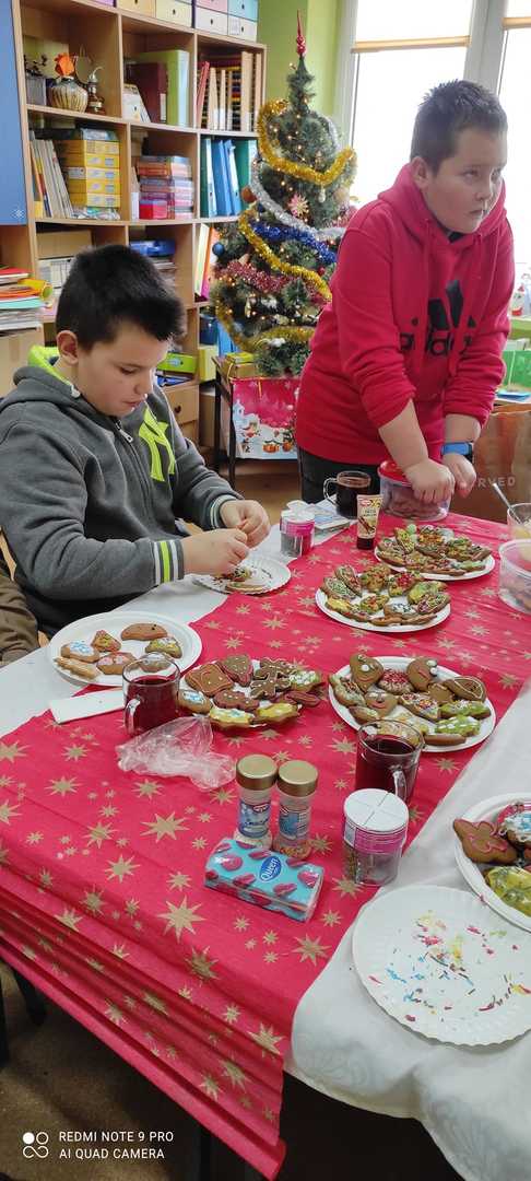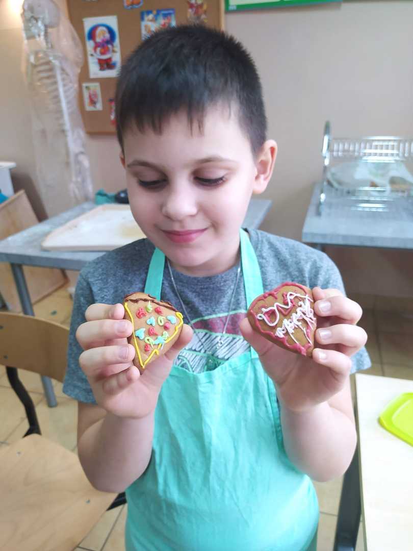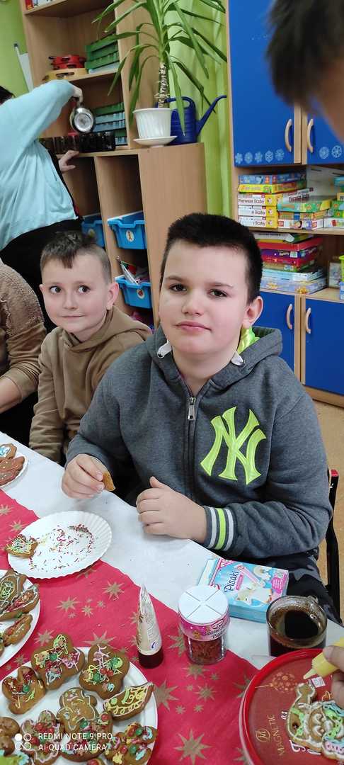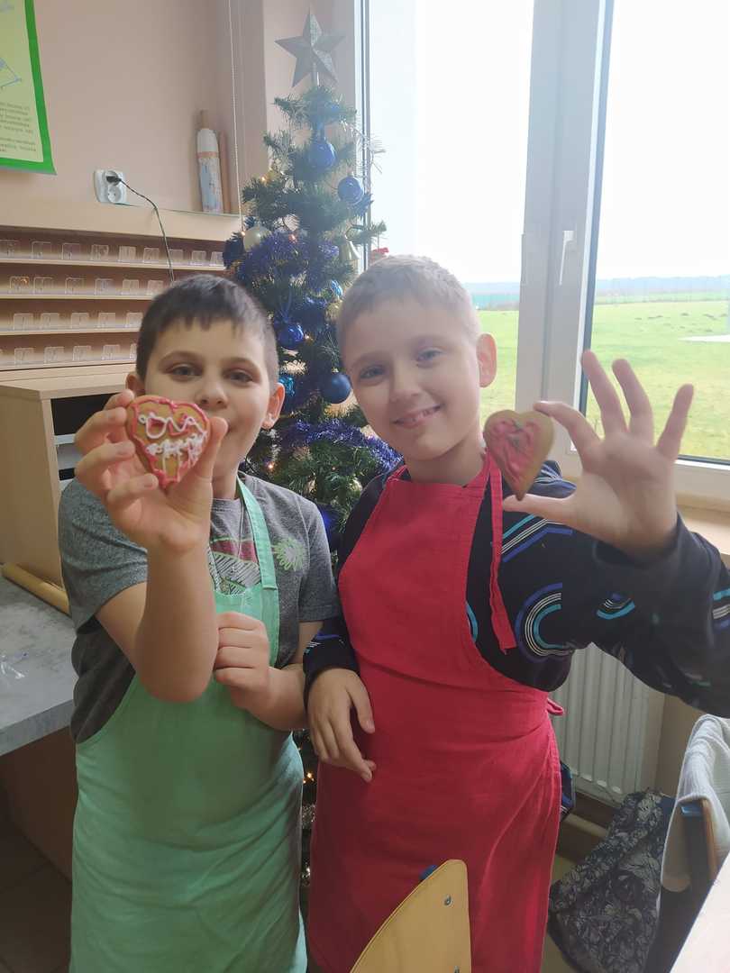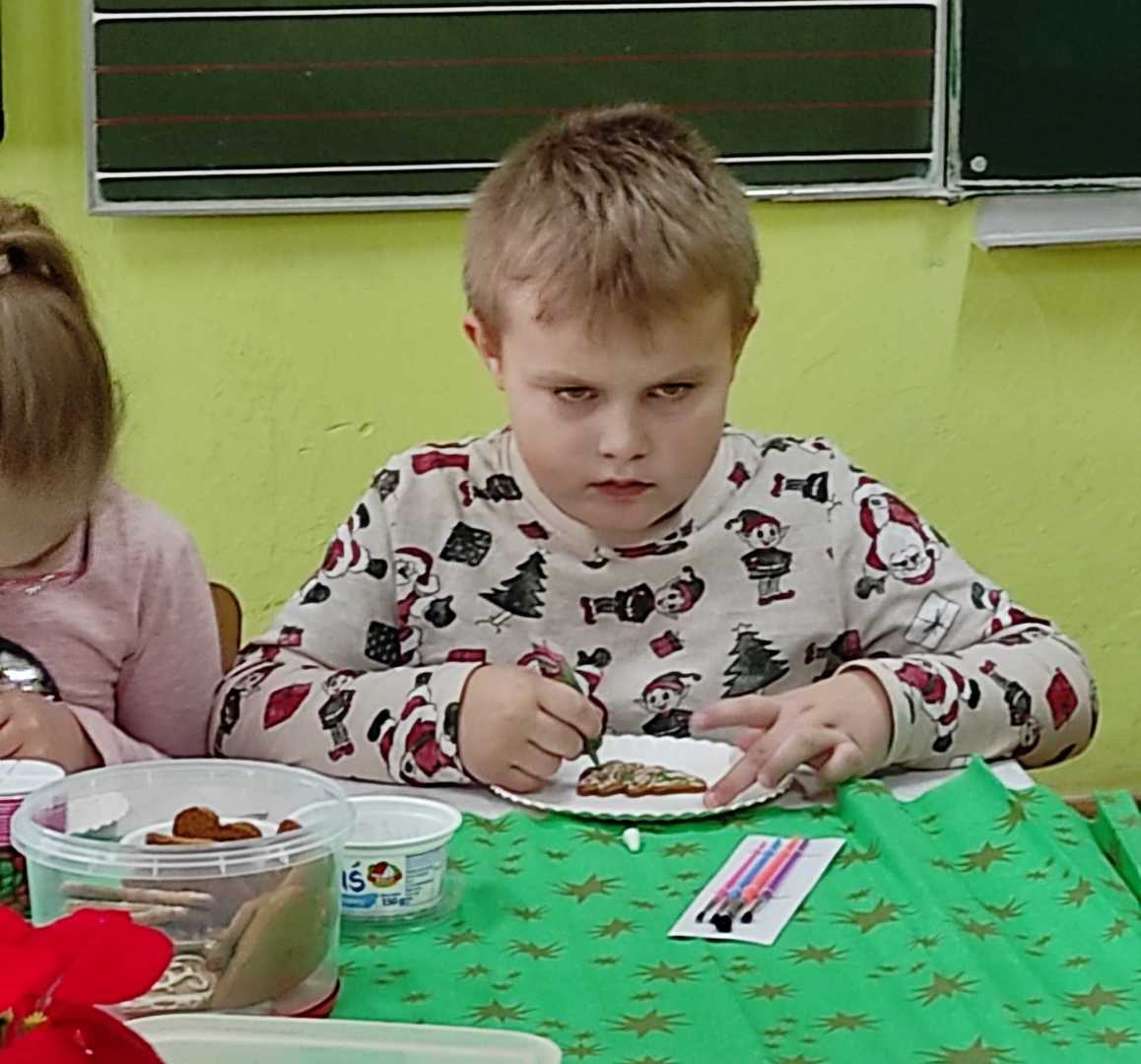 Uczniowie klasy 0, I, II i III rozpoczęli przygotowania do świąt na słodko. Już 13 grudnia wspólnie ze swoimi mamami i babciami dekorowali pierniczki. Wcześniej mamy i babcie upiekły je. Dzieci z zapałem i radością ozdabiały choinki, gwiazdy, serduszka i inne kształty. Do ozdoby pierniczków użyły kolorowego lukru i kolorowych posypek, słuchając świątecznych piosenek. Uczniowie klasy IV samodzielnie wykonali pierniki, wałkowali ciasto, wykrawali z ciasta różne figurki. Po upieczeniu dekorowali pierniki, a w szkole unosił się korzenny zapach, zapach nadchodzących świąt.
