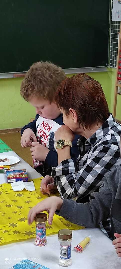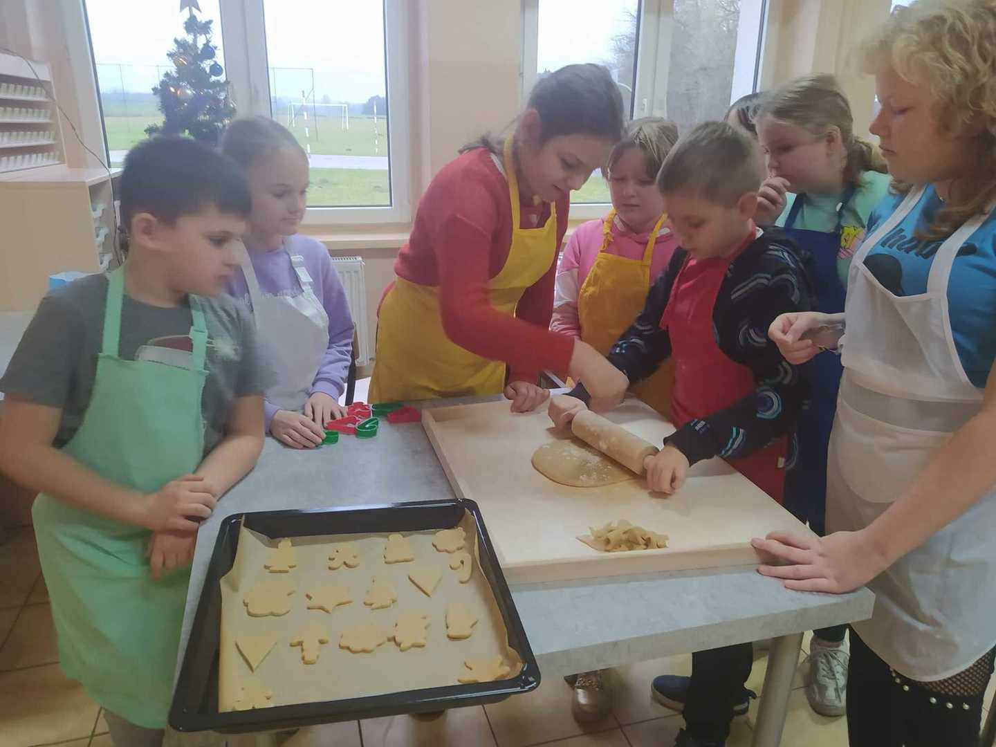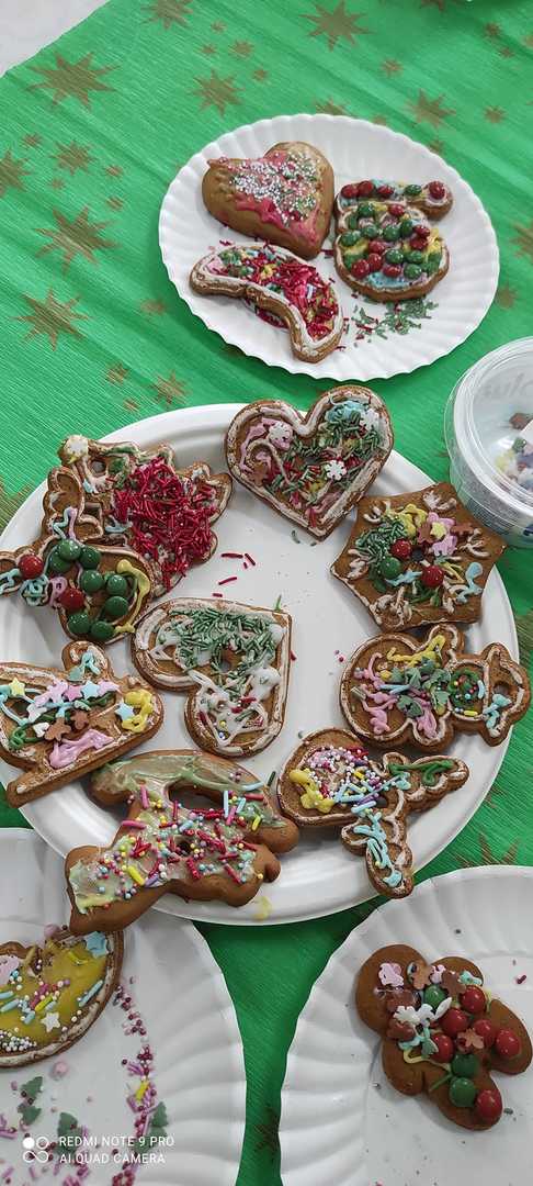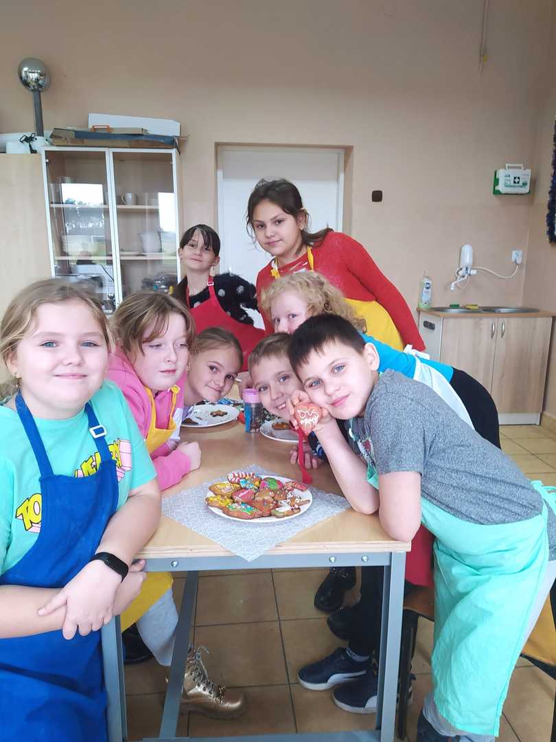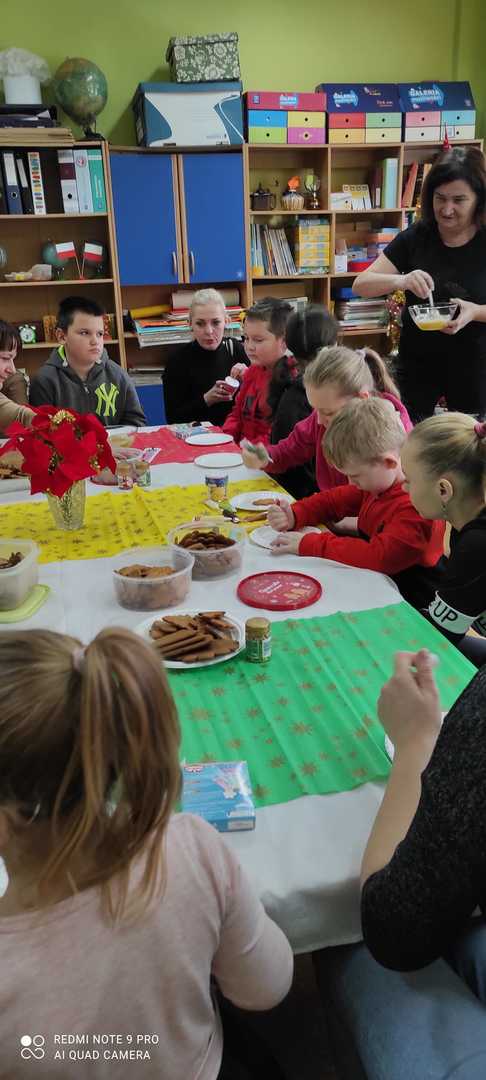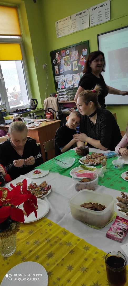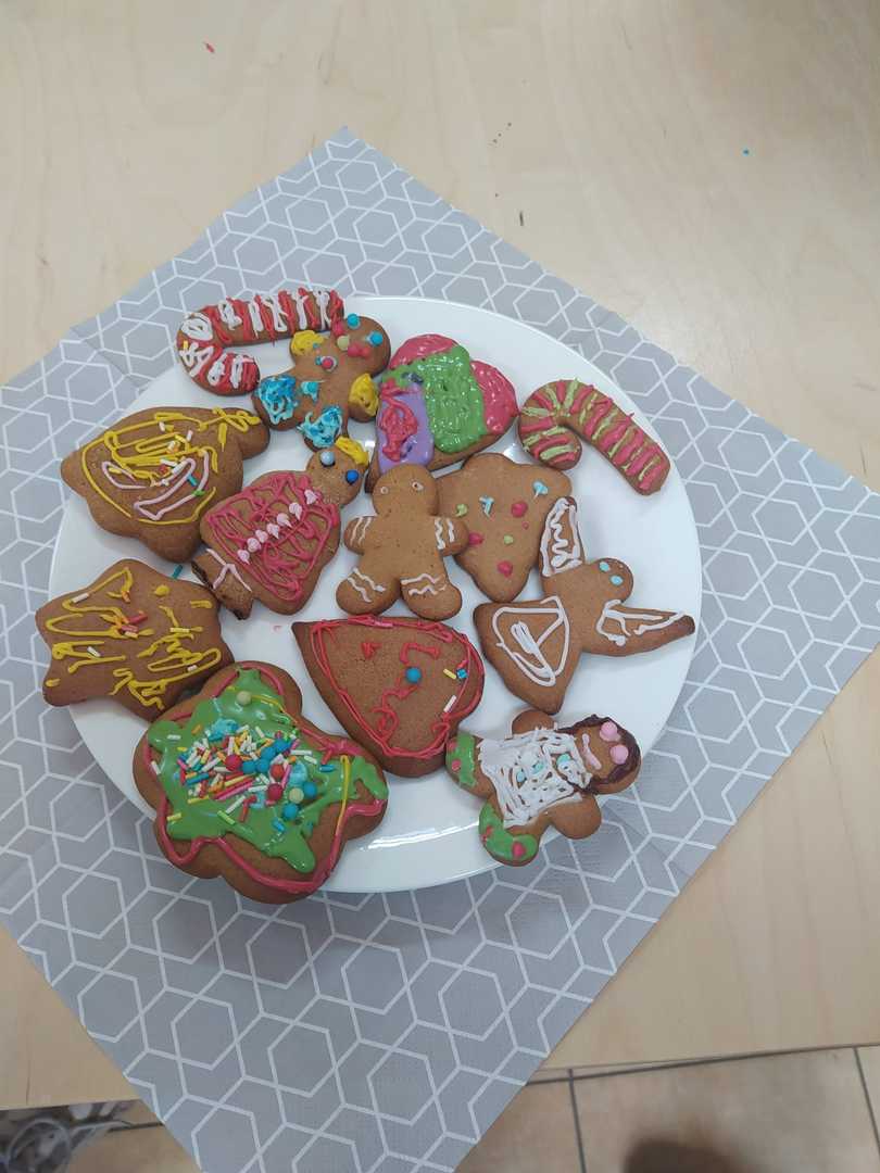 Uczniowie klasy 0, I, II i III rozpoczęli przygotowania do świąt na słodko. Już 13 grudnia wspólnie ze swoimi mamami i babciami dekorowali pierniczki. Wcześniej mamy i babcie upiekły je. Dzieci z zapałem i radością ozdabiały choinki, gwiazdy, serduszka i inne kształty. Do ozdoby pierniczków użyły kolorowego lukru i kolorowych posypek, słuchając świątecznych piosenek. Uczniowie klasy IV samodzielnie wykonali pierniki, wałkowali ciasto, wykrawali z ciasta różne figurki. Po upieczeniu dekorowali pierniki, a w szkole unosił się korzenny zapach, zapach nadchodzących świąt.