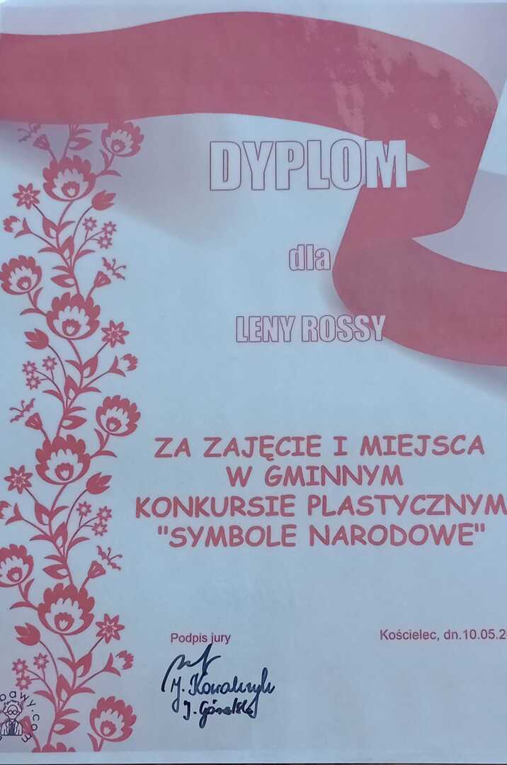 W miesiącu maju 2023 r. Zespół Szkolno -Przedszkolny w Kościelcu zorganizował konkurs dla dzieci w wieku przedszkolnym z gminy Kościelec "Symbole Narodowe". Regulamin przewidywał wspólną pracę uczestników z rodzicami. 11.05.2023 r. dowiedzieliśmy się, że Lenka Rossa z naszego oddziału przedszkolnego zdobyła I miejsce w konkursie. GRATULUJEMY ❗❗❗ Nagroda została wręczona dziewczynce w szkole.