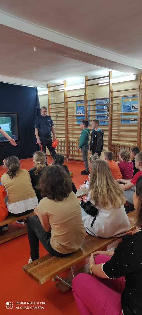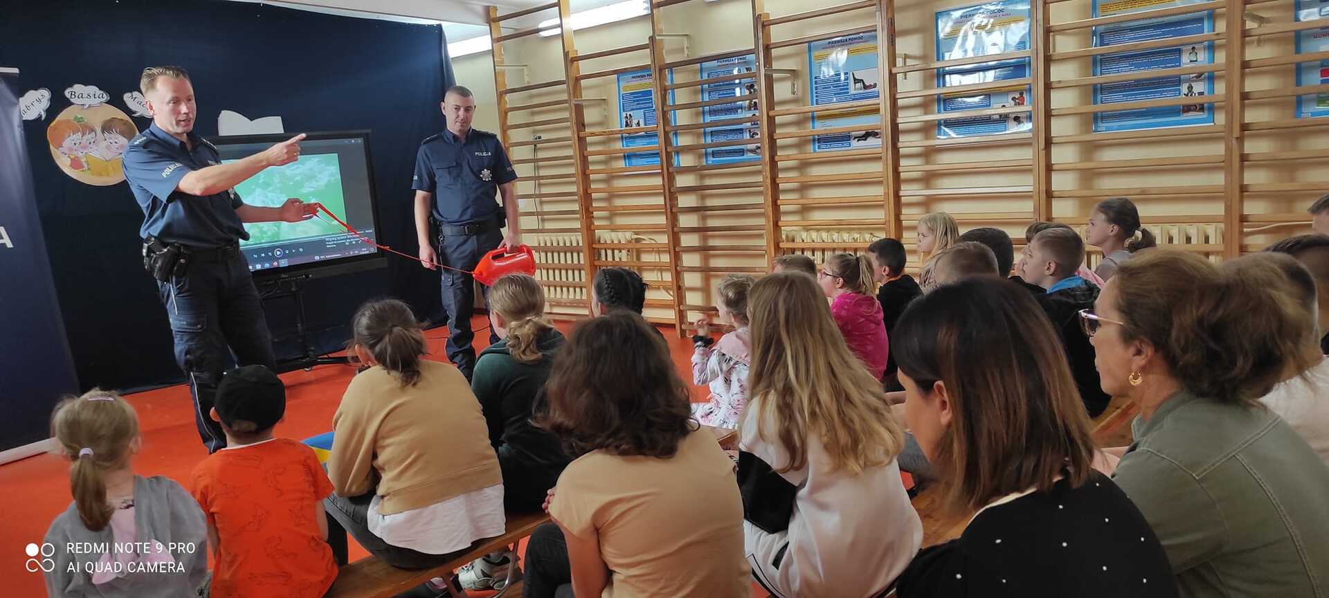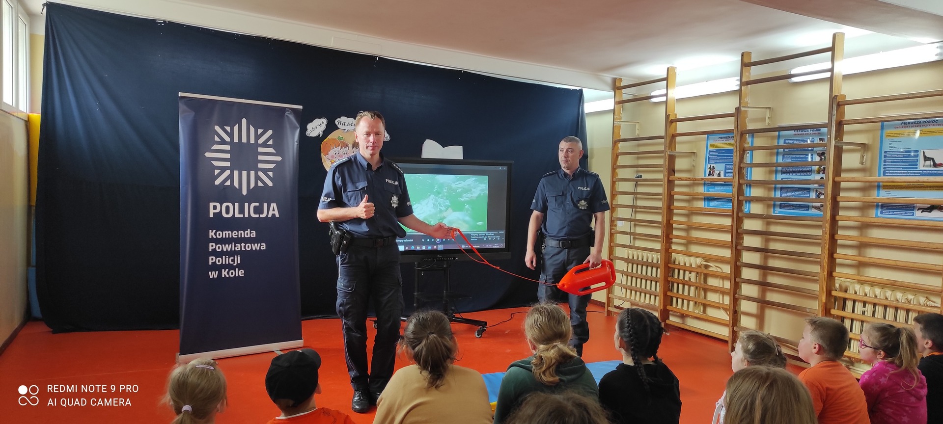 Zbliżają się wakacje, dlatego naszą szkołę dzisiaj odwiedzili policjanci Powiatowej Komendy Policji w Kole, aby przypomnieć uczniom zasady bezpiecznego zachowania się podczas letniego wypoczynku. Prowadzący spotkanie policjant, odpowiedzialny za prewencję, przypomniał dzieciom zasady bezpiecznych zabaw nad wodą, w tym zakazie kąpieli na niestrzeżonych akwenach wodnych lub bez opieki osób dorosłych. Opowiedział, jak należy zachowywać się podczas wypoczynku w górach oraz jak się bronić przed niebezpiecznymi zwierzętami. Na koniec uczniowie obejrzeli sugestywny film, na którym zobaczyli emocje tonącego człowieka. Wskazówki od Policjantów spotkały się z dużym zainteresowaniem ze strony naszych uczniów. Chętnie odpowiadali na pytania i aktywnie uczestniczyli w scence instruktażowej. Dziękujemy za wartościową prelekcję 🙂.