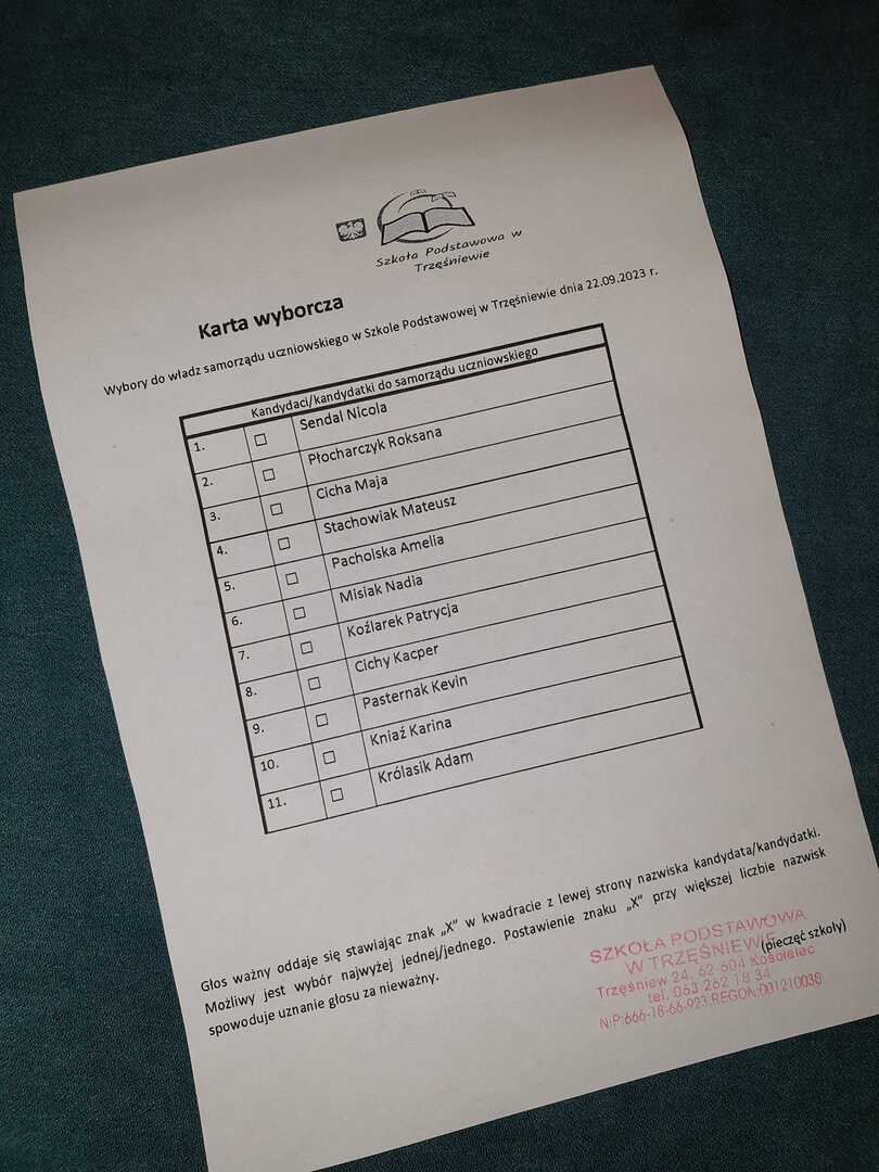 Wybory do Samorządu Uczniowskiego 2023/2024 22 września w naszej szkole odbyły się demokratyczne wybory do Samorządu Uczniowskiego. Na karcie wyborczej znalazło się 11 kandydatów. Do głosowania przystąpili: uczniowie klas III-VIII, dyrektor, nauczyciele i pracownicy obsługi SP Trzęśniew. Po zakończonym głosowaniu zebrała się komisja i przeliczyła oddane głosy. Największą ilość głosów otrzymali: Kevin Pasternak, Karina Kniaź, Kacper Cichy, Roksana Płocharczyk oraz Nadia Misiak. Obecny skład Samorządu Uczniowskiego: Przewodniczący – Kacper Cichy Zastępca – Karina Kniaź Sekretarz – Nadia Misiak Członek SU – Kevin Pasternak Członek SU – Roksana Płocharczyk Zwycięzcom życzymy wielu ciekawych pomysłów i powodzenia w pracy na rzecz szkoły.
