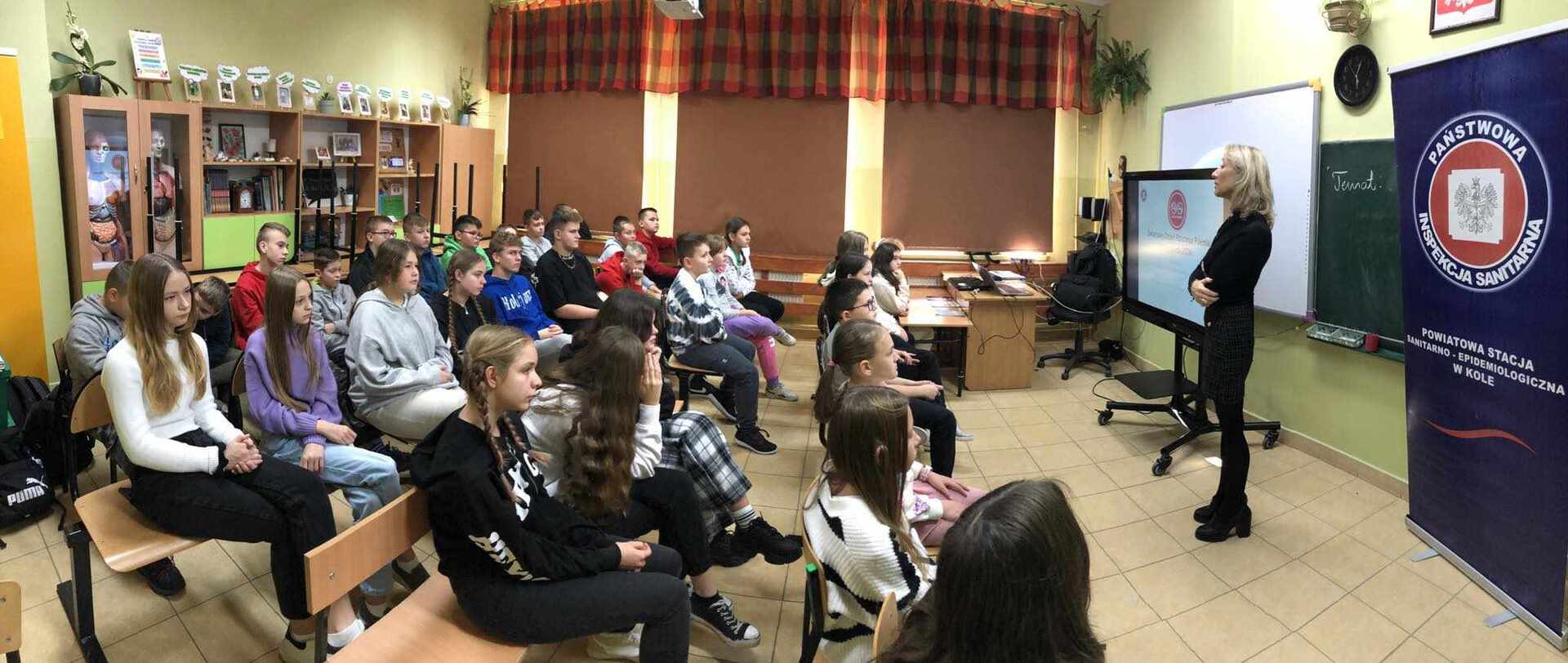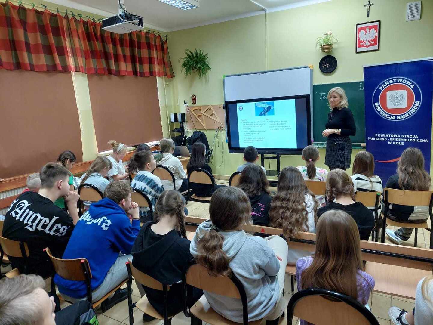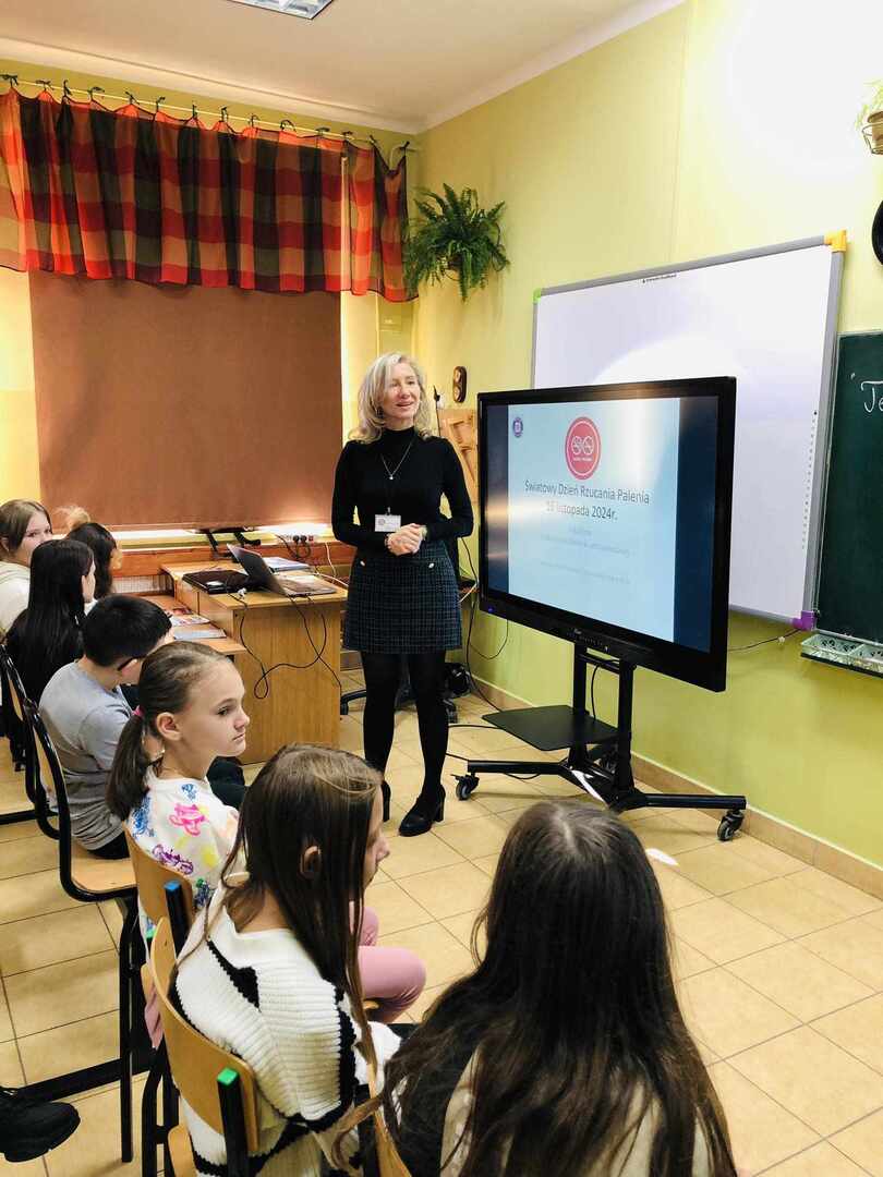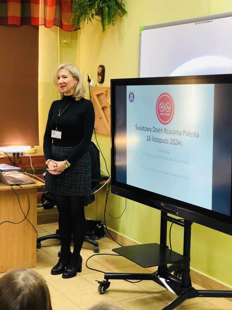 W związku z obchodzonym Światowym Dniem Rzucania Palenia 14.11.2023 r., na zaproszenie dyrektora szkoły, przybyła przedstawicielka Stacji Sanitarno-Epidemiologicznej w Kole, pani Krystyna Wojdak, w celu przeprowadzenia prelekcji na temat profilaktyki dotyczącej szkodliwych skutków palenia tytoniu. W ciekawy sposób przedstawiła prezentację na wymieniony temat. Młodzież dowiedziała się, jakie choroby wywołuje palenie tytoniu, poznała skład dymu tytoniowego i jego wpływ na organizm ludzki, zapoznana została z cyklem uzależnienia od nikotyny oraz pojęciem czynnego i biernego palenia. W spotkaniu uczestniczyli uczniowie klas IV-VIII. Bardzo dziękujemy prowadzącej za rzeczową i interesującą prelekcję.