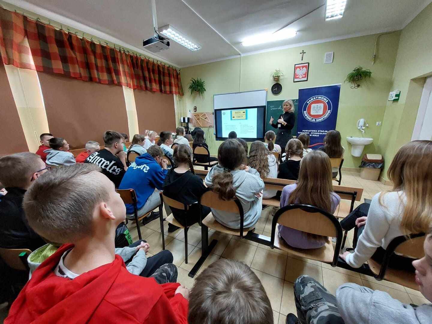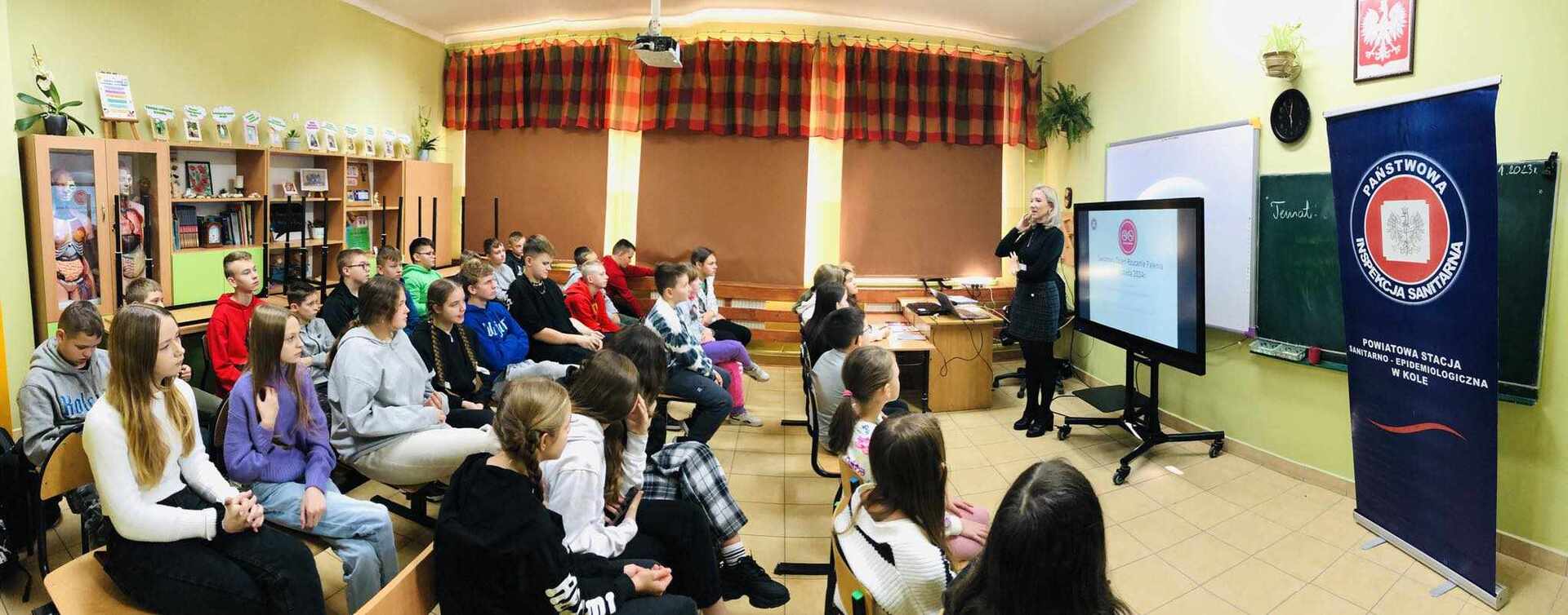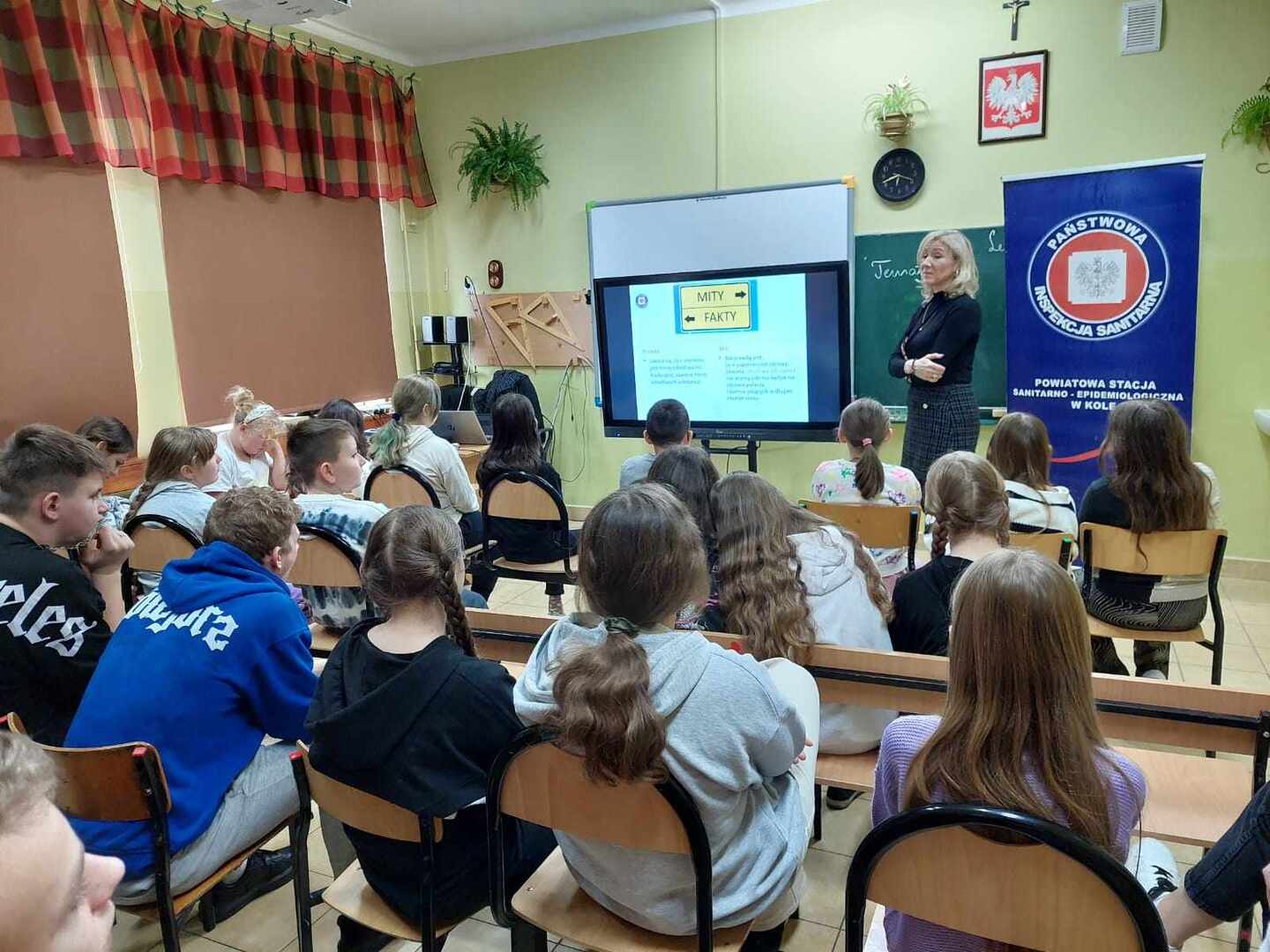 W związku z obchodzonym Światowym Dniem Rzucania Palenia 14.11.2023 r., na zaproszenie dyrektora szkoły, przybyła przedstawicielka Stacji Sanitarno-Epidemiologicznej w Kole, pani Krystyna Wojdak, w celu przeprowadzenia prelekcji na temat profilaktyki dotyczącej szkodliwych skutków palenia tytoniu. W ciekawy sposób przedstawiła prezentację na wymieniony temat. Młodzież dowiedziała się, jakie choroby wywołuje palenie tytoniu, poznała skład dymu tytoniowego i jego wpływ na organizm ludzki, zapoznana została z cyklem uzależnienia od nikotyny oraz pojęciem czynnego i biernego palenia. W spotkaniu uczestniczyli uczniowie klas IV-VIII. Bardzo dziękujemy prowadzącej za rzeczową i interesującą prelekcję.