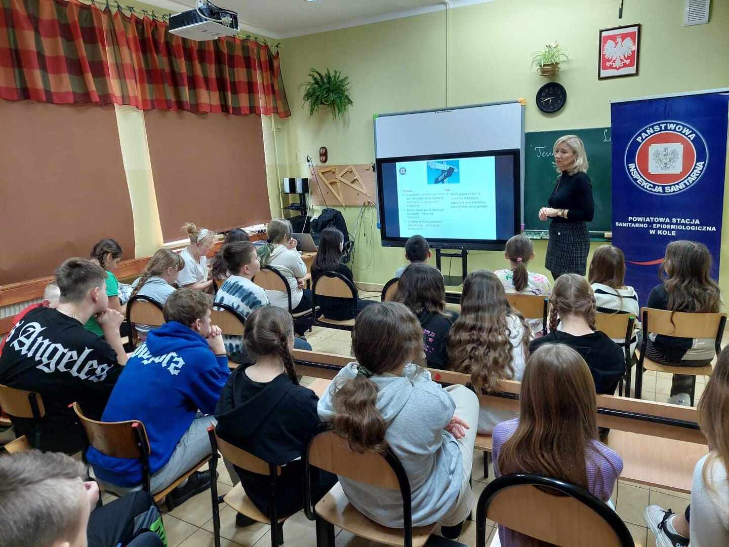 Prelekcja pracownika Stacji Sanitarno-Epidemiologicznej w Kole dotycząca szkodliwych skutków palenia tytoniu