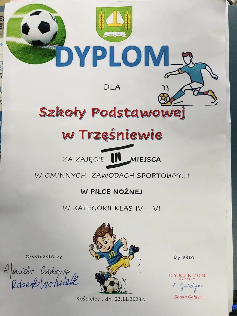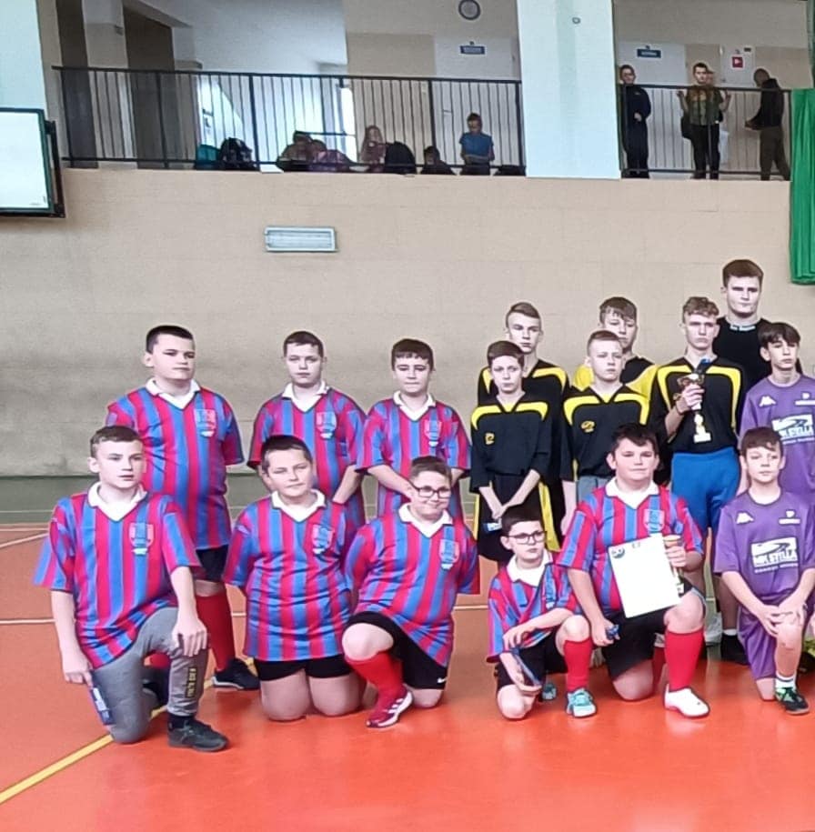 Aktywność fizyczna, współpraca w grupie, rozwijanie swoich pasji i spełnianie marzeń, to tylko niektóre z elementów towarzyszących grze w piłkę nożną. Nasi uczniowie rozwijając swoje zainteresowania, wzięli udział w Gminnych Zawodach Sportowych w piłce nożnej, które odbyły się 23 listopada w Kościelcu. Spotkali się z kolegami z Zespołu Szkolno - Przedszkolnego w Kościelcu i ze Szkoły Podstawowej w Ruszkowie Pierwszym. Odbyły się mecze w kategorii klas IV-VI i klas VII-VIII. Młodsi chłopcy zdobyli III miejsce, a starsi wywalczyli II miejsce. Najlepszymi naszymi strzelcami byli - Kevin Pasternak, uczeń klasy VIII i Oskar Pasternak z klasy VI. Zastępca Wójta, pani Patrycja Zielińska wręczyła drużynom Puchar Wójta Gminy Kościelec, a pani dyrektor Dorota Gałdyn każdemu uczestnikowi słodki upominek. Dziękujemy za miłą atmosferę, gratulujemy naszym uczniom i ich przeciwnikom wspaniałej gry.