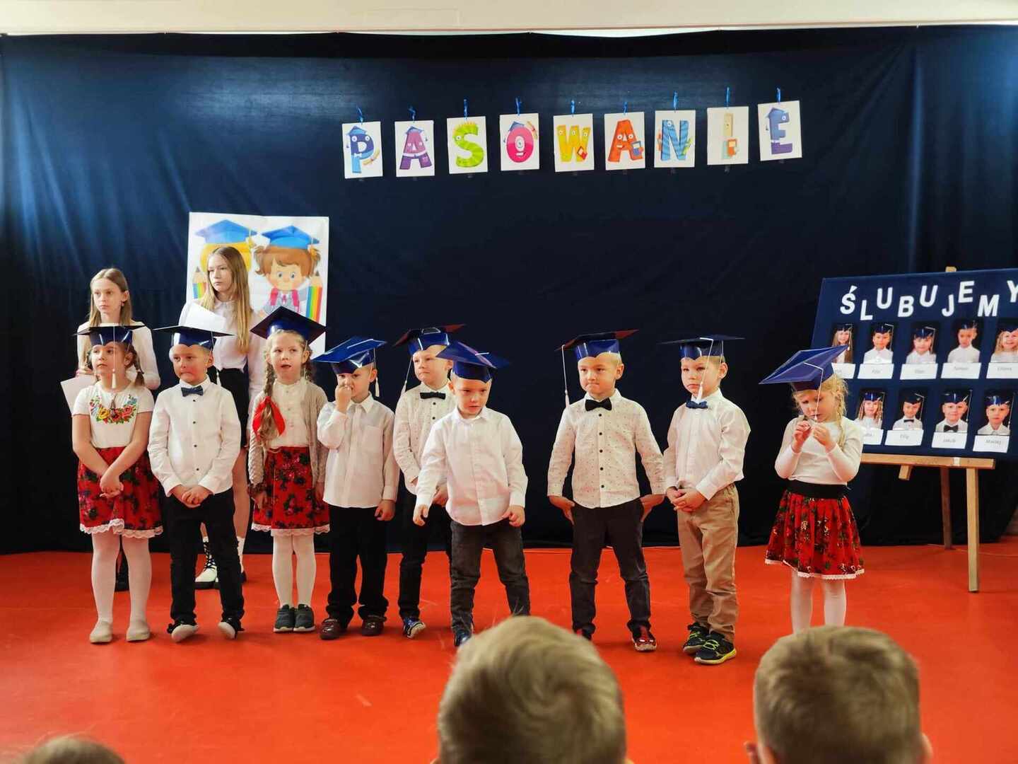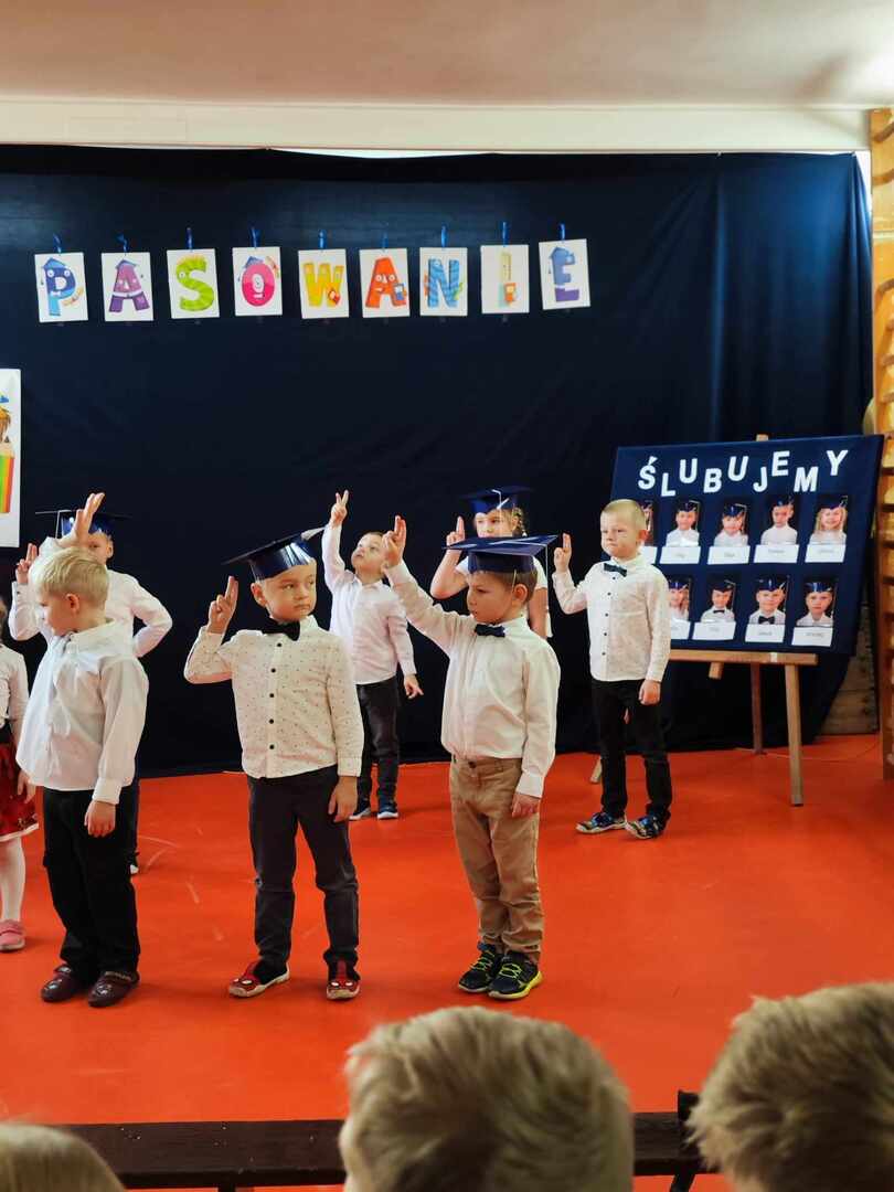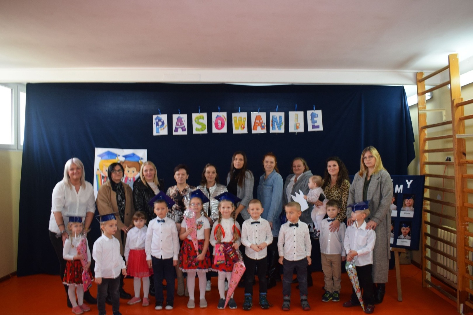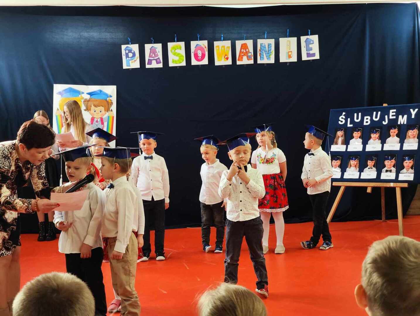 W dniu 27.11.2023 r. w naszej szkole odbyła się uroczystość pasowania na przedszkolaka. Dzieci zaprosiły rodziców, panią dyrektor - Katarzynę Czartek, kolegów z klas I - III z wychowawczyniami. Pod okiem wychowawczyni, pani Joanny Czartek, przygotowały część artystyczną, recytując okolicznościowe wierszyki, śpiewając piosenki oraz prezentując tańce. Pani Dyrektor przyjęła przyrzeczenie dzieci i rodziców, po czym nastąpiło uroczyste pasowanie na przedszkolaka. Wychowawczyni wręczyła dzieciom dyplomy, rodzice rożki ze słodyczami, a pani Dyrektor torebeczki z drobnymi upominkami. Po części artystycznej mamy przygotowały słodki poczęstunek. Do dziś wspominamy ten dzień z uśmiechem! Dziękujemy rodzicom za pomoc w przygotowaniu uroczystości oraz dziewczynkom z klasy VI, Nadii i Patrycji, za poprowadzenie uroczystości!