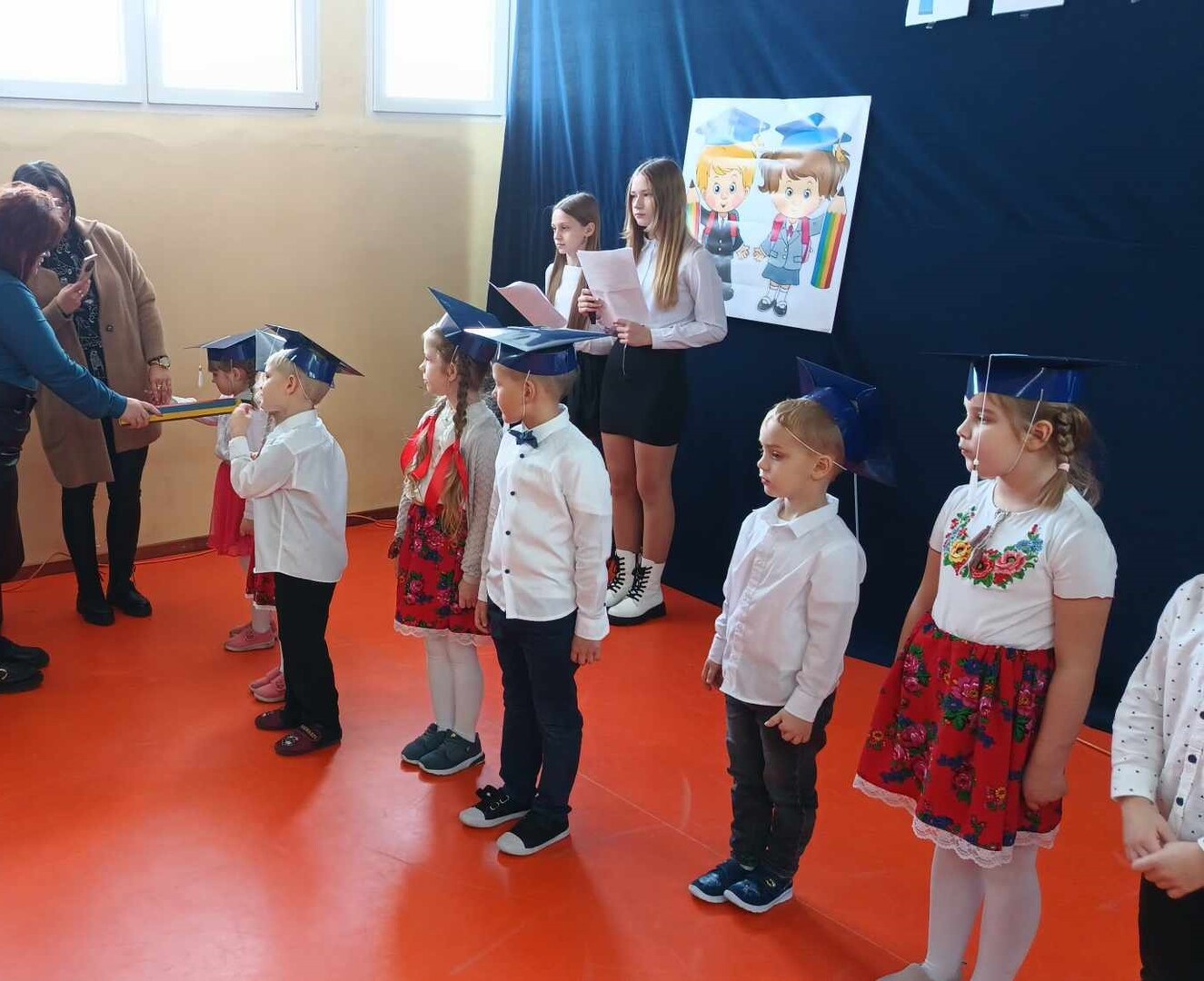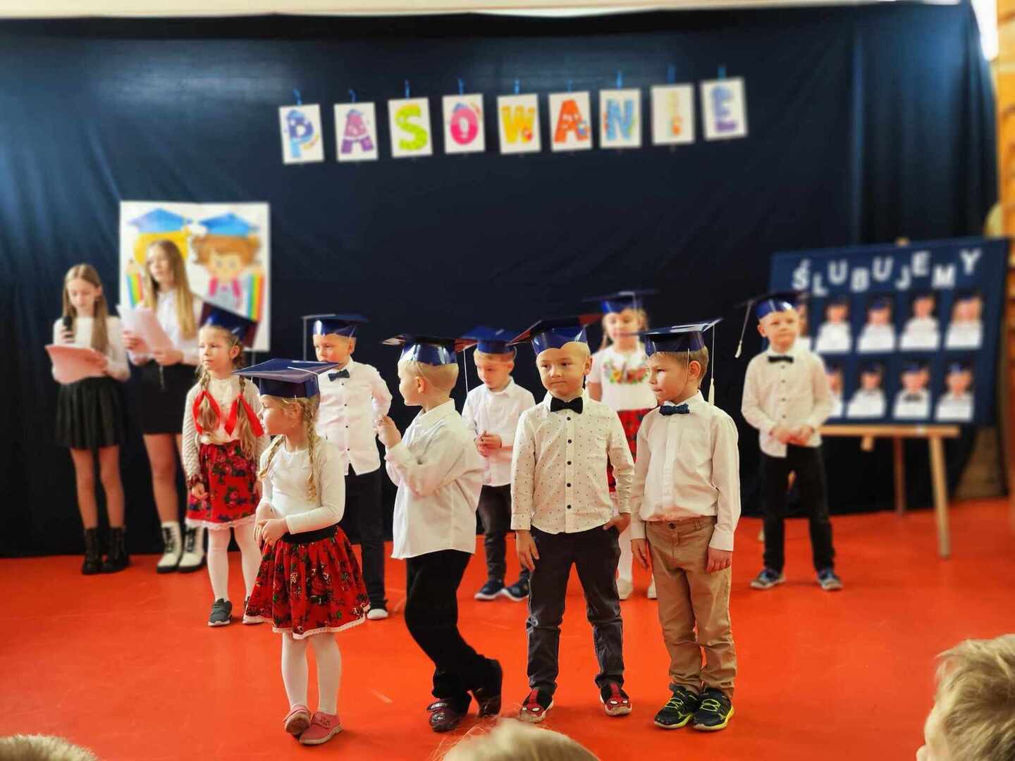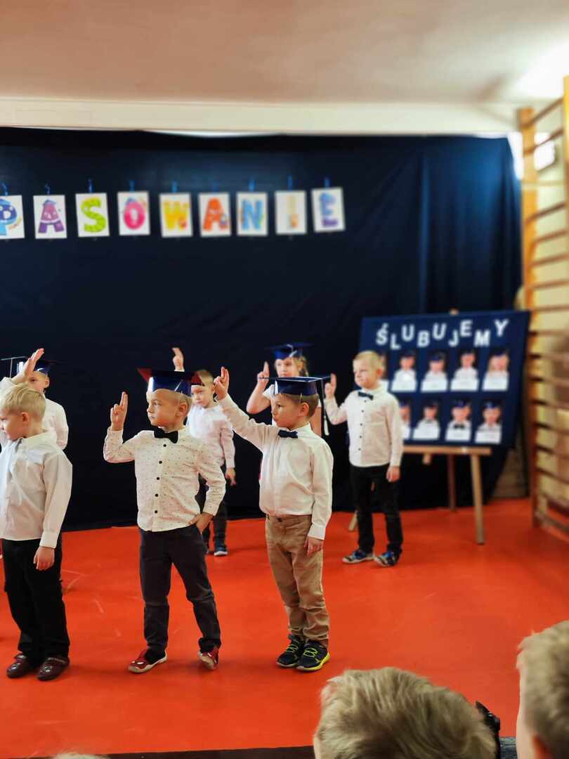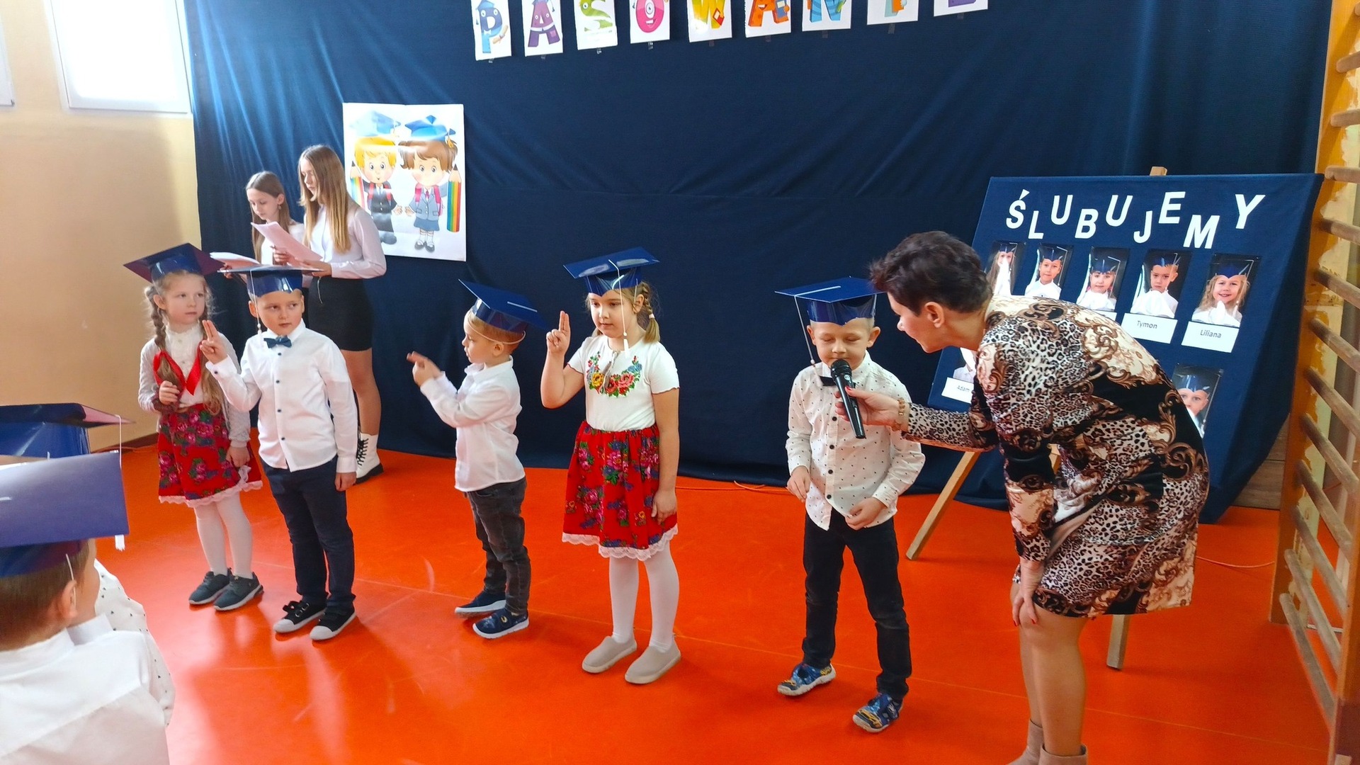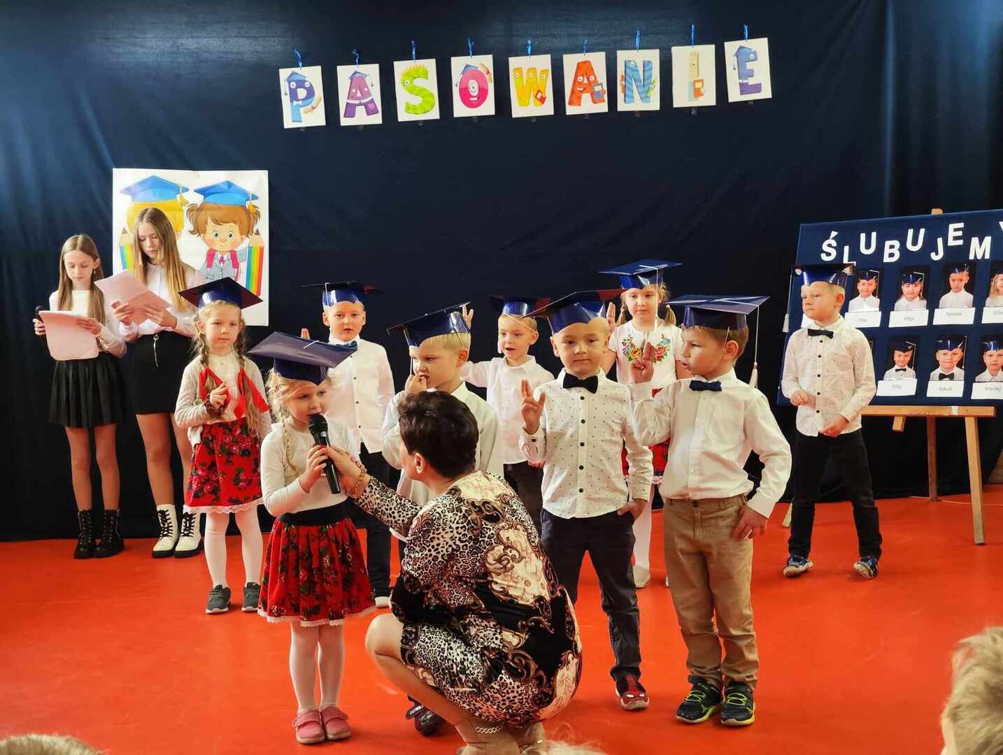 W dniu 27.11.2023 r. w naszej szkole odbyła się uroczystość pasowania na przedszkolaka. Dzieci zaprosiły rodziców, panią dyrektor - Katarzynę Czartek, kolegów z klas I - III z wychowawczyniami. Pod okiem wychowawczyni, pani Joanny Czartek, przygotowały część artystyczną, recytując okolicznościowe wierszyki, śpiewając piosenki oraz prezentując tańce. Pani Dyrektor przyjęła przyrzeczenie dzieci i rodziców, po czym nastąpiło uroczyste pasowanie na przedszkolaka. Wychowawczyni wręczyła dzieciom dyplomy, rodzice rożki ze słodyczami, a pani Dyrektor torebeczki z drobnymi upominkami. Po części artystycznej mamy przygotowały słodki poczęstunek. Do dziś wspominamy ten dzień z uśmiechem! Dziękujemy rodzicom za pomoc w przygotowaniu uroczystości oraz dziewczynkom z klasy VI, Nadii i Patrycji, za poprowadzenie uroczystości!