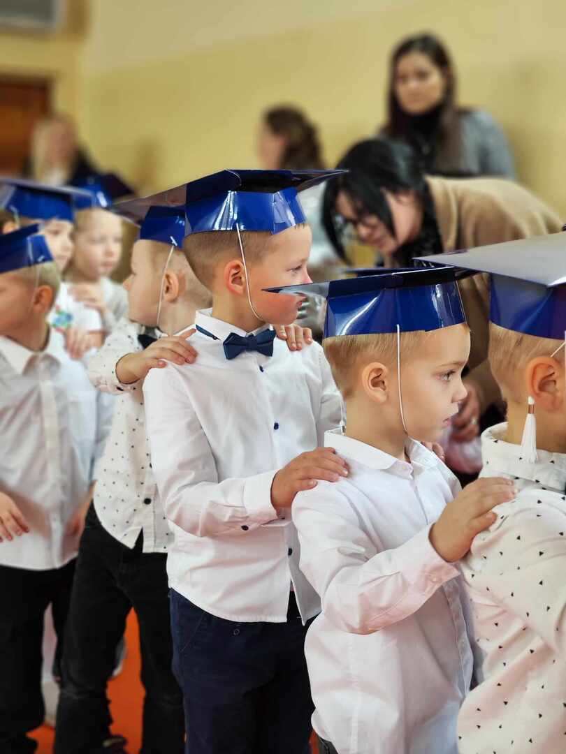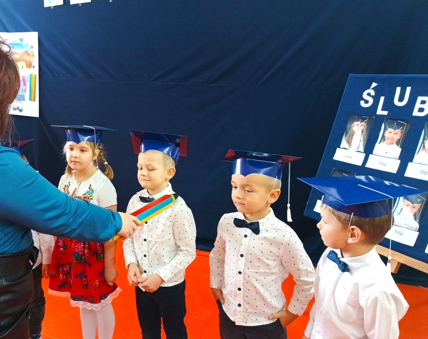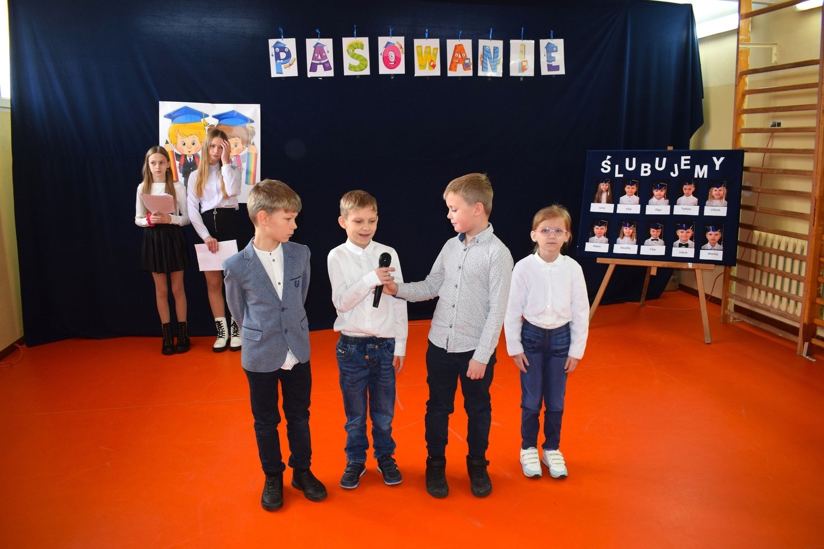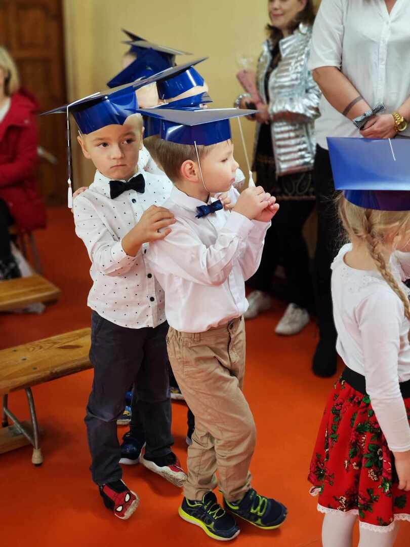 W dniu 27.11.2023 r. w naszej szkole odbyła się uroczystość pasowania na przedszkolaka. Dzieci zaprosiły rodziców, panią dyrektor - Katarzynę Czartek, kolegów z klas I - III z wychowawczyniami. Pod okiem wychowawczyni, pani Joanny Czartek, przygotowały część artystyczną, recytując okolicznościowe wierszyki, śpiewając piosenki oraz prezentując tańce. Pani Dyrektor przyjęła przyrzeczenie dzieci i rodziców, po czym nastąpiło uroczyste pasowanie na przedszkolaka. Wychowawczyni wręczyła dzieciom dyplomy, rodzice rożki ze słodyczami, a pani Dyrektor torebeczki z drobnymi upominkami. Po części artystycznej mamy przygotowały słodki poczęstunek. Do dziś wspominamy ten dzień z uśmiechem! Dziękujemy rodzicom za pomoc w przygotowaniu uroczystości oraz dziewczynkom z klasy VI, Nadii i Patrycji, za poprowadzenie uroczystości!