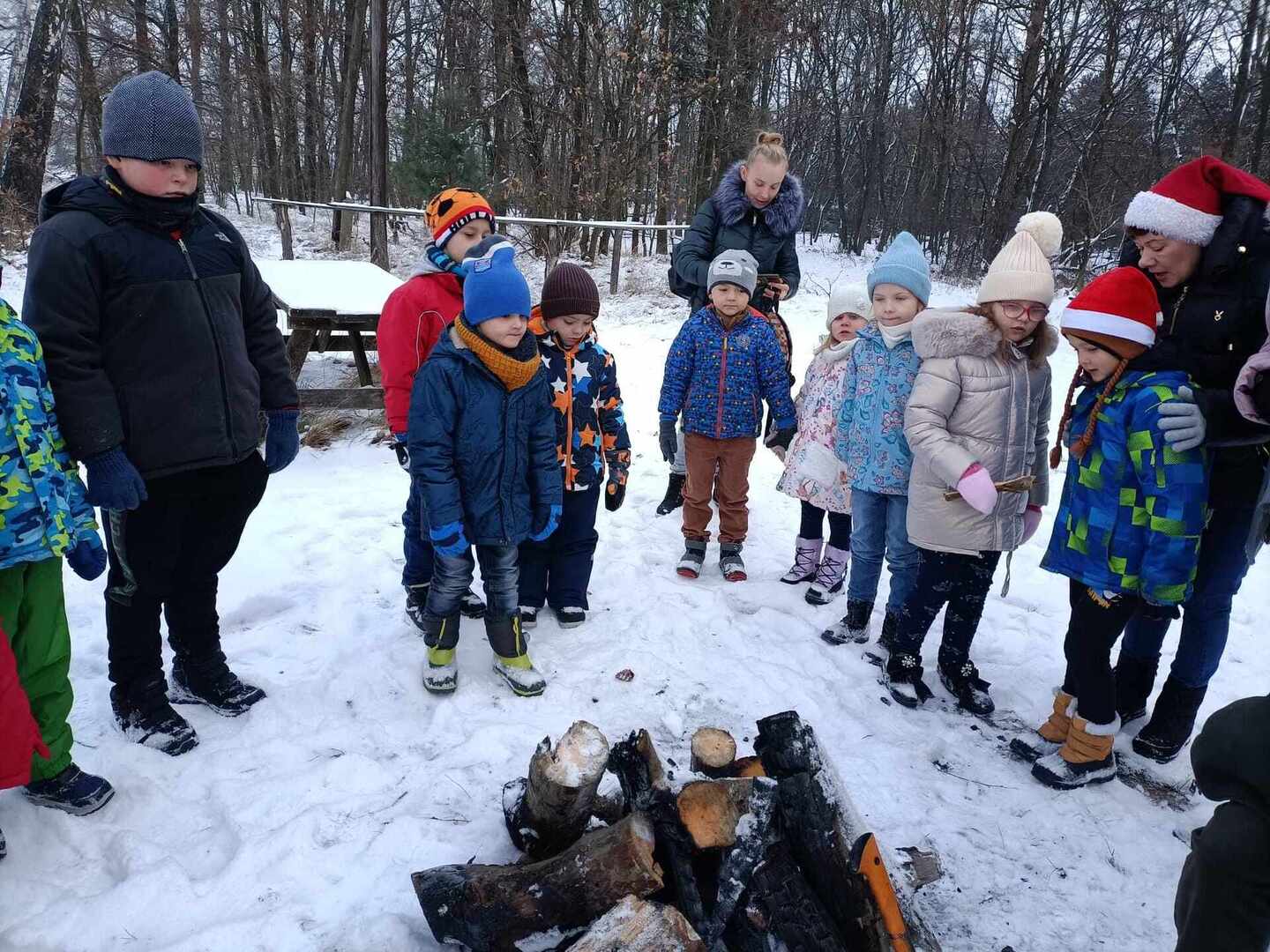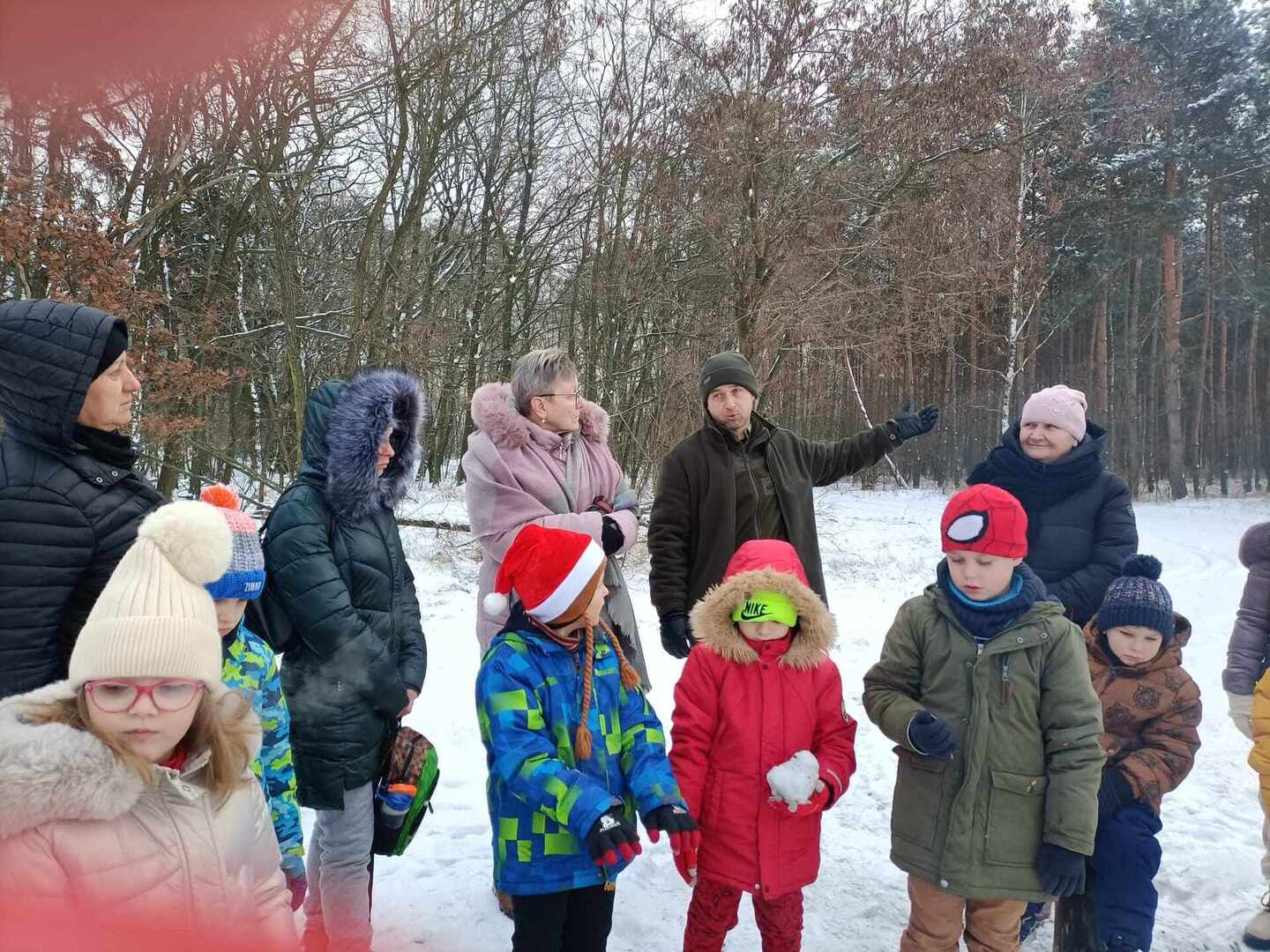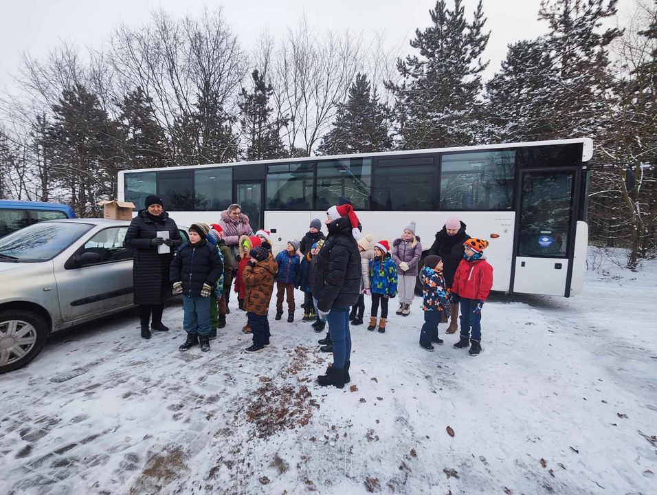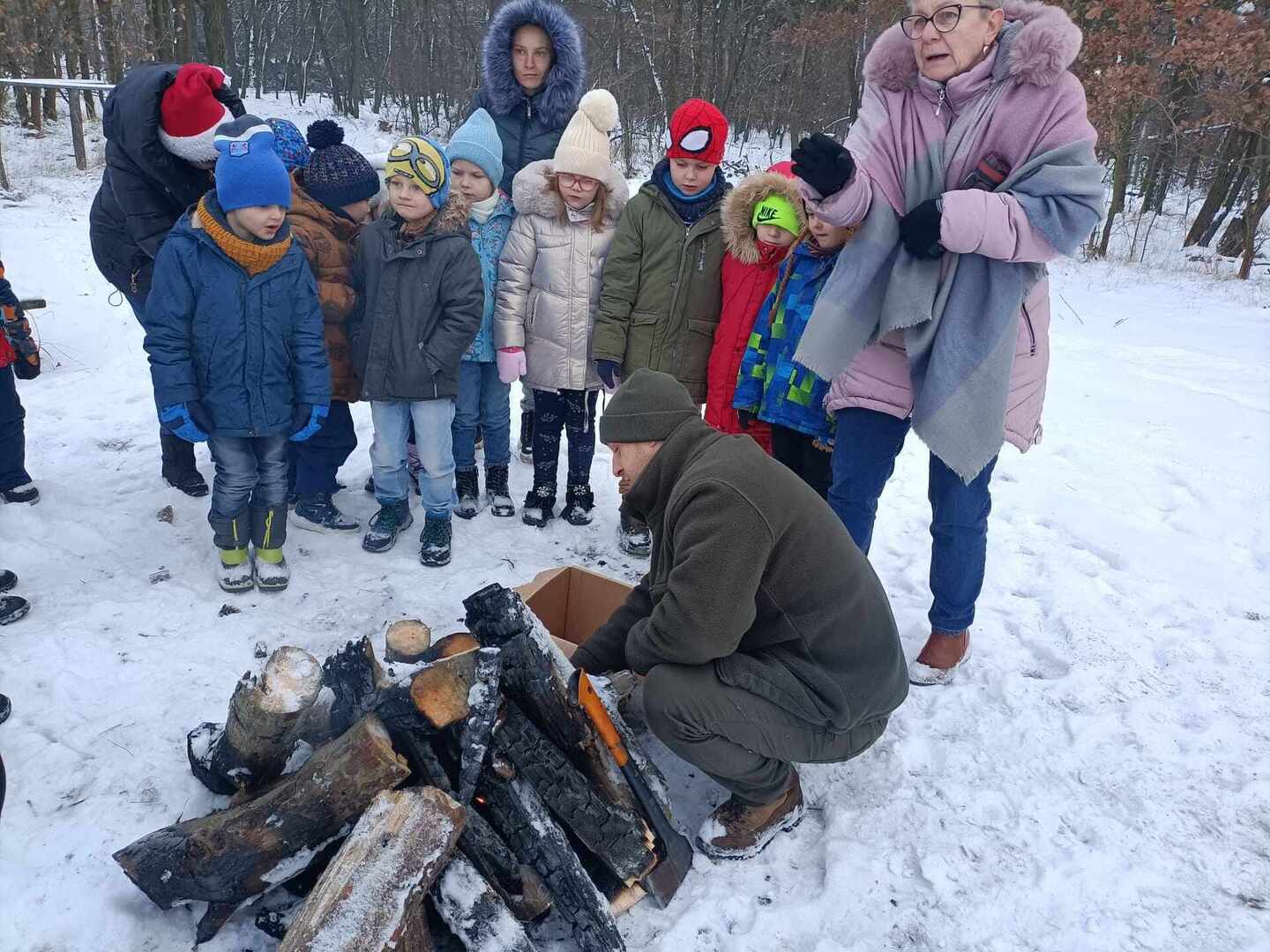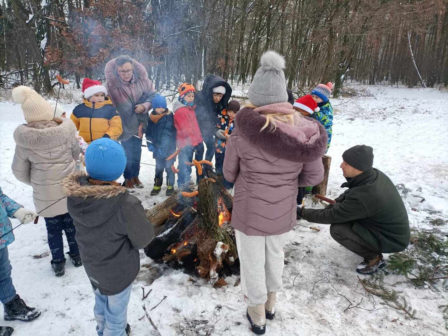 Poznanie pracy leśniczego, integrowanie się dzieci w trakcie wspólnie spędzonego czasu i pielęgnowanie zwyczajów mikołajkowych, to cele wyjazdu w dniu 6 grudnia uczniów klas 0, I, II i III wraz z wychowawczyniami do leśniczówki w Dąbrowicach Starych. Dziękujemy panu leśniczemu Bartoszowi Bekalarczyk, który opowiedział nam o swojej pracy oraz wiele ciekawostek, jakie kryją lasy w naszej najbliższej okolicy. W czasie spotkania dzieci dowiedziały się, jakie zwierzęta żyją w naszych lasach, w jaki sposób dokarmia się te zwierzęta oraz jakie gatunki drzew występują w środowisku leśnym. Na śniegu znaleźliśmy wiele śladów leśnych zwierząt. Po spacerze czekała nas niespodzianka – ognisko i pieczone kiełbasek. Wielką radość sprawił nam, w czasie tego wyjazdu, MIKOŁAJ, który odnalazł nas w lesie i obdarował wszystkich prezentami. Dziękujemy mamom z Rady Rodziców za pomoc w organizacji wyjazdu. Szczególne podziękowania kierujemy do MIKOŁAJA, który sprawił nam wielką radość. Wycieczka dostarczyła dzieciom wiele niezapomnianych wrażeń i wspomnień.