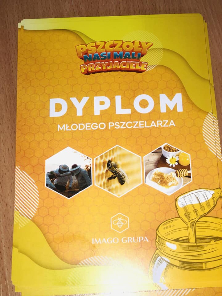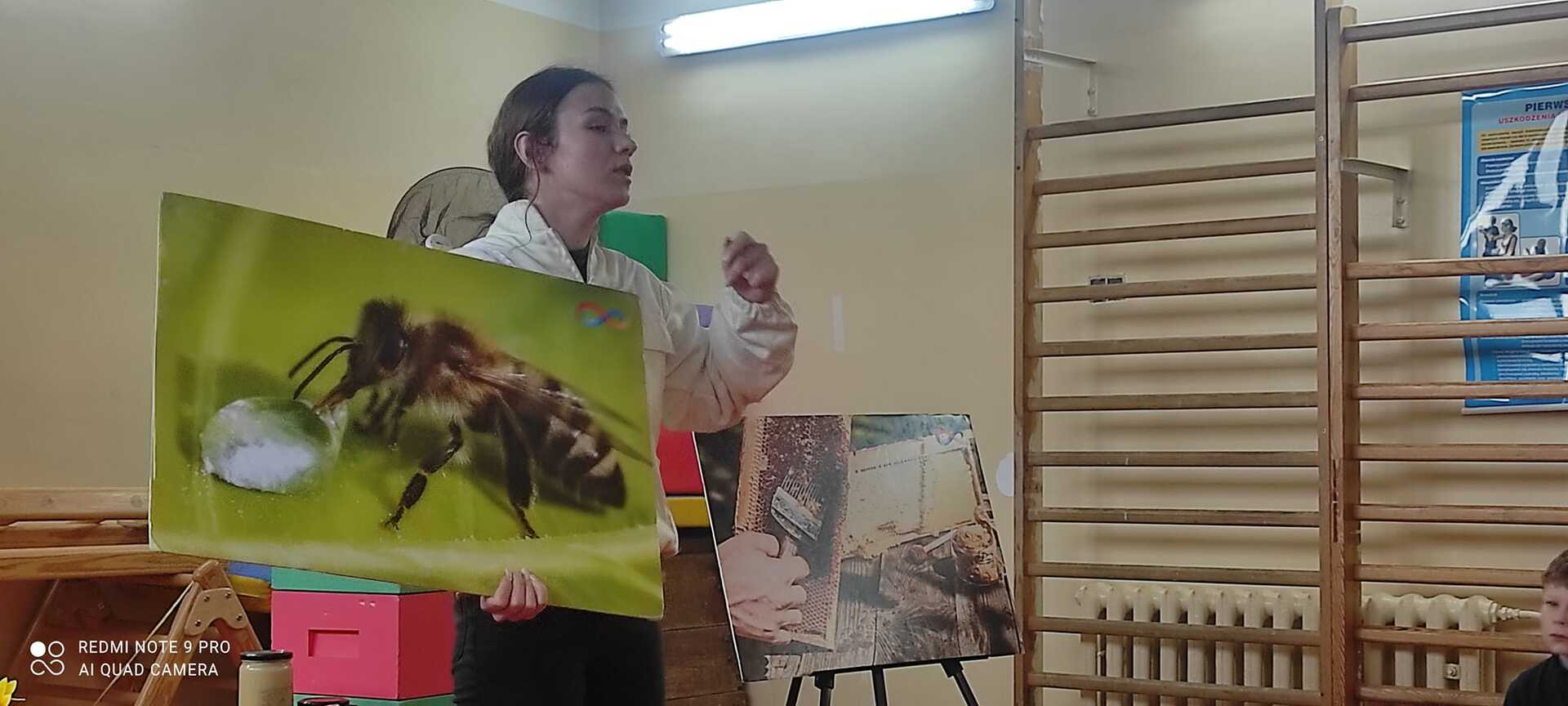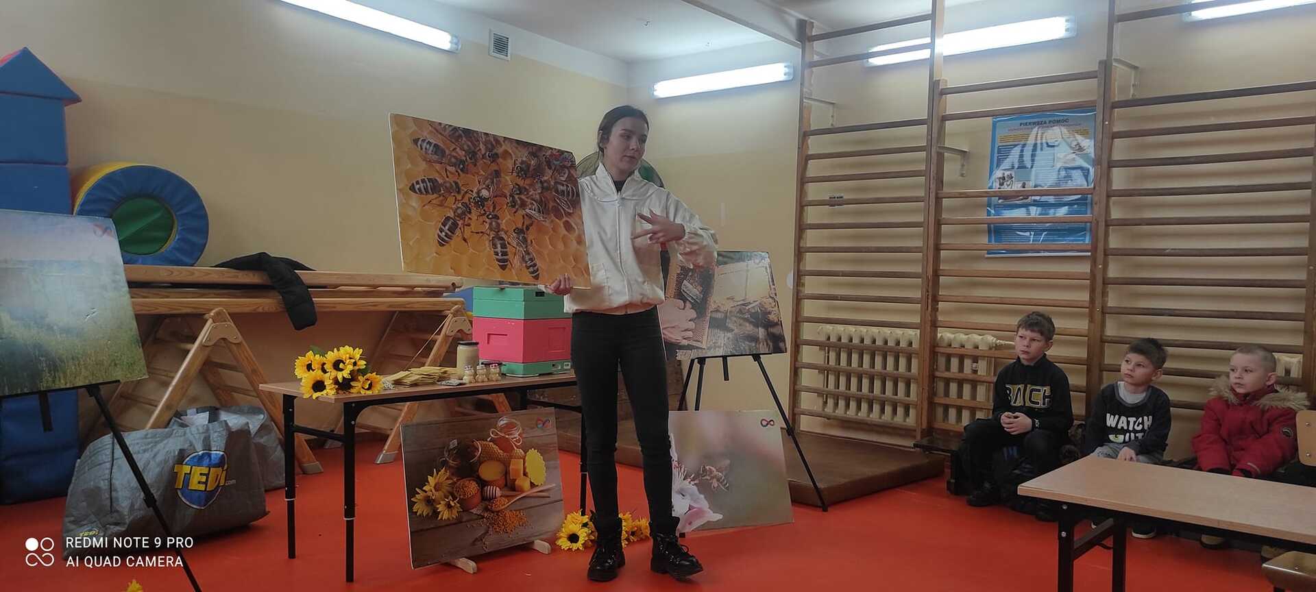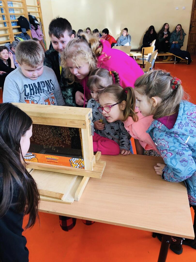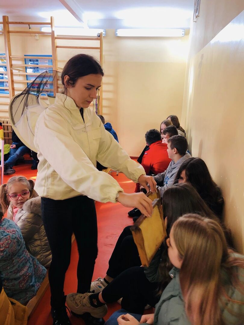 23 stycznia 2024 r. uczniowie naszej szkoły wzięli udział w warsztatach pszczelarskich zorganizowanych przez Grupę IMAGO, rodzinnie od wielu lat związaną z hodowlą pszczół. Prowadząca świetnie przeprowadzila żywą lekcję przyrody. Przybliżyła życie wymienionych owadów i role, jakie pełnią poszczególne osobniki (królowa, robotnice, trutnie). Zapoznała dzieci z procedurą powstawania miodu. Wszyscy mieli okazję obejrzenia żywych pszczół, a wśród nich królowej. Uczestnicy spotkania samodzielnie wykonali świeczki z wosku pszczelego. Na pamiątkę otrzymali dyplomy i odznaki pszczelarza. Był to pożytecznie spędzony czas w miłej atmosferze.