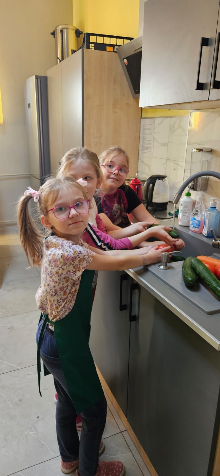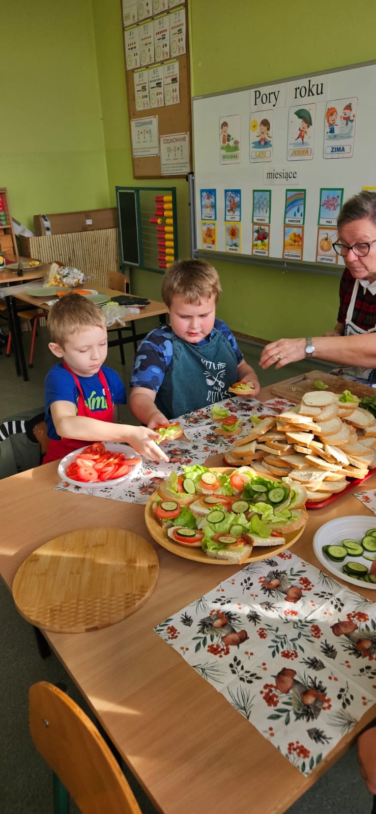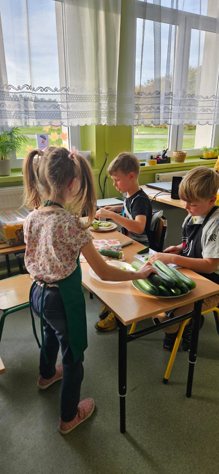 Przed przygotowaniem posiłków i przekąsek uczniowie zadbali o higienę rąk oraz o to, aby owoce i warzywa były umyte. Przedszkolaki pod opieką p. Joanny Czartek i p. Lidii Spych przygotowały kolorowe owocowe szaszłyki. Uczniowie z klasy II i III z pomocą p. Iwony Brudnickiej i p. Marzanny Wszendybył przygotowali smaczne kanapki. Trzecioklasiści pod okiem p. Katarzyny Rutkowskiej przygotowali zdrowe przekąski, frytki z ogórków i marchewek. Wszyscy byli zaangażowani w wykonanie zadań i każdy mógł się wykazać umiejętnościami kulinarnymi.