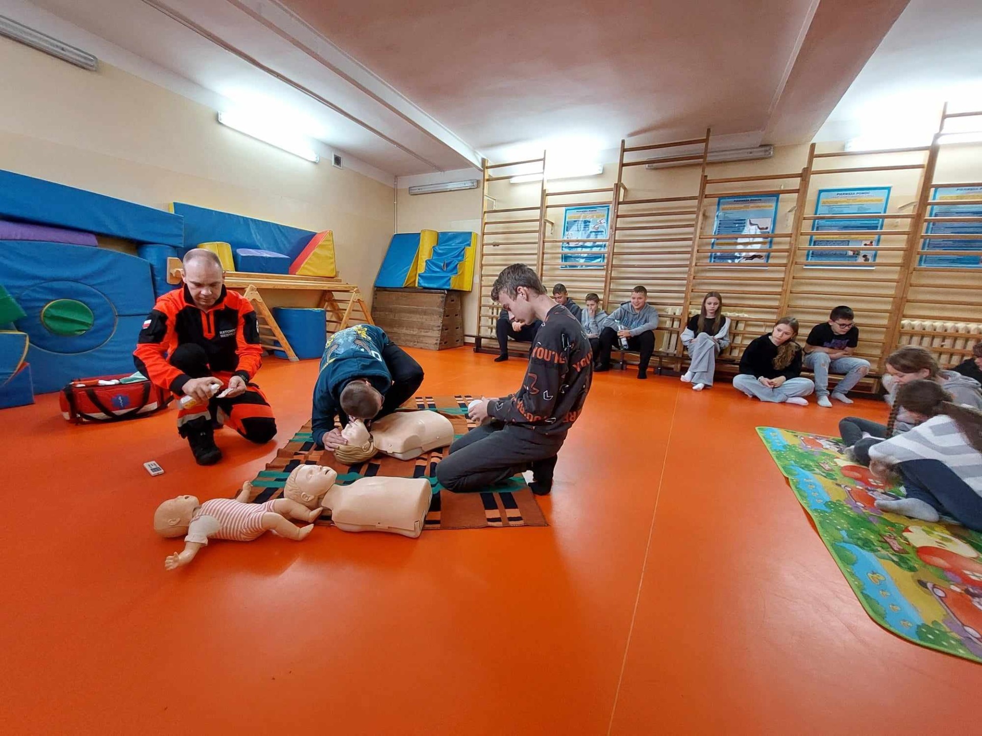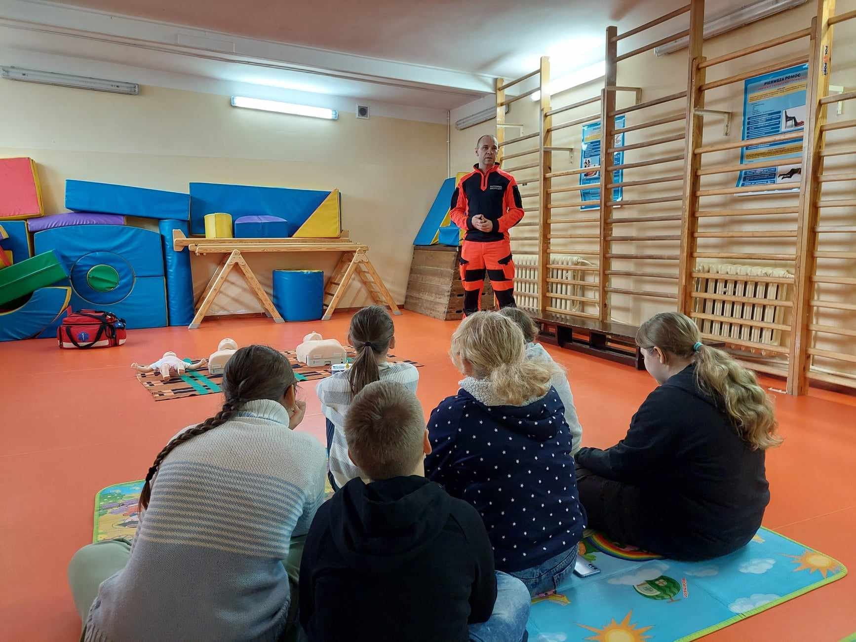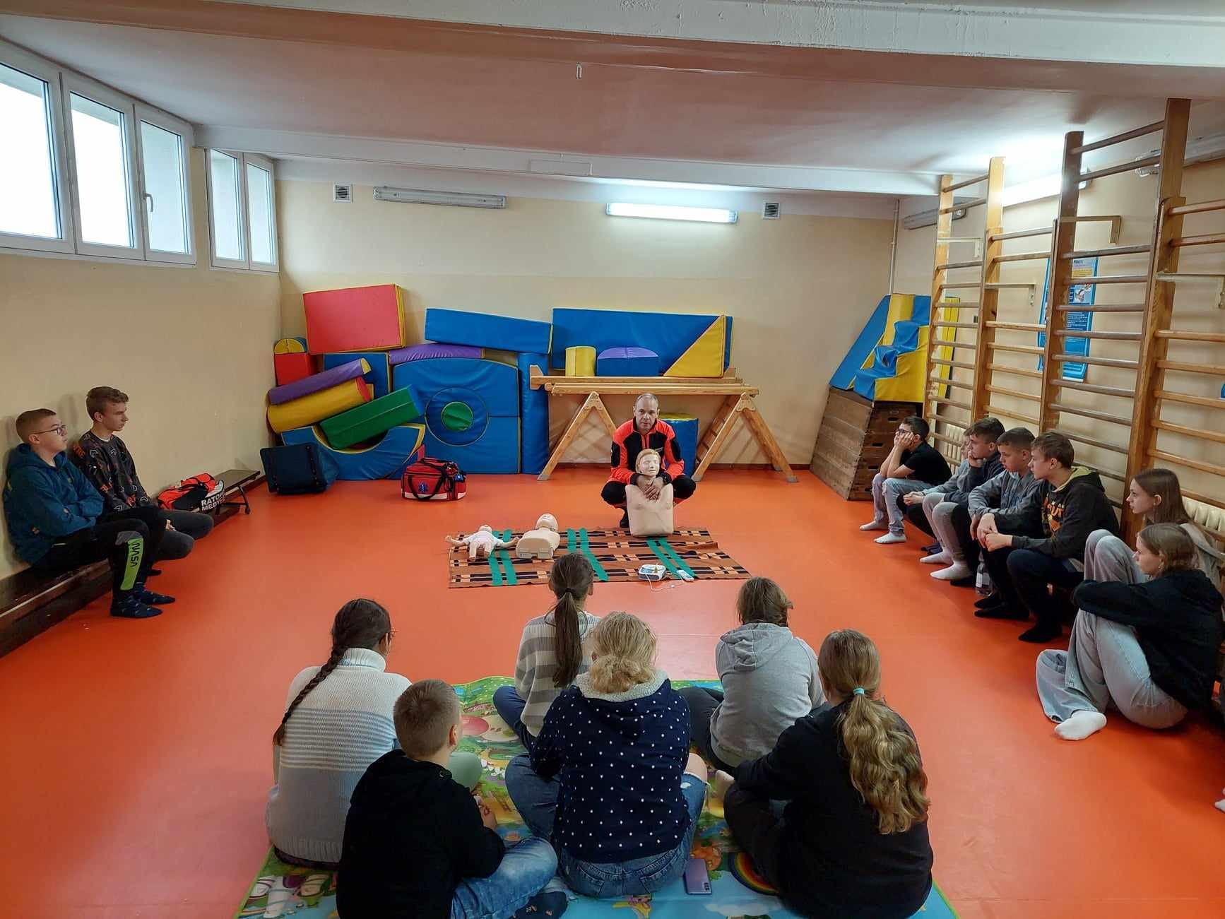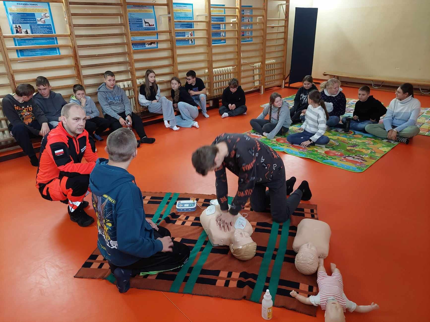 Uczniowie naszej szkoły w czasie szkolenia, które odbyło się 29 października 2024 r. poznali zasady, jak we właściwy sposób reagować na wypadek, jak udzielać i wzywać pomoc. Szkolenie z zakresu udzielania pierwszej pomocy przedmedycznej przeprowadził p. Radosław Rossa, ratownik medyczny i zarazem druh OSP w Trzęśniewie. Spotkanie odbyło się w dwóch grupach wiekowych, klasy 0–V i klasy VI-VIII, obejmowało część teoretyczną oraz praktyczną. W czasie szkolenia uczniowie mieli okazję poćwiczyć na fantomie, jak sprawdzić przytomność osoby poszkodowanej oraz wzywanie pomocy. Dowiedzieli się o niebezpiecznych sytuacjach i zachowaniach w otoczeniu i w życiu codziennym.
