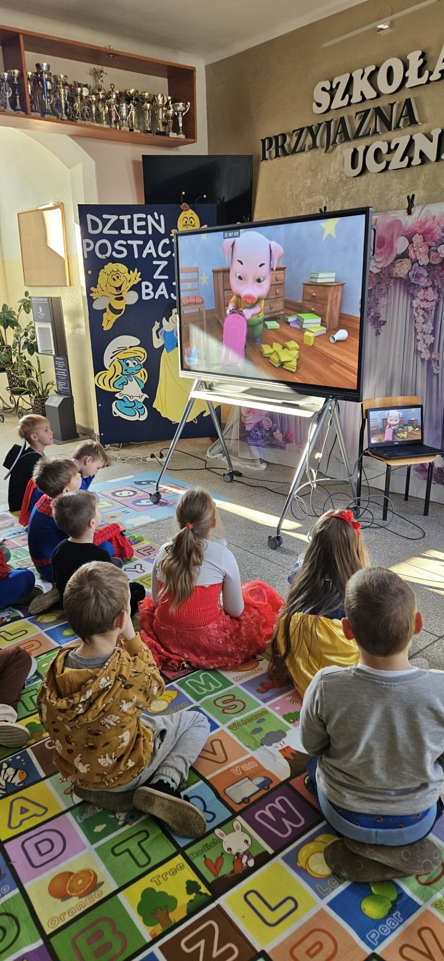 Międzynarodowy Dzień Postaci z Bajek obchodzony jest na całym świecie 5 listopada w rocznicę urodzin Walta Disneya. Ten dzień jest okazją, aby przypomnieć sobie ulubionych bajkowych bohaterów i zachęcić wszystkich do czytania bajek, które rozwijają wyobraźnię, bawią, uczą i pomagają poznać prawdę o świecie. Z okazji obchodów tego dnia w naszej szkole zrobiło się bajecznie i kolorowo. Na szkolnym korytarzu mogliśmy zobaczyć księżniczki, rycerzy, wróżki, Spider –Mena i wielu innych bohaterów z literatury dziecięcej. Nasi uczniowie wykazali się ogromną kreatywnością w przygotowaniu strojów. Pani dyrektor Katarzyna Czartek przeczytała dzieciom bajkę ”Złotowłosa i trzy misie”. Następnie nasi uczniowie uczestniczyli w różnych quizach i konkursach. Obejrzeli bajkę „O trzech świnkach”, układali puzzle, odkrywali bajkowe memory oraz kolorowali swoich ulubionych bohaterów. Wszystkie dzieci zostały nagrodzone słodkim upominkiem. To był naprawdę radosny i bajkowy dzień.