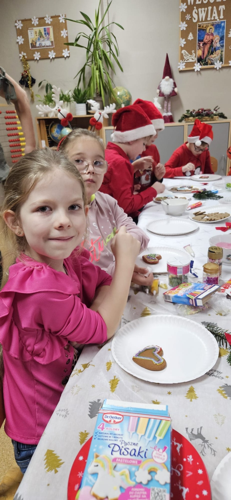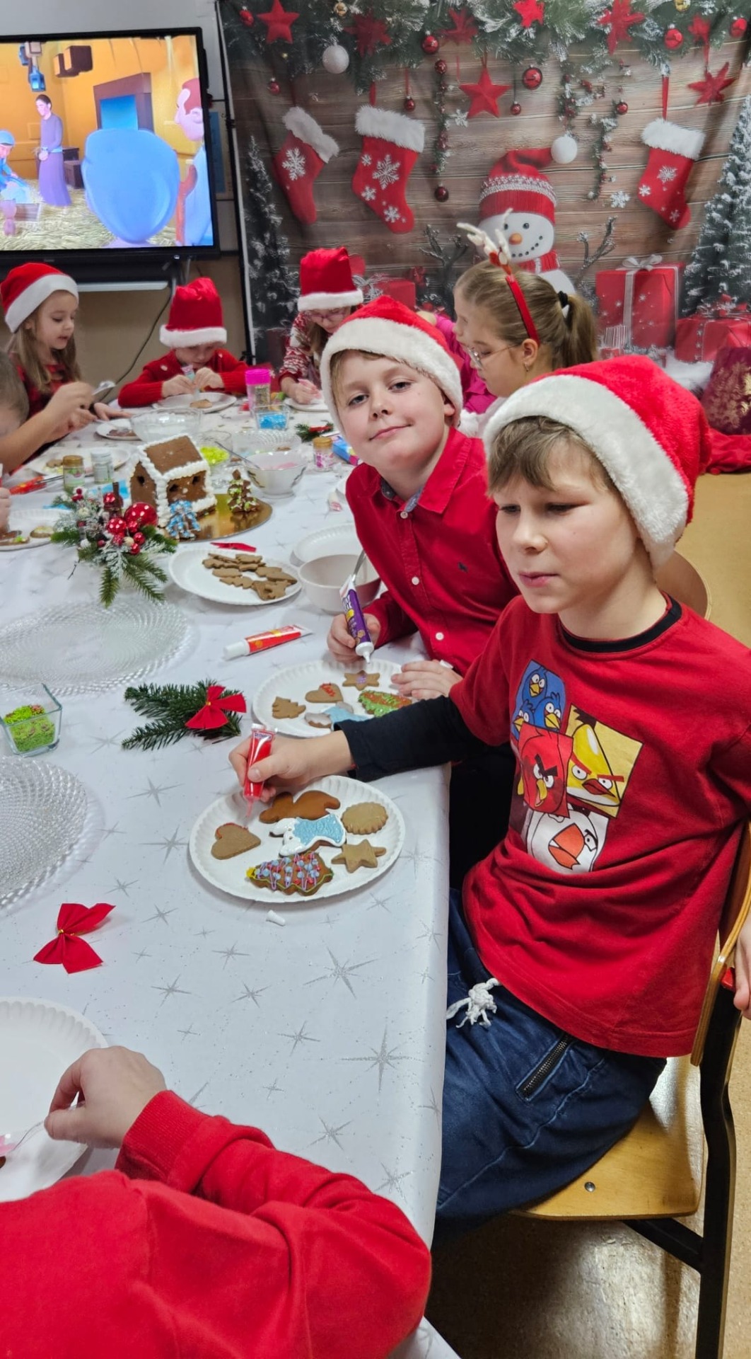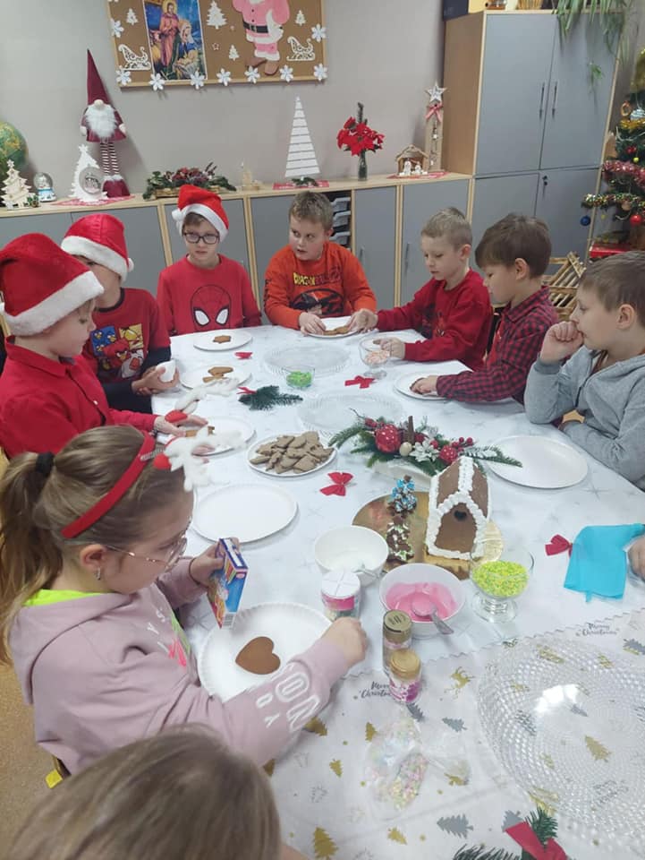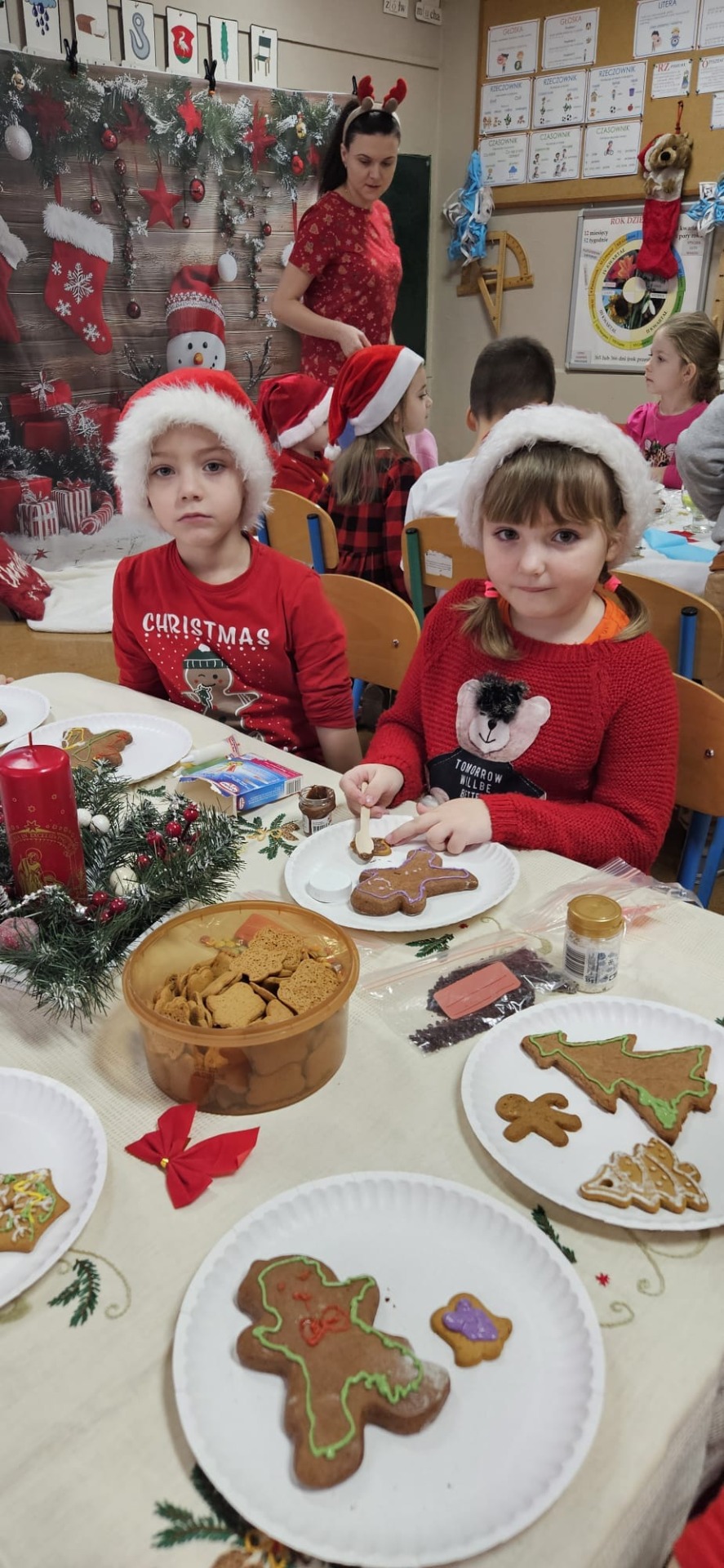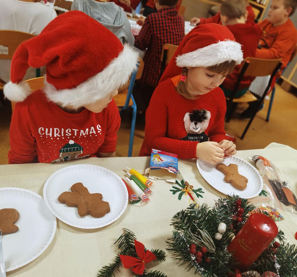 Święta tuż, tuż…Już od początku grudnia w naszej szkole uczniowie wyczuwają świąteczną atmosferę. Na korytarzu szkolnym i w każdej klasie pojawiły się przepięknie ubrane choinki oraz dekoracje świąteczne. Była wizyta Mikołaja. Przyszedł również czas na warsztaty dekorowania pierników. Dzieci z oddziału przedszkolnego i uczniowie z klas I-III nie mogły doczekać się tego dnia. Pierniki zostały wcześniej upieczone przez Mamy naszych uczniów, którym serdecznie dziękujemy. Dzieci z zapałem zabrały się do pracy. Słuchając świątecznej muzyki, dekorowały pierniczki różnokolorowymi lukrami, kolorowymi pisakami i barwnymi posypkami. Efekty pracy były przepiękne i oczywiście przepyszne. Piernikowy zawrót głowy sprawił naszym uczniom wiele radości i satysfakcji.