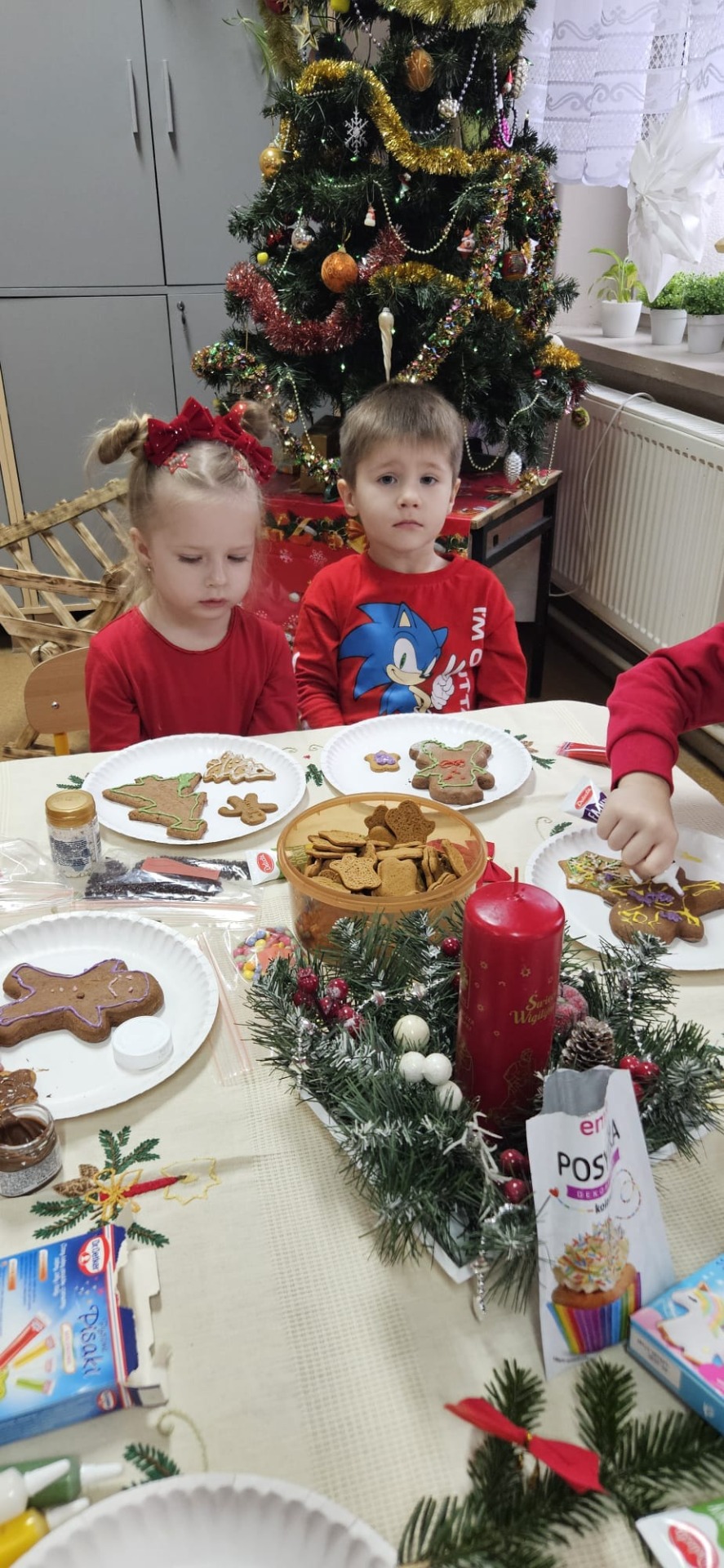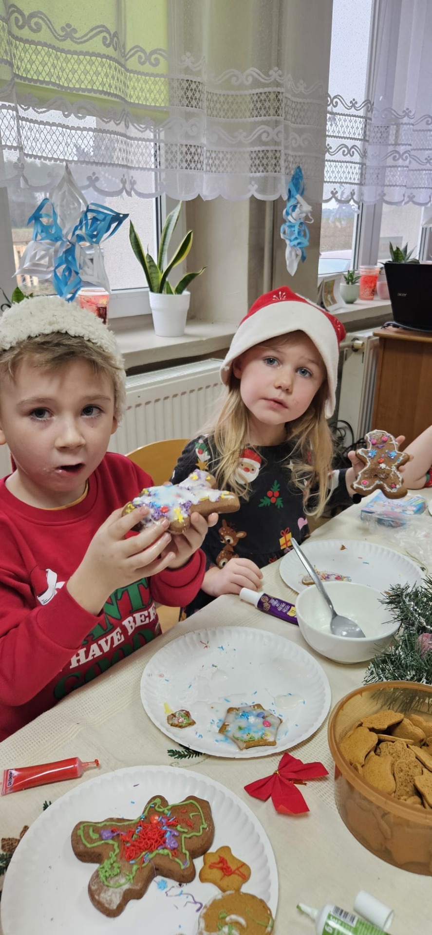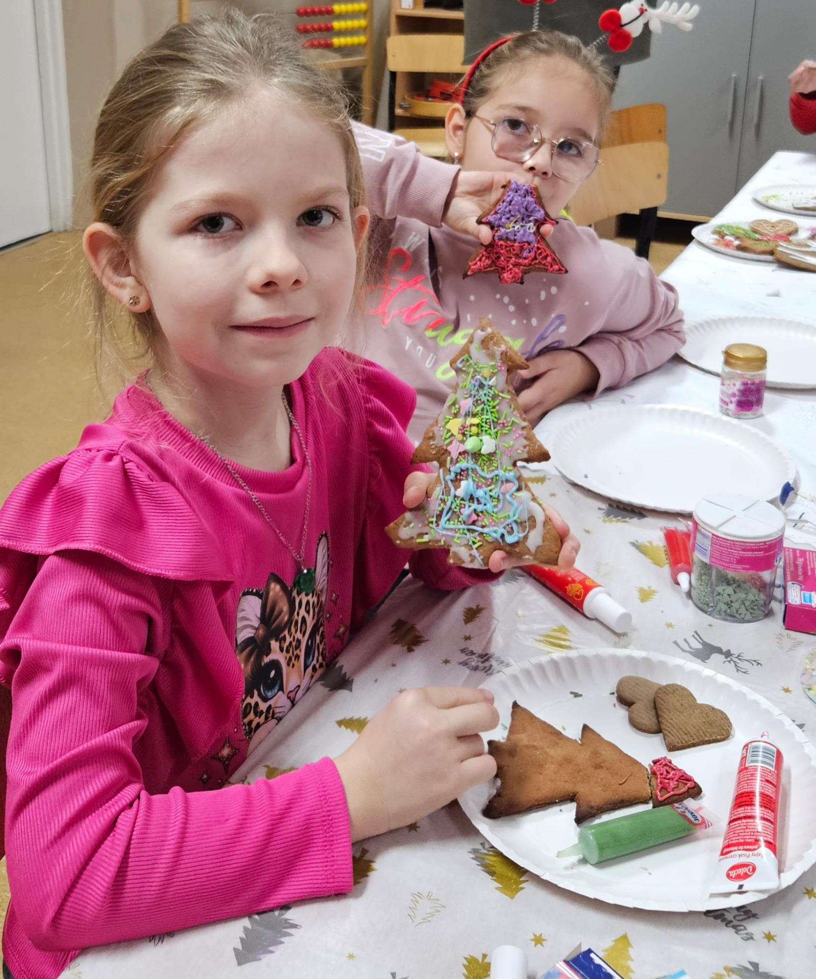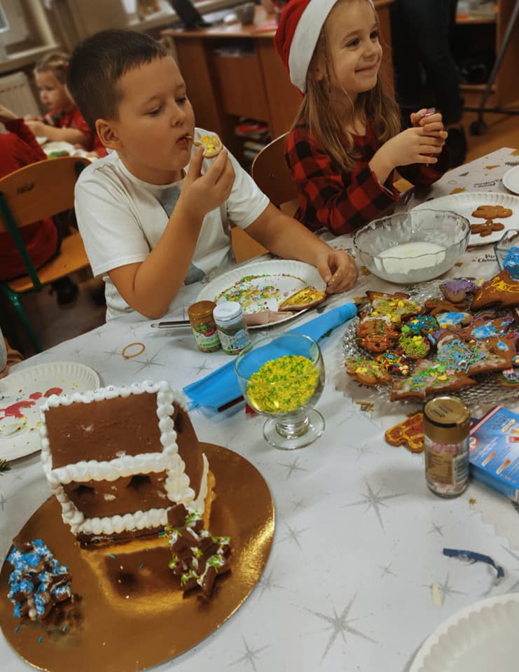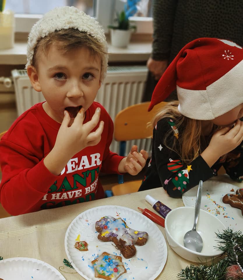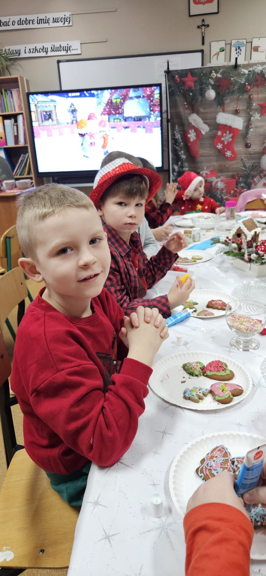 Święta tuż, tuż…Już od początku grudnia w naszej szkole uczniowie wyczuwają świąteczną atmosferę. Na korytarzu szkolnym i w każdej klasie pojawiły się przepięknie ubrane choinki oraz dekoracje świąteczne. Była wizyta Mikołaja. Przyszedł również czas na warsztaty dekorowania pierników. Dzieci z oddziału przedszkolnego i uczniowie z klas I-III nie mogły doczekać się tego dnia. Pierniki zostały wcześniej upieczone przez Mamy naszych uczniów, którym serdecznie dziękujemy. Dzieci z zapałem zabrały się do pracy. Słuchając świątecznej muzyki, dekorowały pierniczki różnokolorowymi lukrami, kolorowymi pisakami i barwnymi posypkami. Efekty pracy były przepiękne i oczywiście przepyszne. Piernikowy zawrót głowy sprawił naszym uczniom wiele radości i satysfakcji.