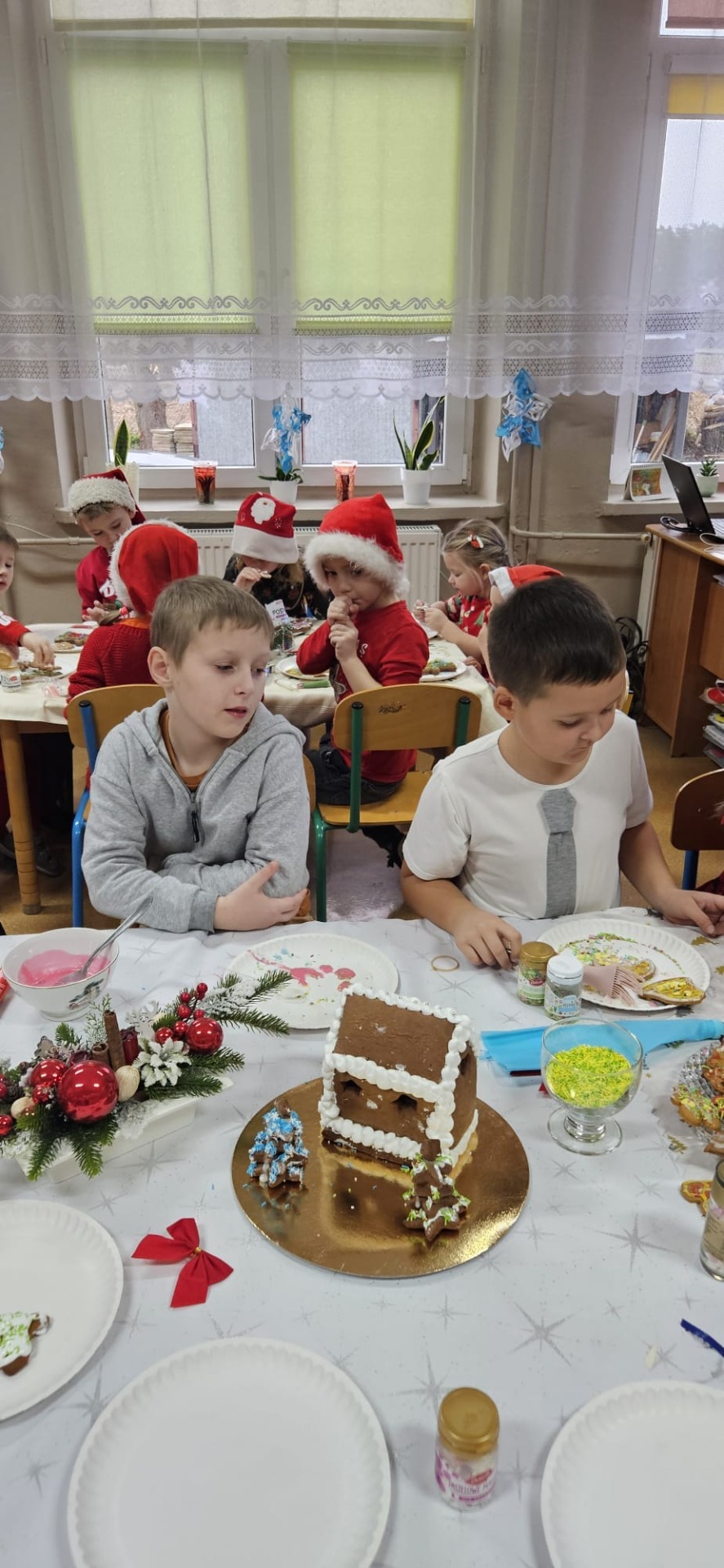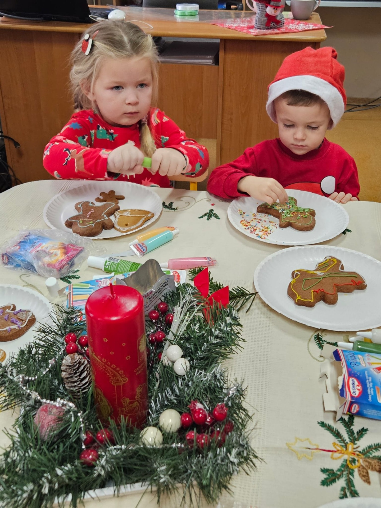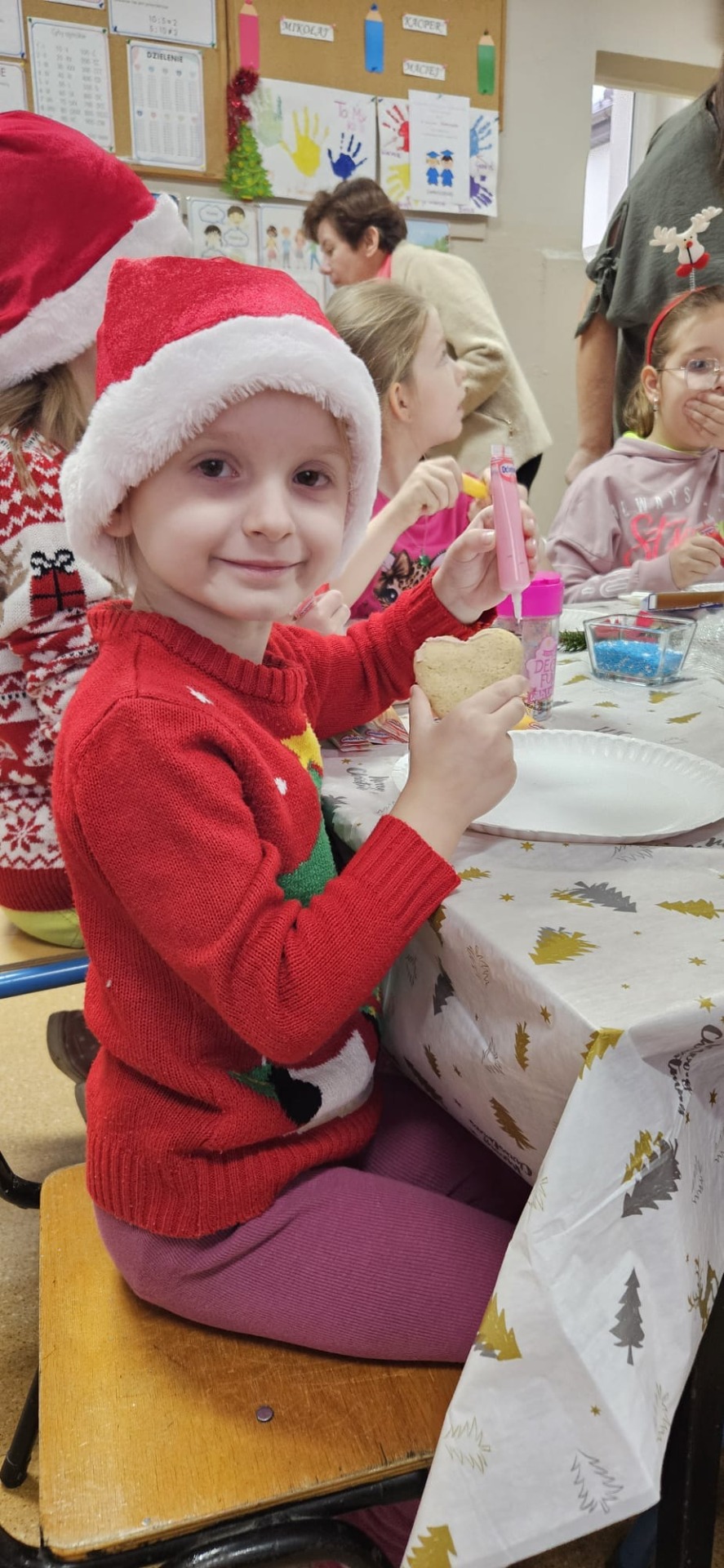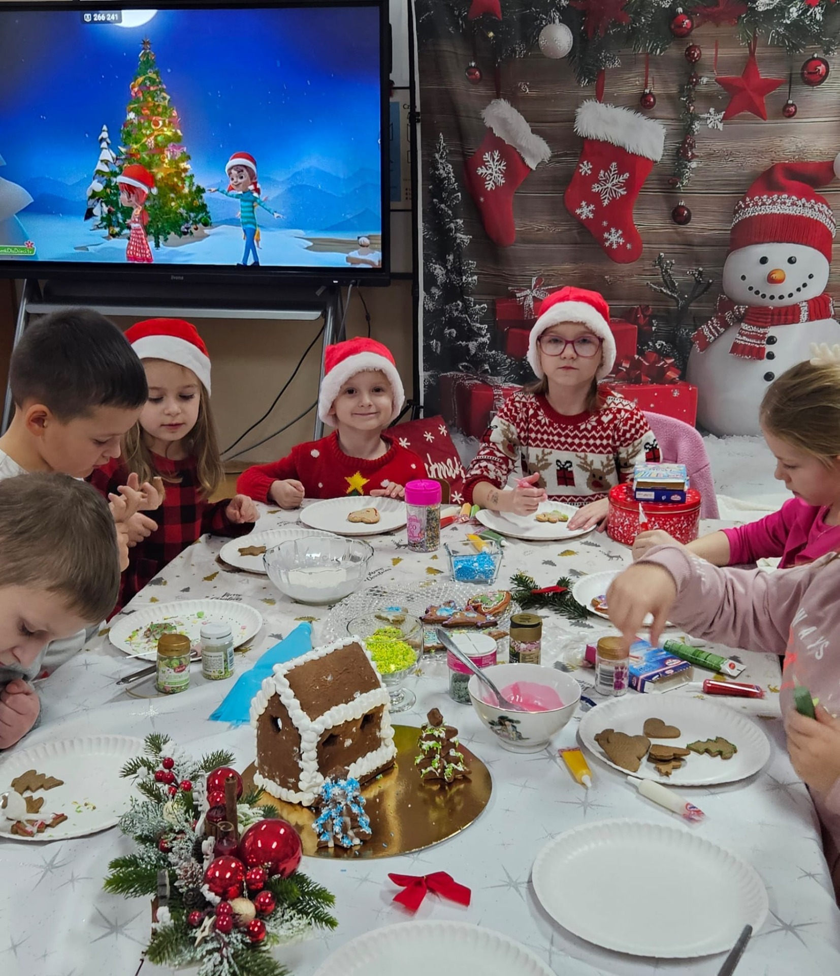 Święta tuż, tuż…Już od początku grudnia w naszej szkole uczniowie wyczuwają świąteczną atmosferę. Na korytarzu szkolnym i w każdej klasie pojawiły się przepięknie ubrane choinki oraz dekoracje świąteczne. Była wizyta Mikołaja. Przyszedł również czas na warsztaty dekorowania pierników. Dzieci z oddziału przedszkolnego i uczniowie z klas I-III nie mogły doczekać się tego dnia. Pierniki zostały wcześniej upieczone przez Mamy naszych uczniów, którym serdecznie dziękujemy. Dzieci z zapałem zabrały się do pracy. Słuchając świątecznej muzyki, dekorowały pierniczki różnokolorowymi lukrami, kolorowymi pisakami i barwnymi posypkami. Efekty pracy były przepiękne i oczywiście przepyszne. Piernikowy zawrót głowy sprawił naszym uczniom wiele radości i satysfakcji.