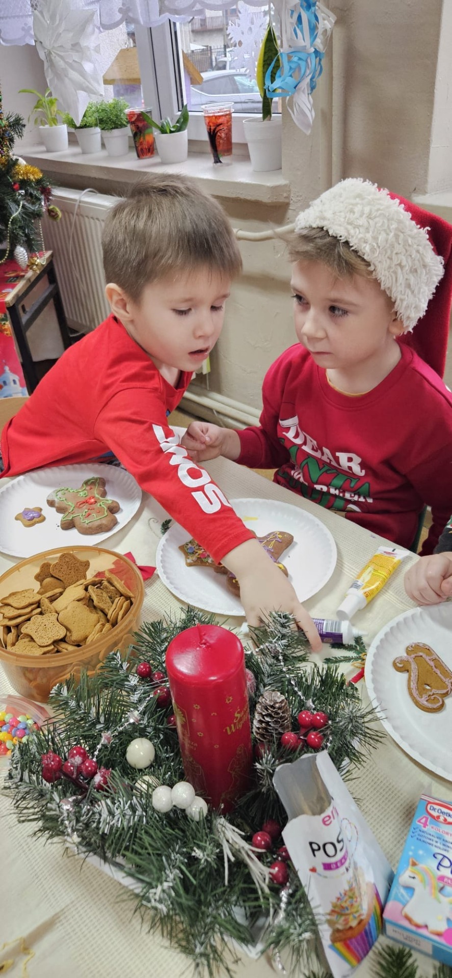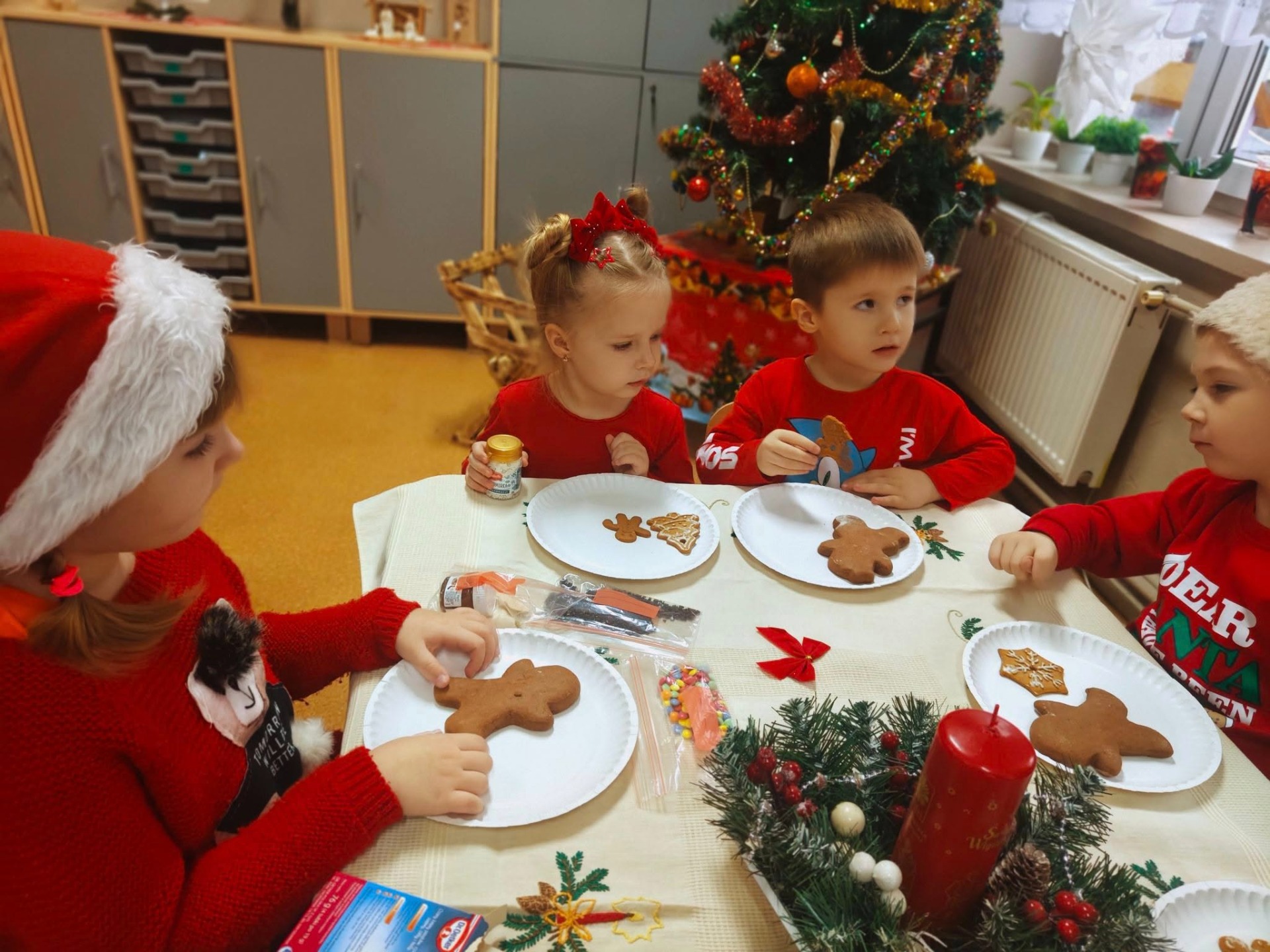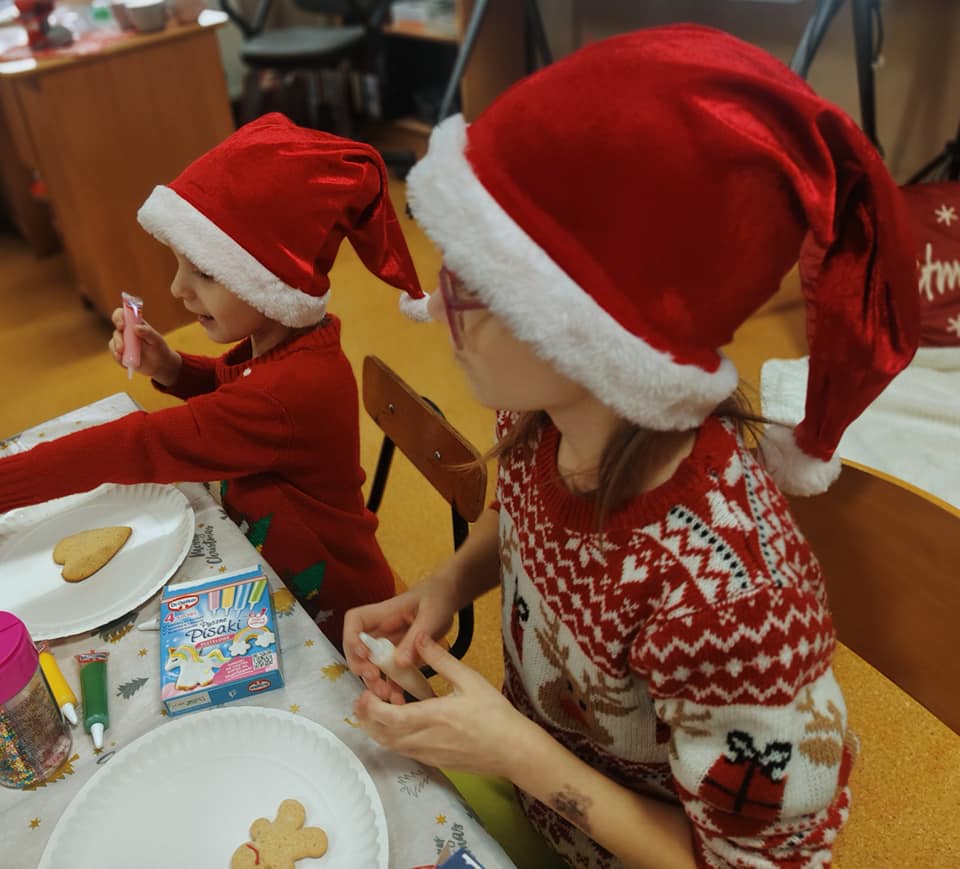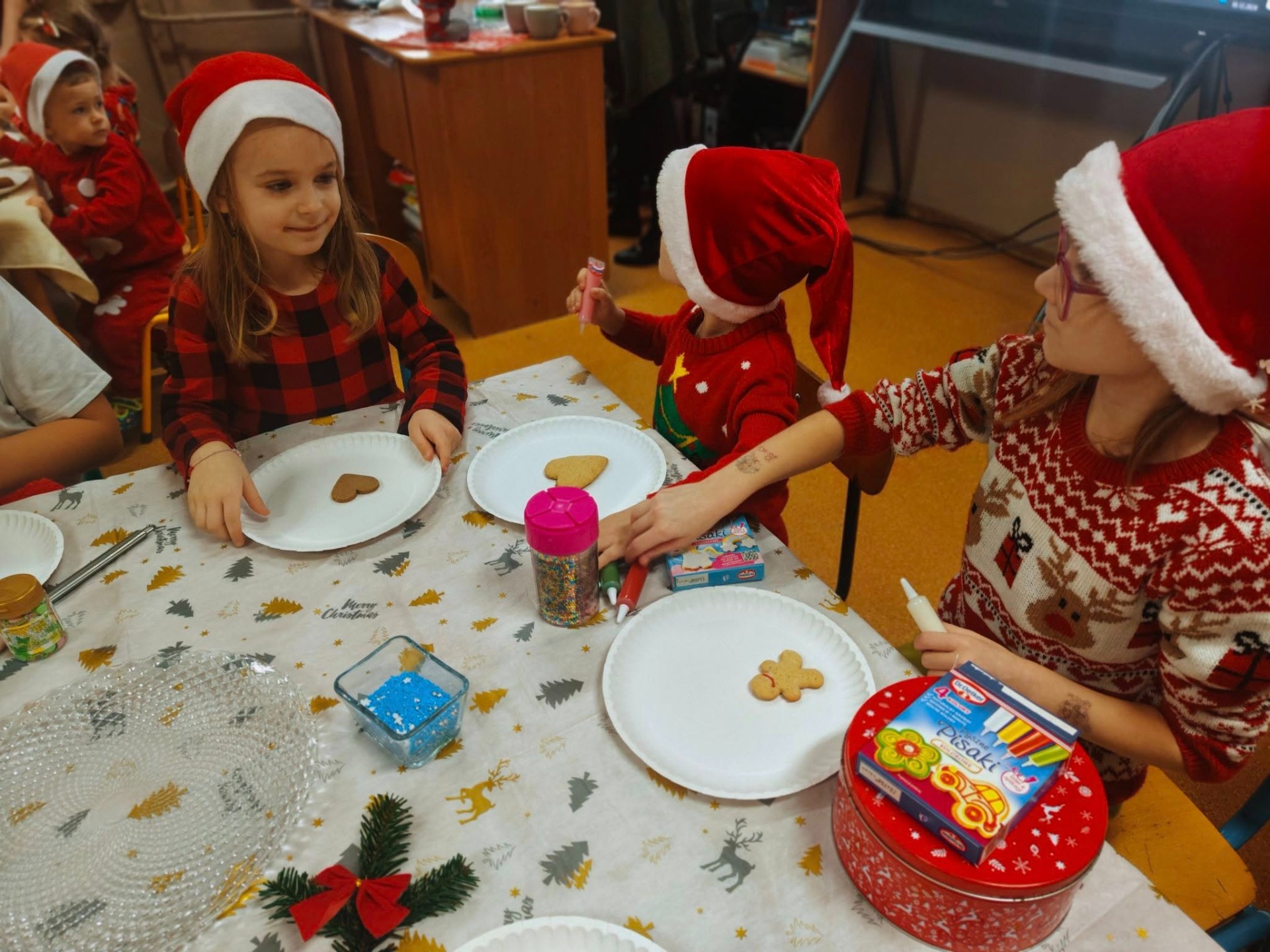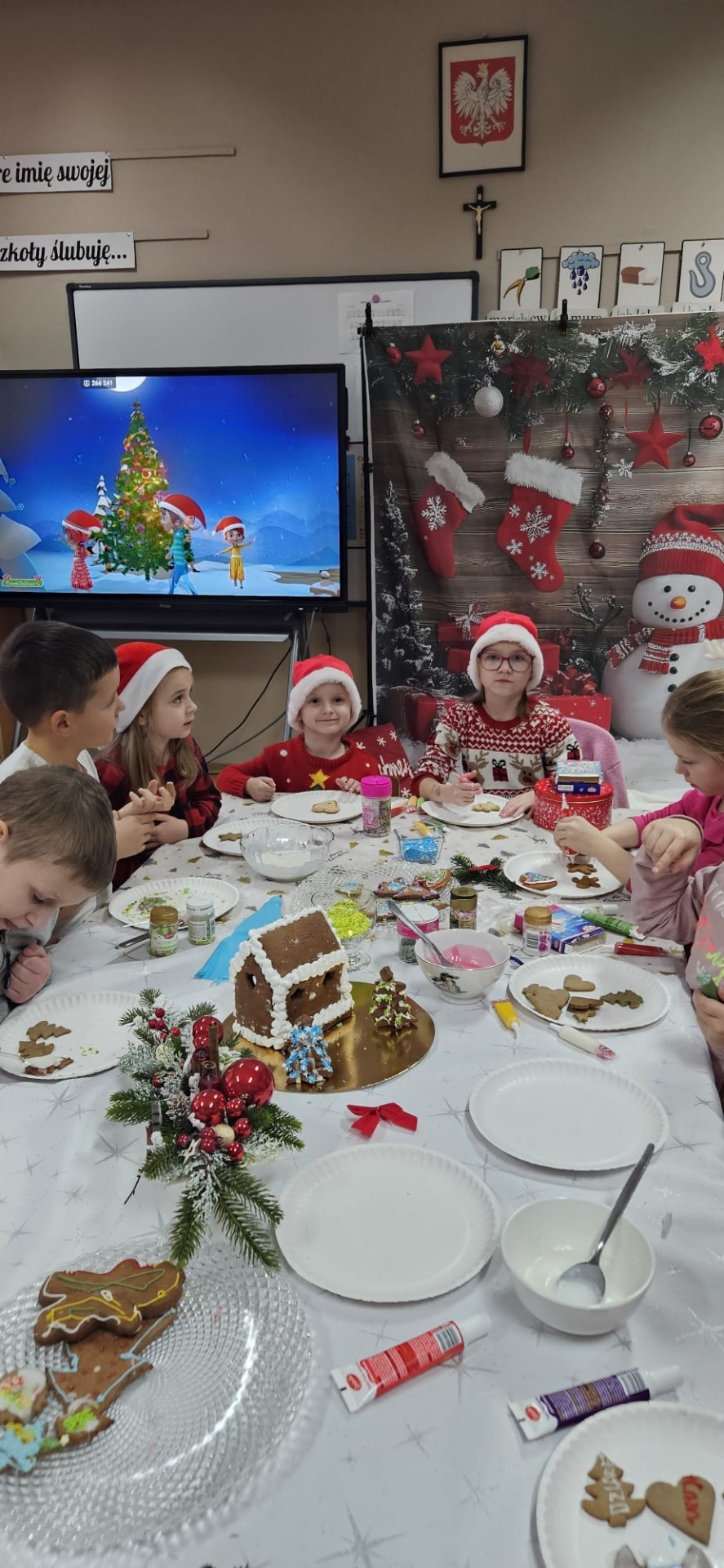 Święta tuż, tuż…Już od początku grudnia w naszej szkole uczniowie wyczuwają świąteczną atmosferę. Na korytarzu szkolnym i w każdej klasie pojawiły się przepięknie ubrane choinki oraz dekoracje świąteczne. Była wizyta Mikołaja. Przyszedł również czas na warsztaty dekorowania pierników. Dzieci z oddziału przedszkolnego i uczniowie z klas I-III nie mogły doczekać się tego dnia. Pierniki zostały wcześniej upieczone przez Mamy naszych uczniów, którym serdecznie dziękujemy. Dzieci z zapałem zabrały się do pracy. Słuchając świątecznej muzyki, dekorowały pierniczki różnokolorowymi lukrami, kolorowymi pisakami i barwnymi posypkami. Efekty pracy były przepiękne i oczywiście przepyszne. Piernikowy zawrót głowy sprawił naszym uczniom wiele radości i satysfakcji.